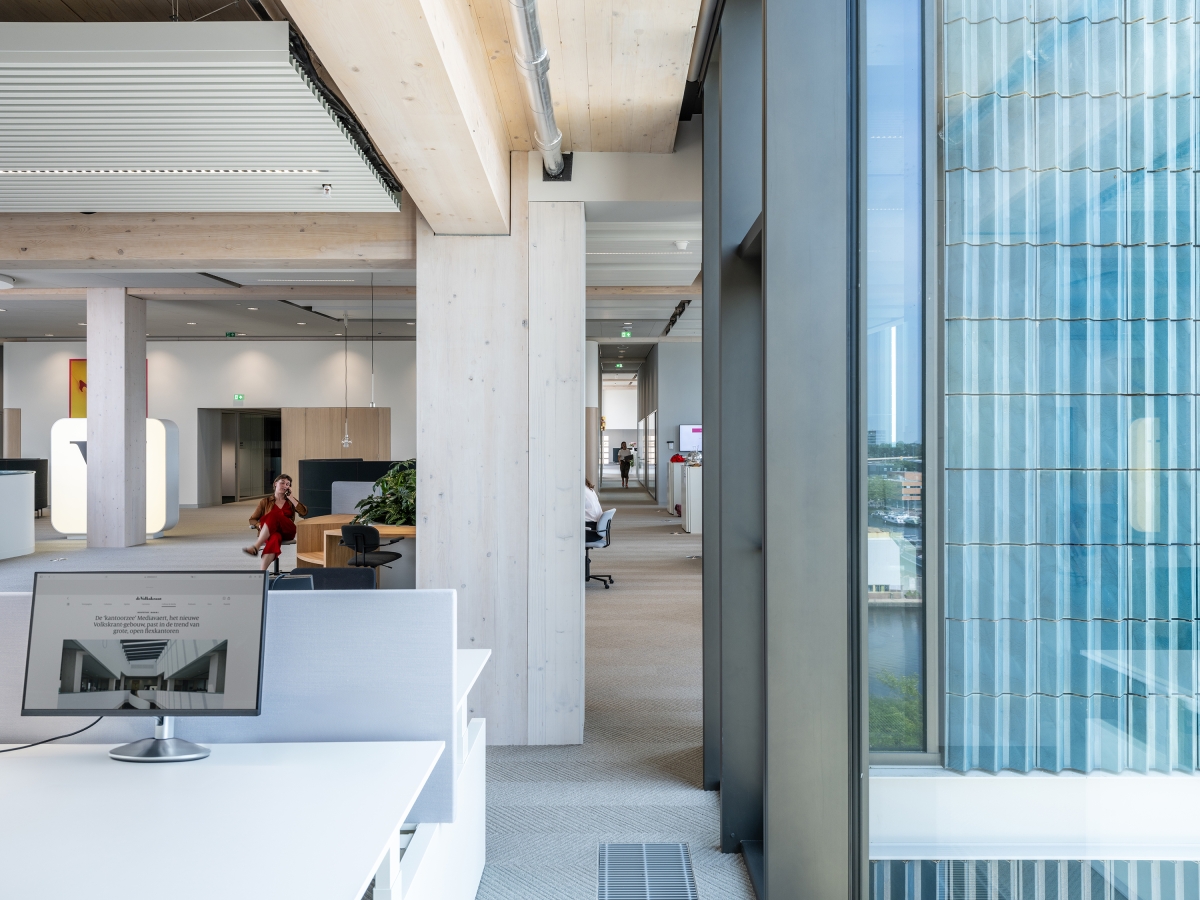 DPG Mediavaert in Amsterdam-Duivendrecht is a brand new innovative media hub. It is the home base for various editorial offices and recording studios for major Dutch newspapers, magazines and radio shows including de Volkskrant, Trouw, Parool, Qmusic, Joe and NU.nl. Mediavaert stands out due to its undulating contours, surprising views, human scale and organic warm design. With a size of 46,000 m2, the building is one of the largest timber hybrid offices in Europe.