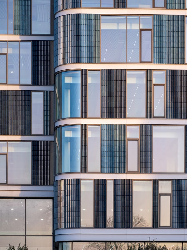 Three connected building elements sit on a continuous base of green roof terraces. The ceramic panels wrapping the façade are locally produced. These turquoise-tinted tiles of varying relief patterns shimmer modestly, giving the building a distinct character. The soft building contours, tinted ceramics and green terraces introduce a new, post-industrial language to the raw context of the area.