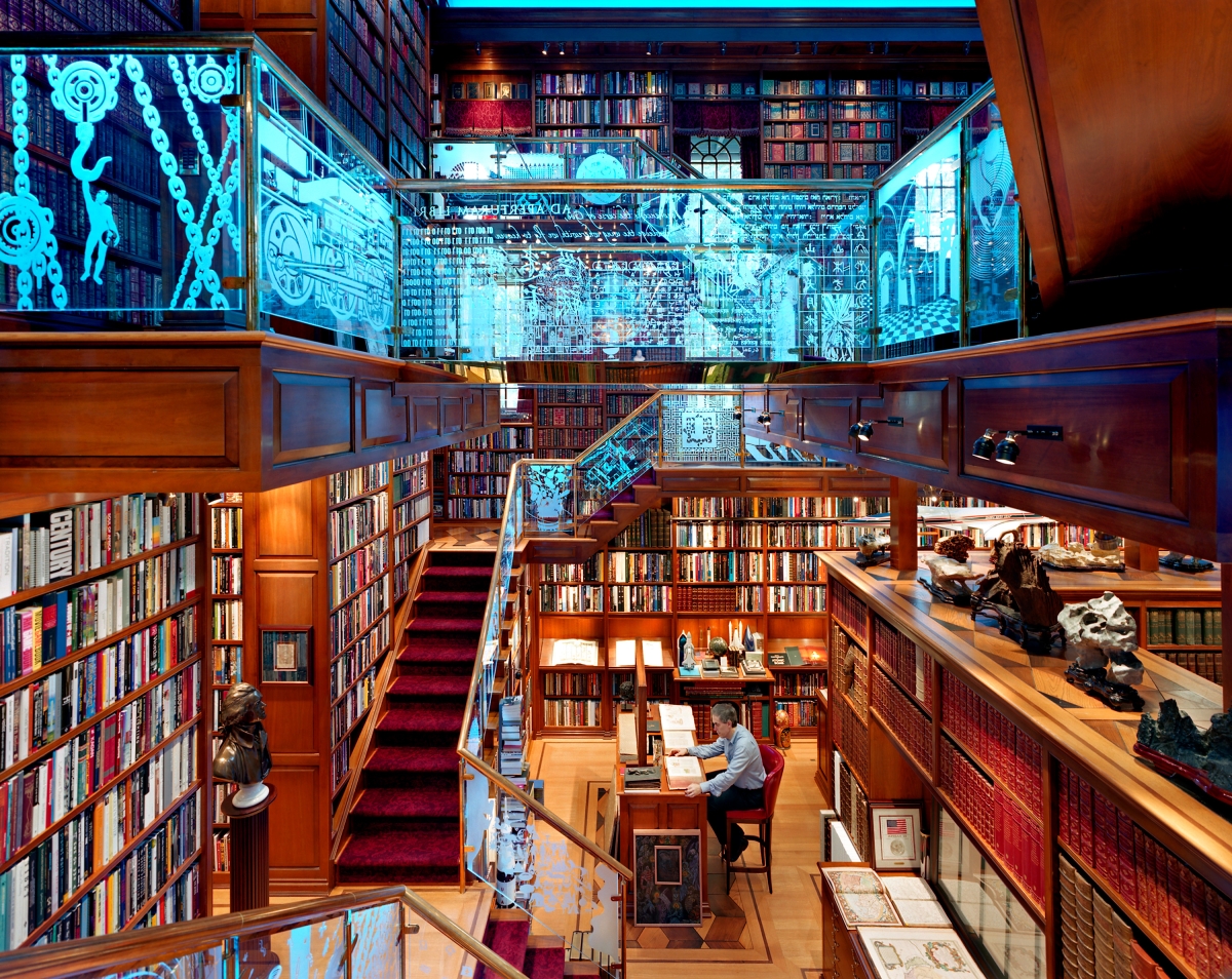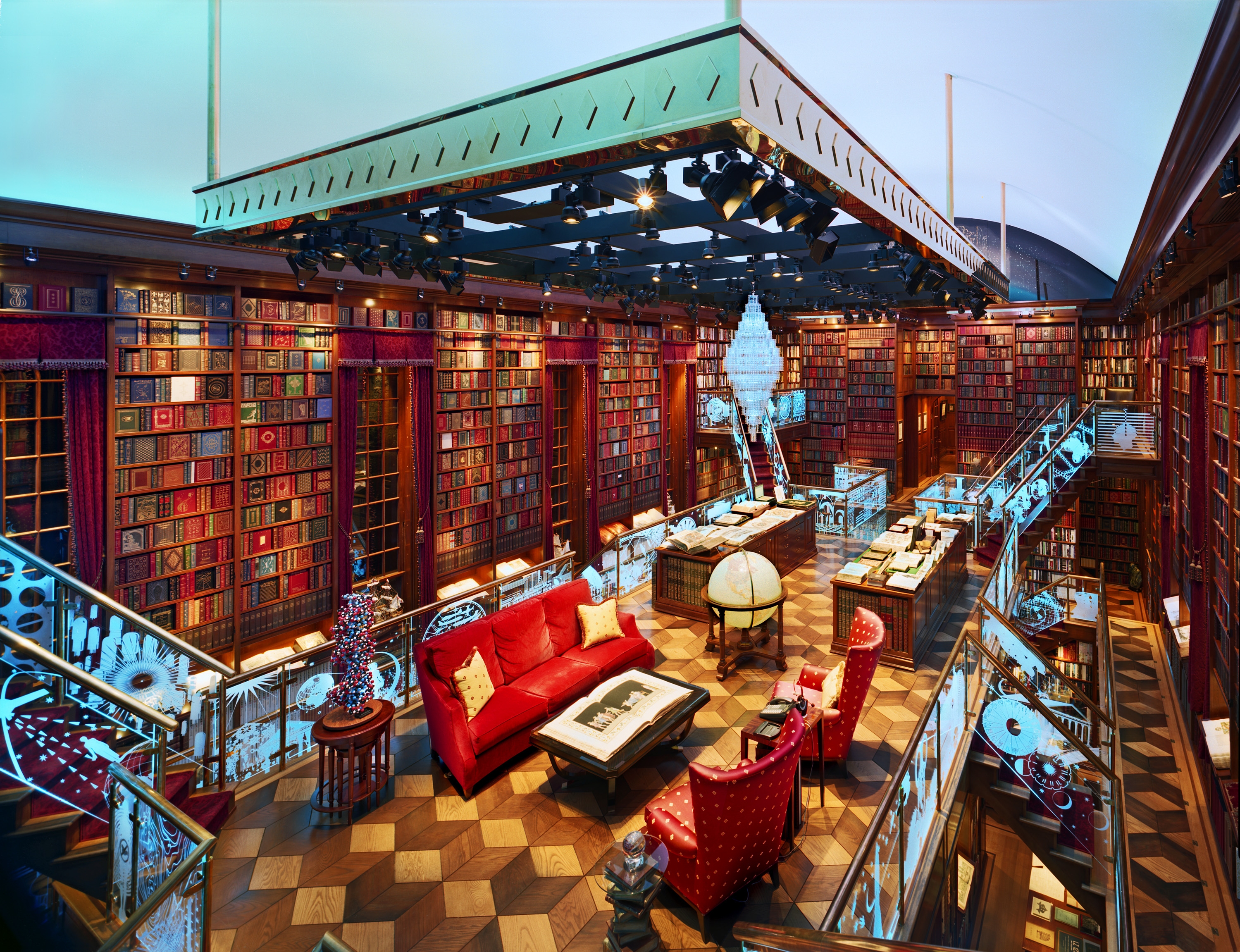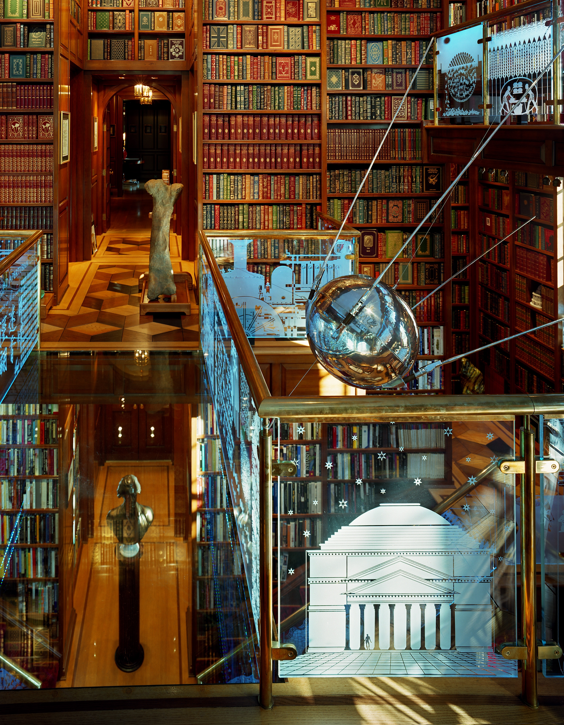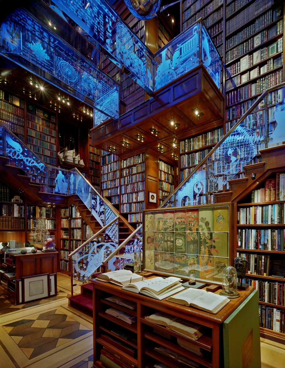 This 3,500 square foot, three story space is a celebration of human invention. The library contains an extensive collection of more than 30,000 books and museum-caliber manuscripts, maps and artifacts such as dinosaur bones, an ancient bible collection and an original Sputnik Satellite. Designed to embody the human imagination and inner workings of the owner’s brain, this space is marked by M.C. Escher inspired staircases and bridges lined with etched glass panels that are illuminated by color changing fiber optics from under the handrails.