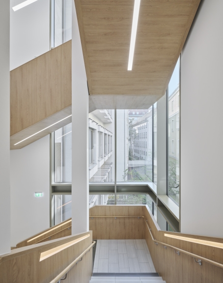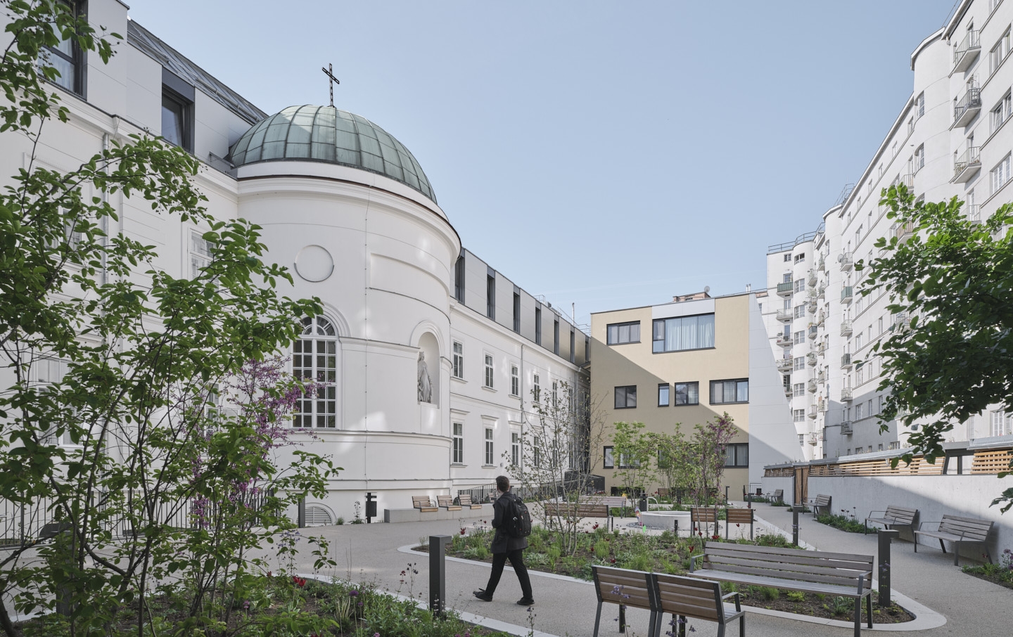 The project was completed in 2022 and is a prime example of inner-city redensification and social sustainability. The building complex combines a wide variety of functions on 30,000 square meters: a hospital, a nursing home and a convent. The architects were faced with the challenge of not only a complex program but also treating this historic building as a monument and also making it "fit for generations".