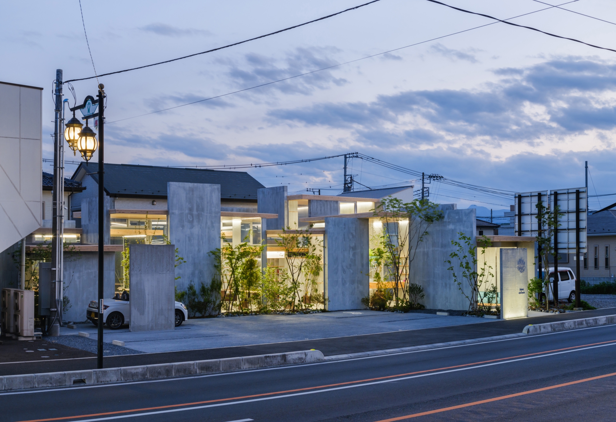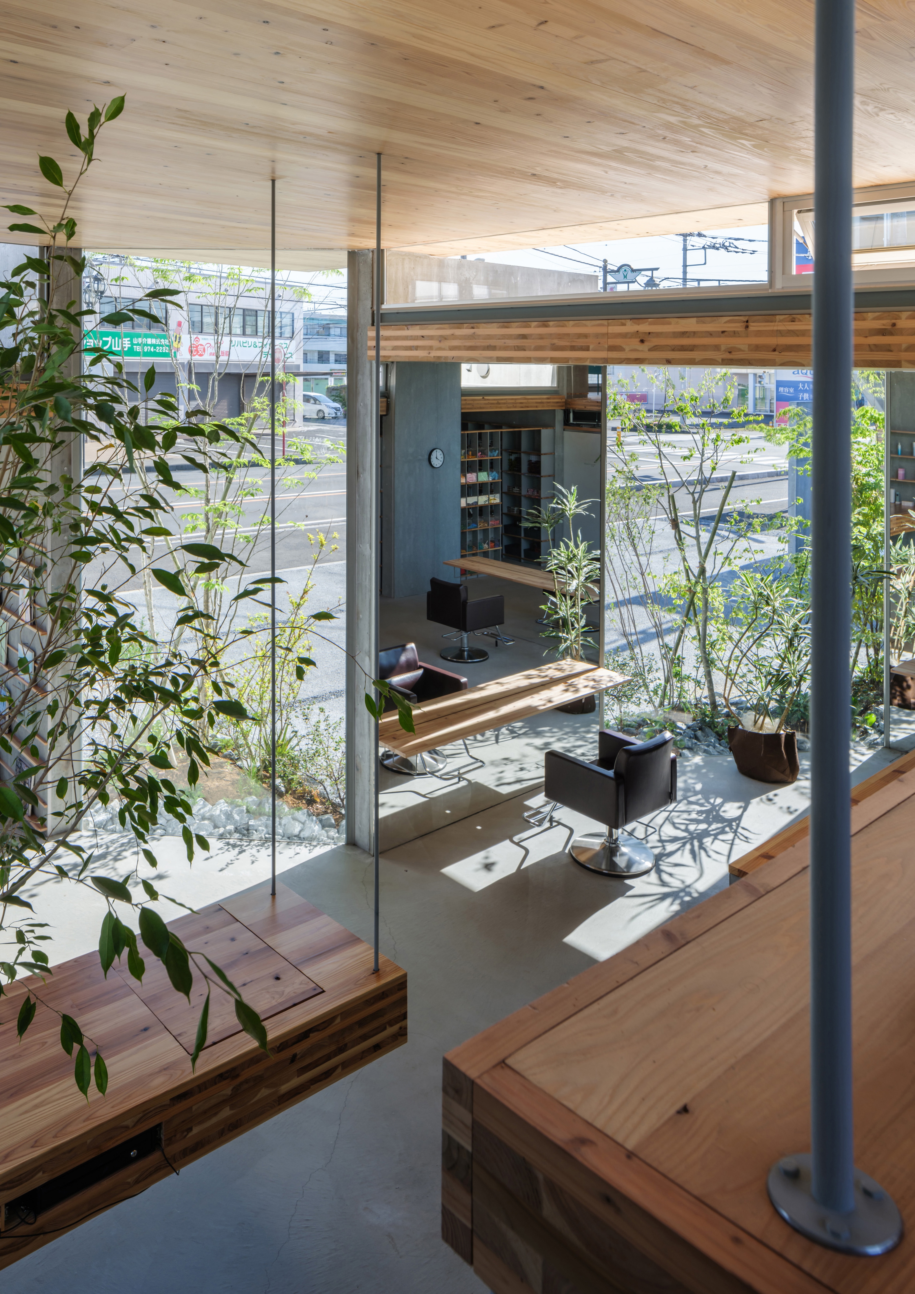 This is the hair salon located on a roadside in rural area famous for wood resources, which needed to be rebuilt due to land readjustment. Against the standardization of the city landscape, we created walls and roofs consisting of small active elements (mirrors, wooden counters) in the cutting space of hair salon. On top of that, the scenery of the past and present, greenery, CLT made from local woods and things were overlaped in multiple layers through the reflection of mirrors. We created the natural architecture regardless of design or use that visualizes the charm of city and hair salon.