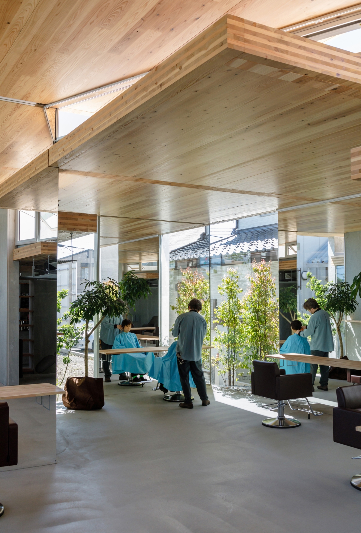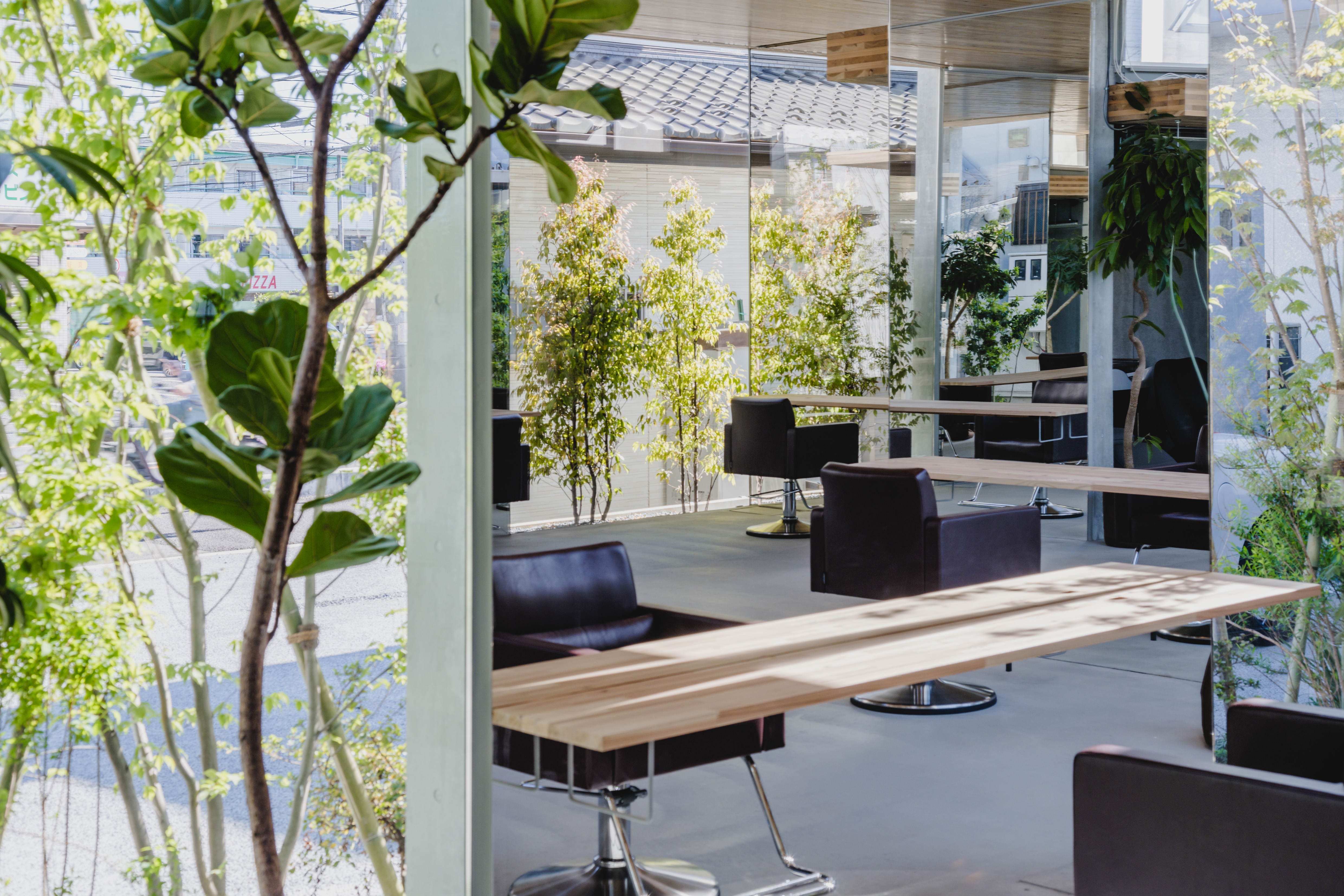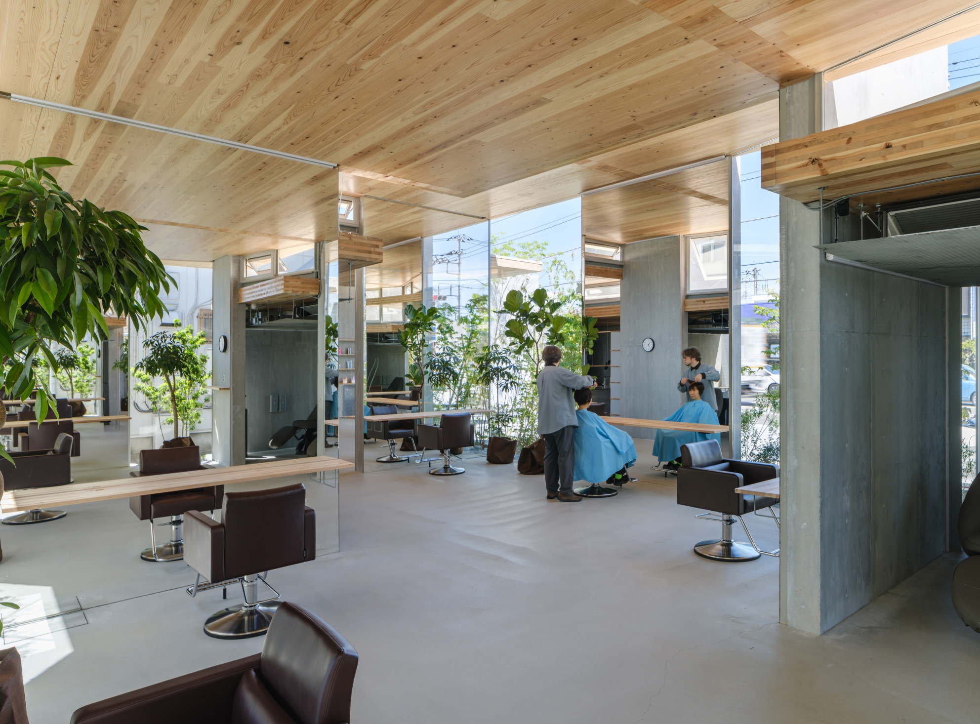 We staggered cutting spaces with big mirror(RC wall) and counter(CLT roof) that exceeds human scale. RC walls are structurally self-supporting against out-of-plane loads and CLT roofs create long-span ceilings without beams, reducing the weight and suppressing the heat load. The combined structure can be attached by simple and highly versatile construction method same as furniture. The mirror changes from one reflects a person's appearance to one reflects oneself in the scenery. The small elements in the hair salon create a natural architecture in which things are multi-layered by reflection.