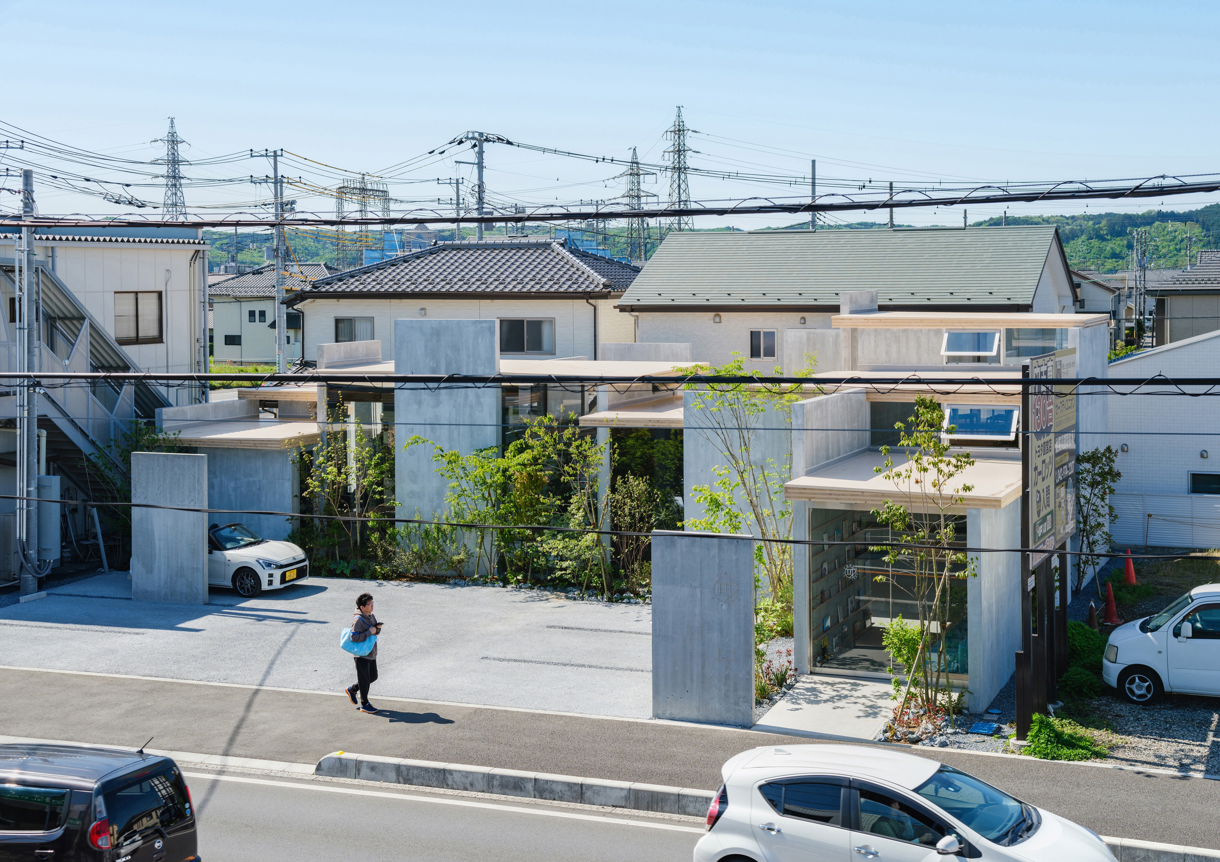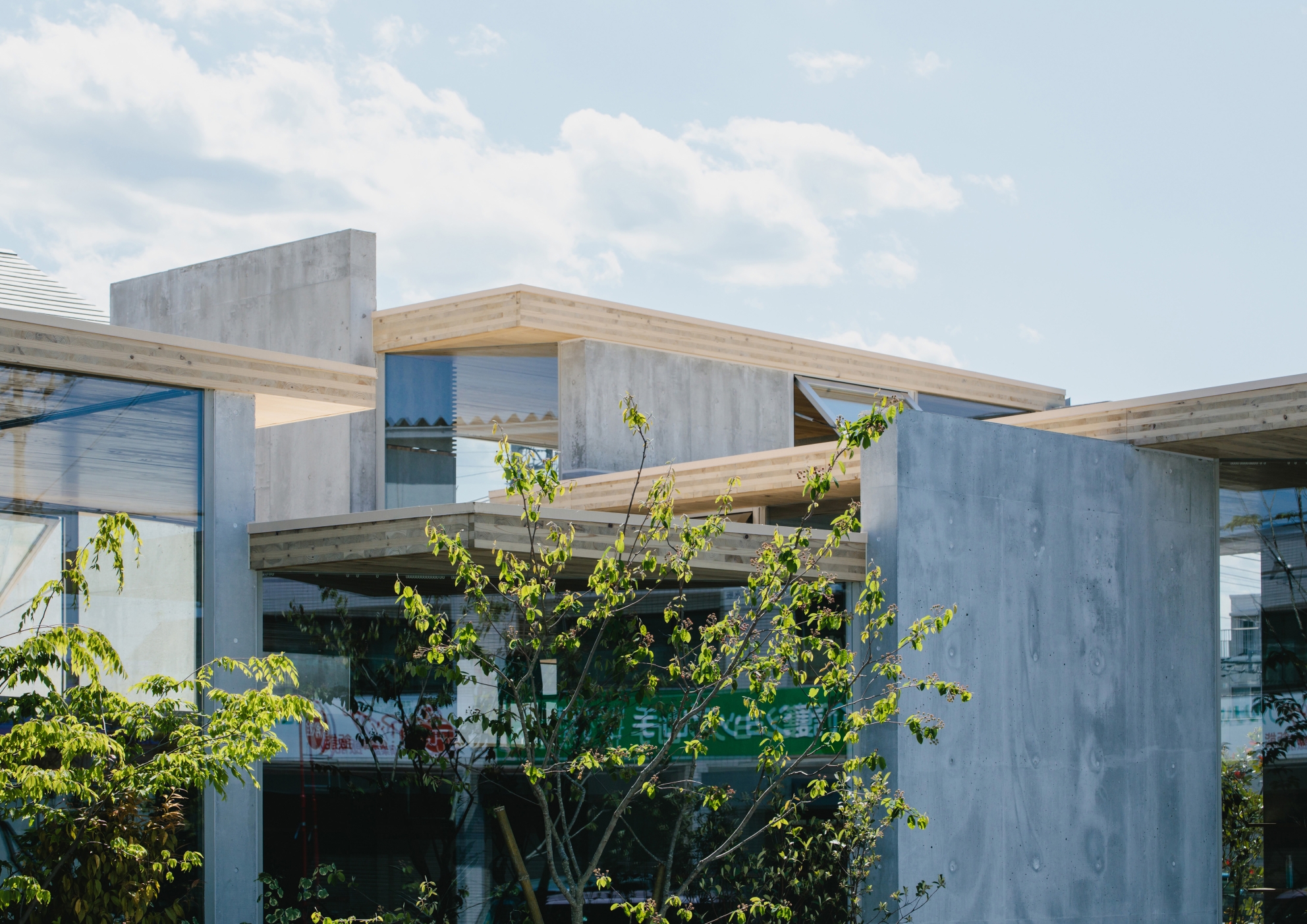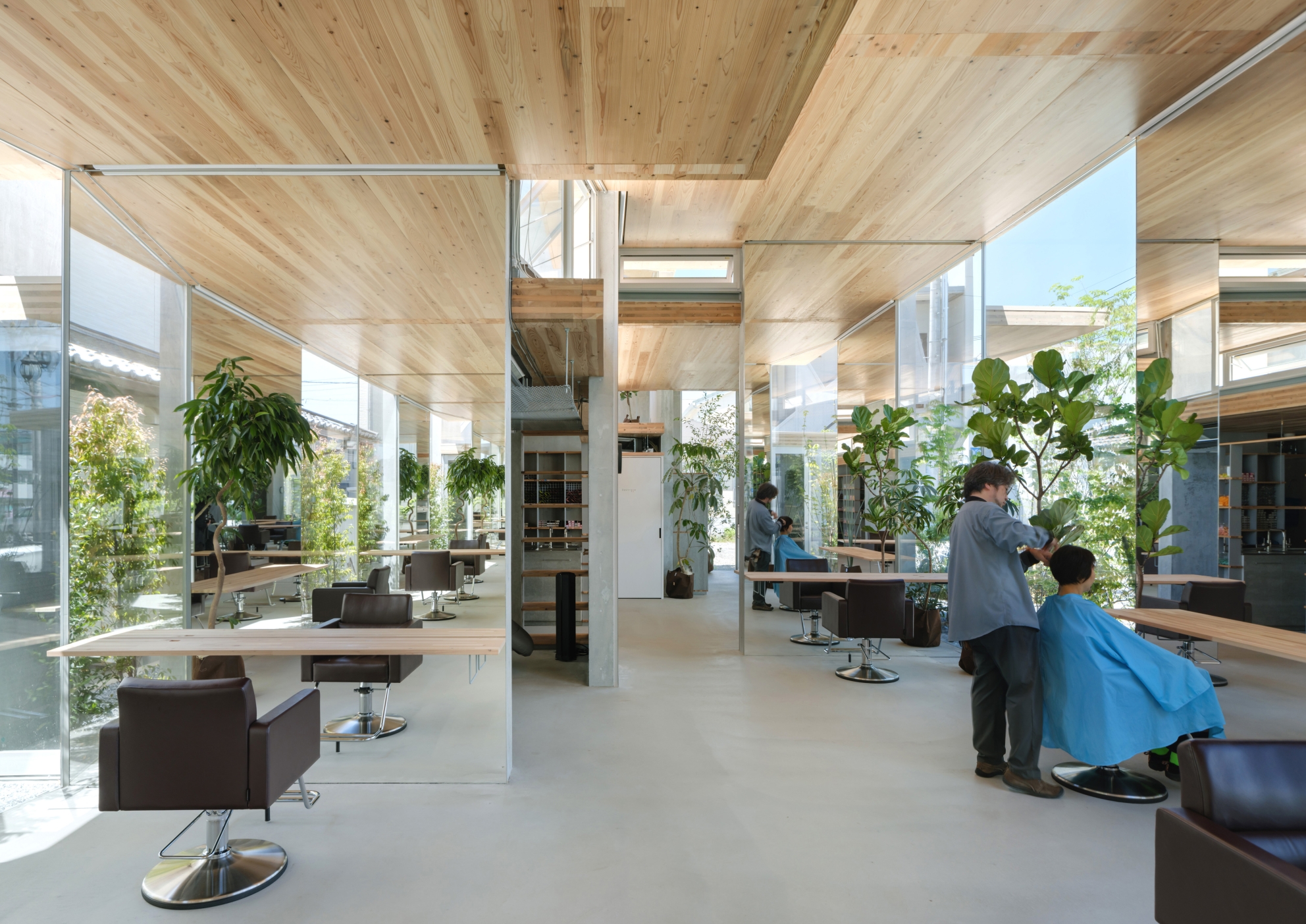 We staggered cutting spaces with big mirror(RC wall) and counter(CLT roof) that exceeds human scale. RC walls are structurally self-supporting against out-of-plane loads and CLT roofs create long-span ceilings without beams, reducing the weight and suppressing the heat load. The combined structure can be attached by simple and highly versatile construction method same as furniture. The mirror changes from one reflects a person's appearance to one reflects oneself in the scenery. The small elements in the hair salon create a natural architecture in which things are multi-layered by reflection.