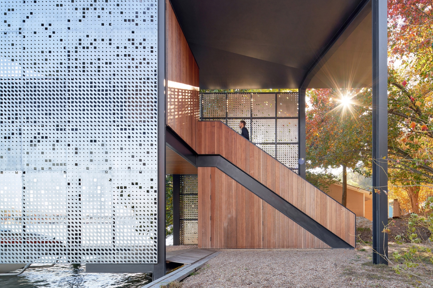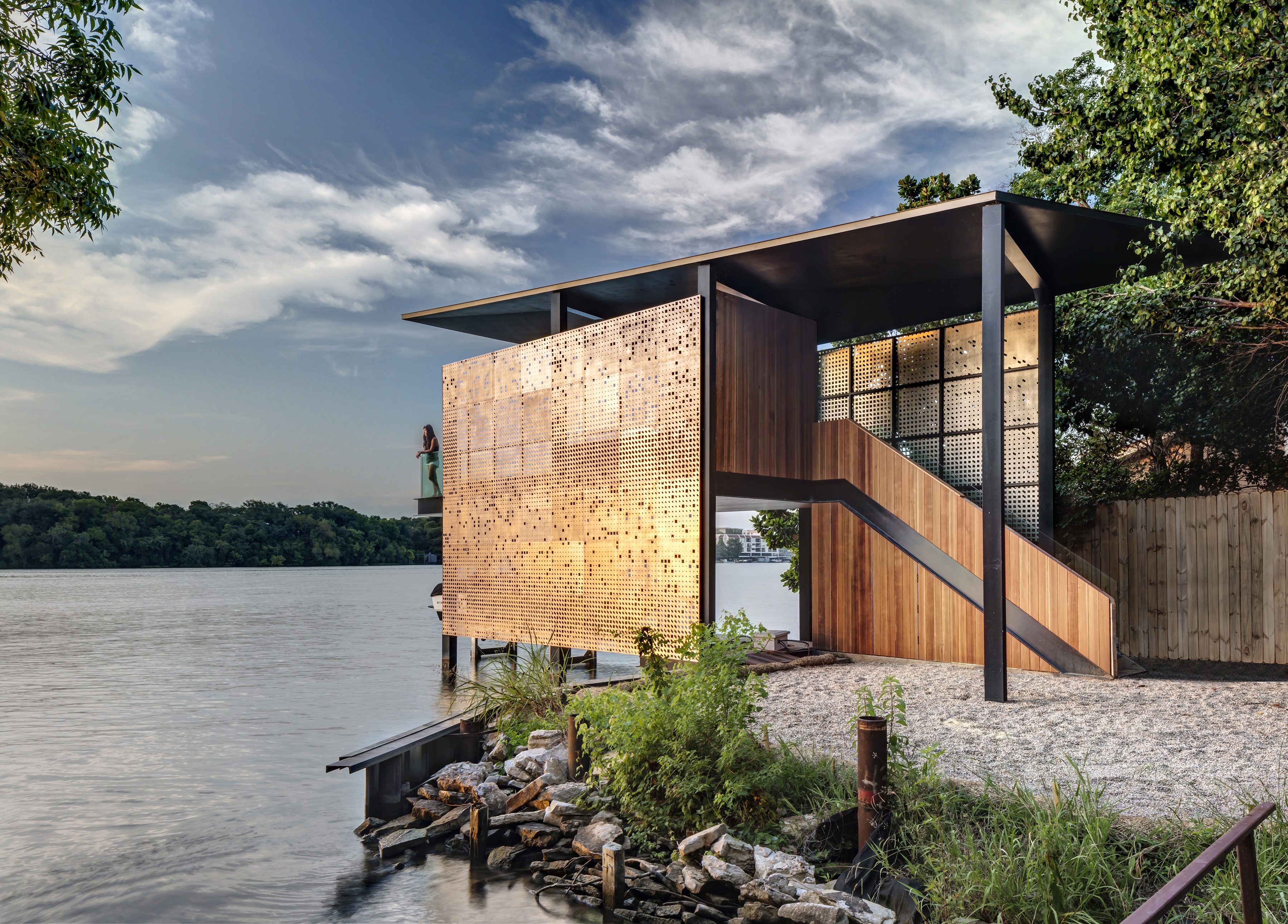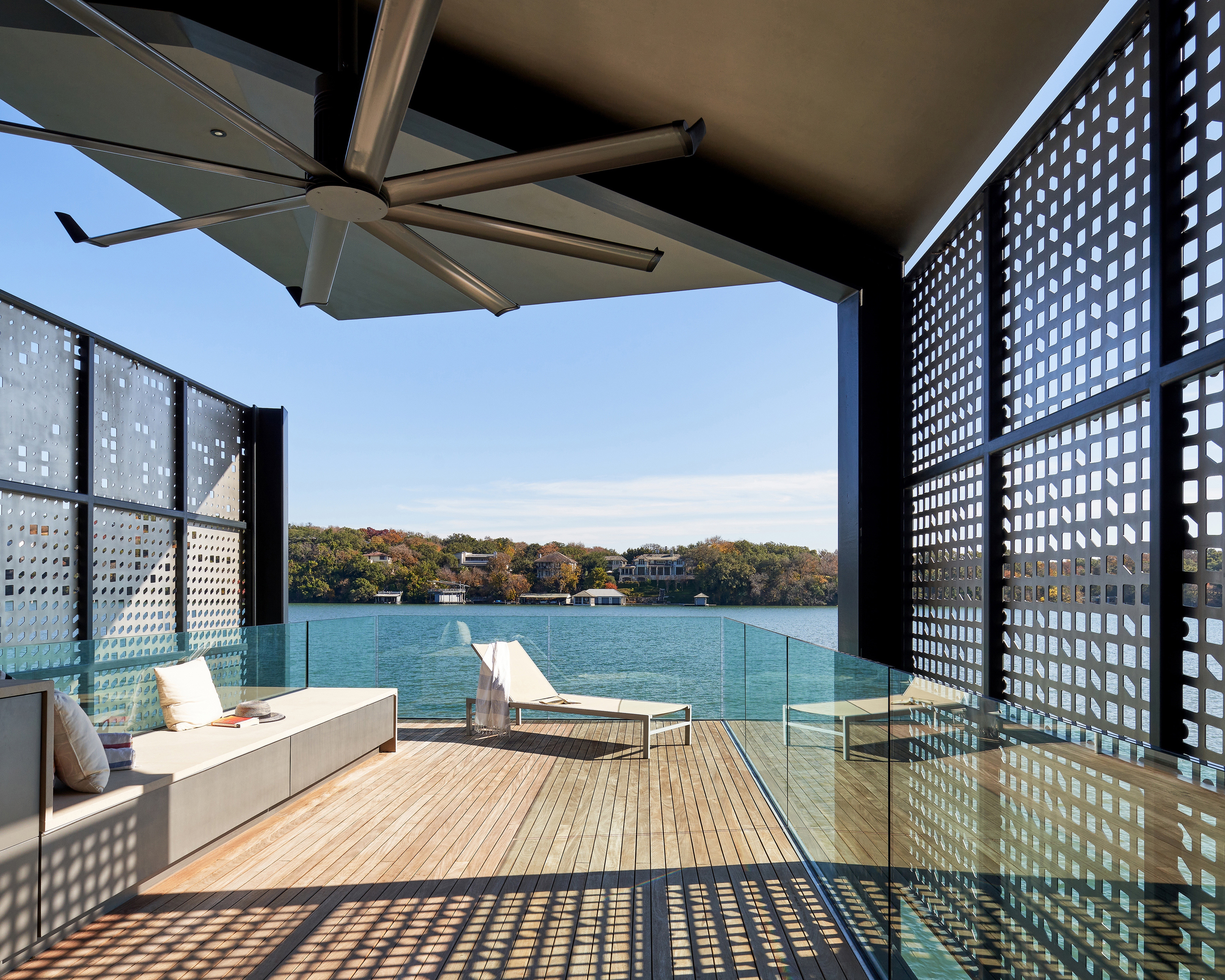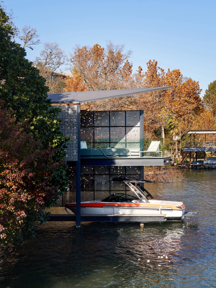 The dock’s design is derived from careful calibration of shade, breezes, and views, while it’s expressive material and formal qualities amplify the experience of both inhabiting and viewing the structure. As the seasons shift, the dock provides greater shade during the heat of the summer and welcomes more sun during the cooler winter months. On the equinox, light and shadow are perfectly balanced.