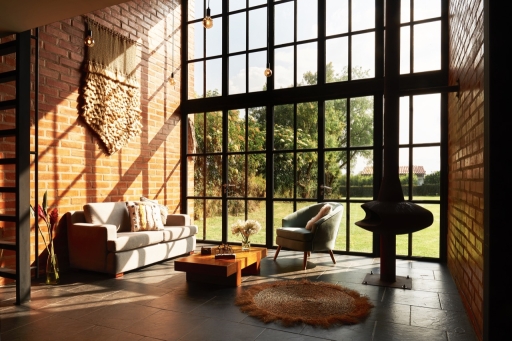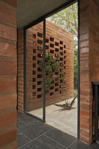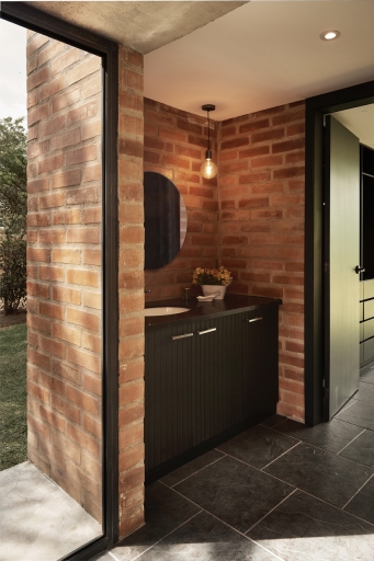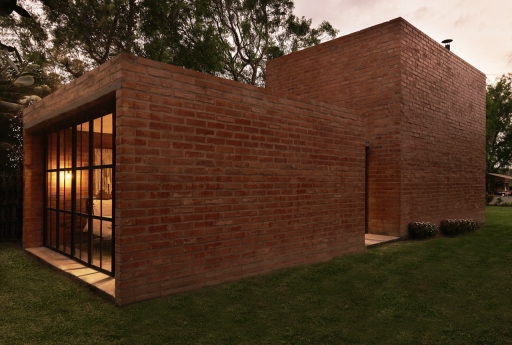 The home’s passive solar design accommodates the region’s contrasting temperatures, with the brick materiality storing the heat of the day and releasing it at night when temperatures drop.