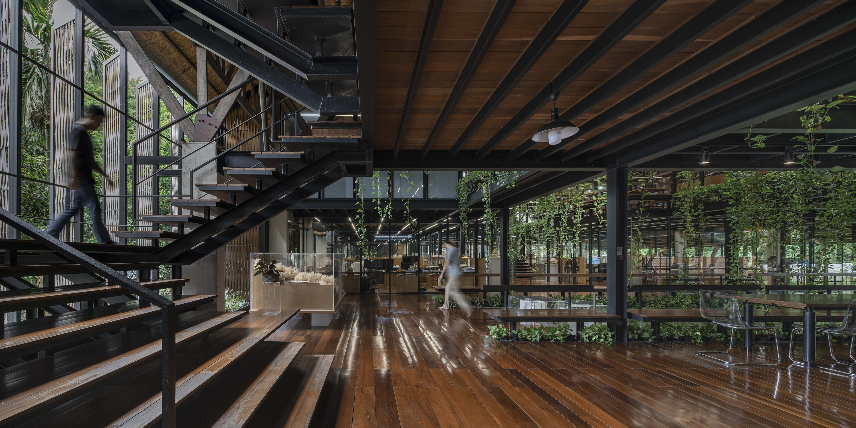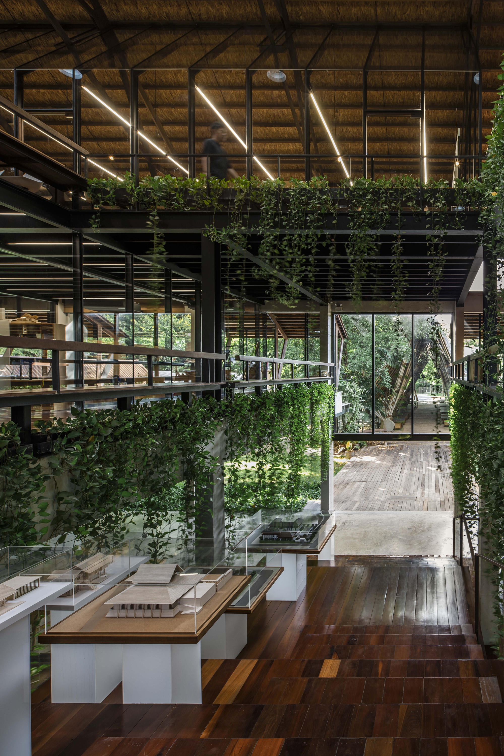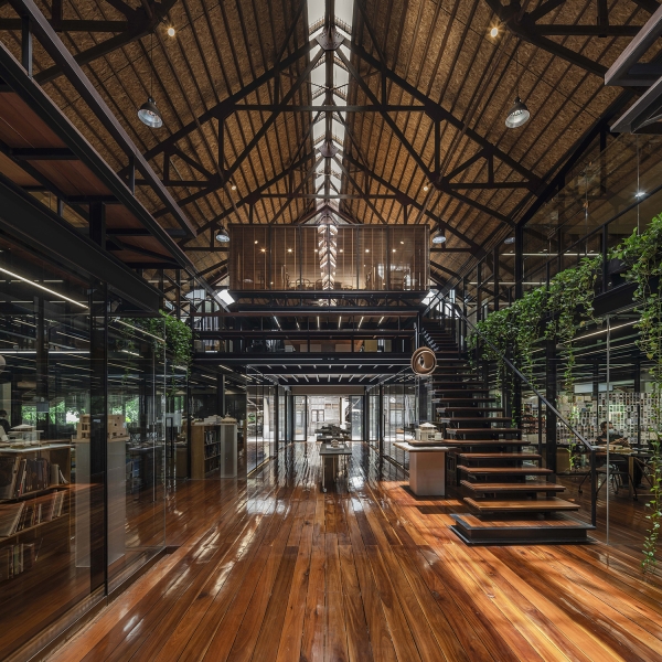 The Rabindhorn building, originally a school gymnasium, was repurposed into an architectural studio to support its “work-based learning” model. The project fosters a collaborative learning environment where students, teachers, and architects work together under one roof, reflecting holistic educational approach. The design preserves the original structure, retaining wooden trusses and incorporating renewable materials, such as recycled wood and local construction techniques. Functional spaces include 2 stories of glass-enclosed offices, open learning areas, workshops, and a 100-seat meeting room. Sustainable practices like passive cooling and natural lighting reduce the building’s carbon footprint. The project engaged architecture students in the design process, offering hands-on experience. This transformation honors the building's historical context while creating a vibrant space that supports professional development and reflects the cultural heritage of the Bang Khun Tien community. This design creates a dynamic, adaptable space that integrates educational functions with community engagement, serving as a model for sustainable, contextually sensitive architectural development.