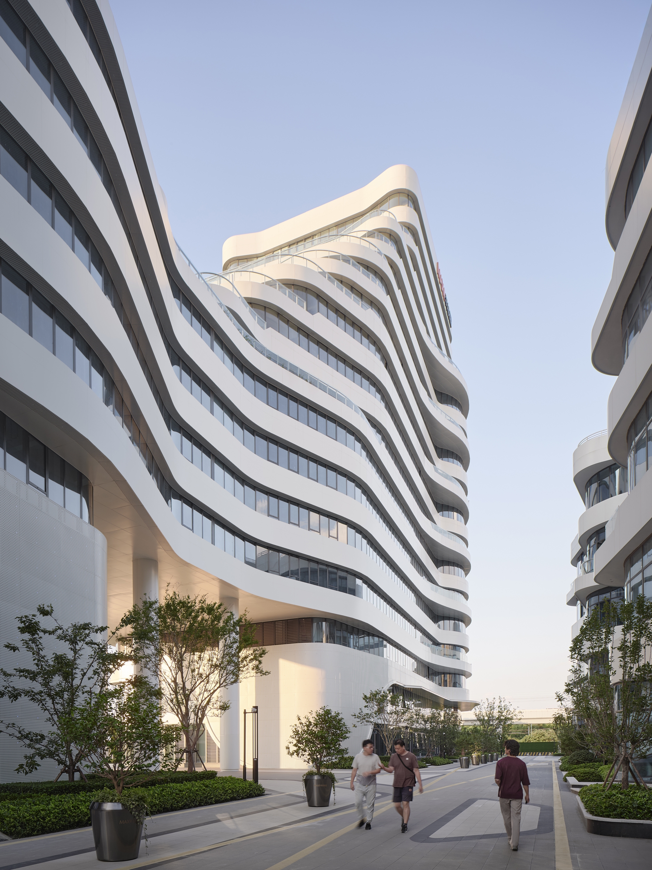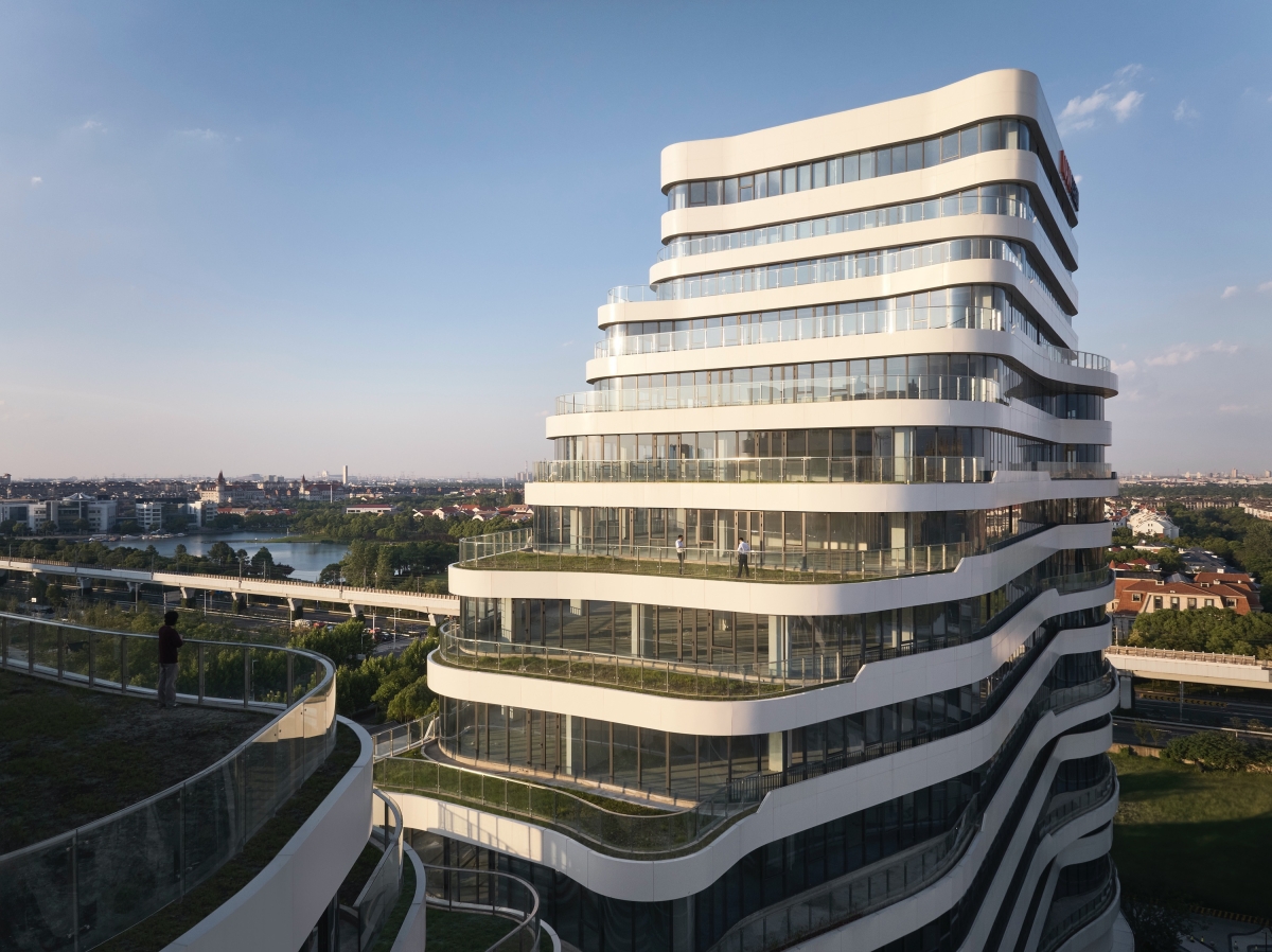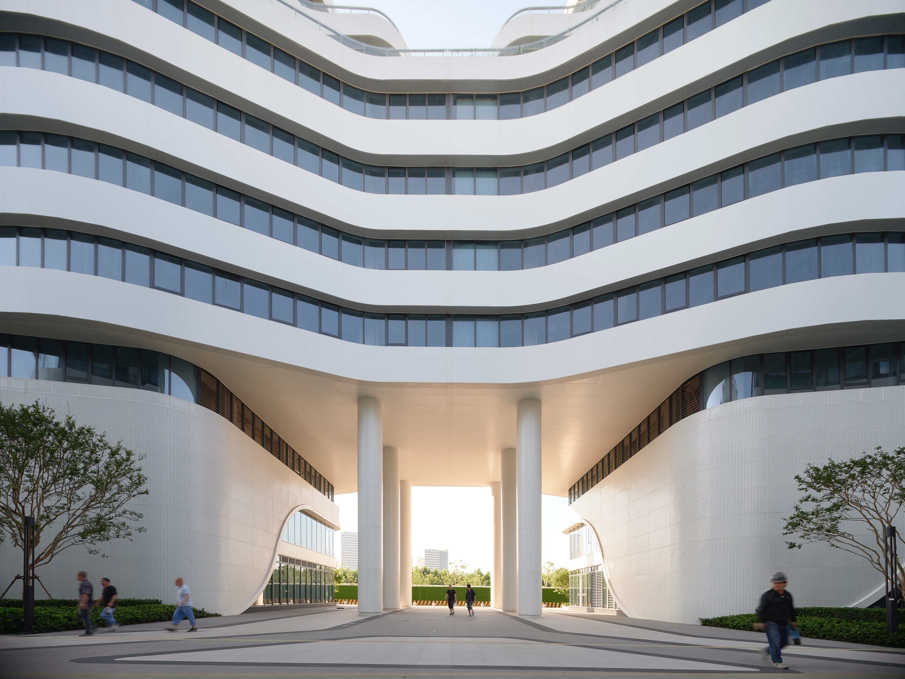 Its design emphasizes natural harmony, with a "Green Valley" approach that brings landscapes into the park. The building's white curves echo Mei Lan Lake, showcasing tech's place in nature.