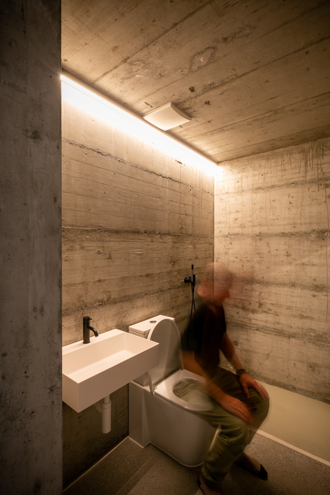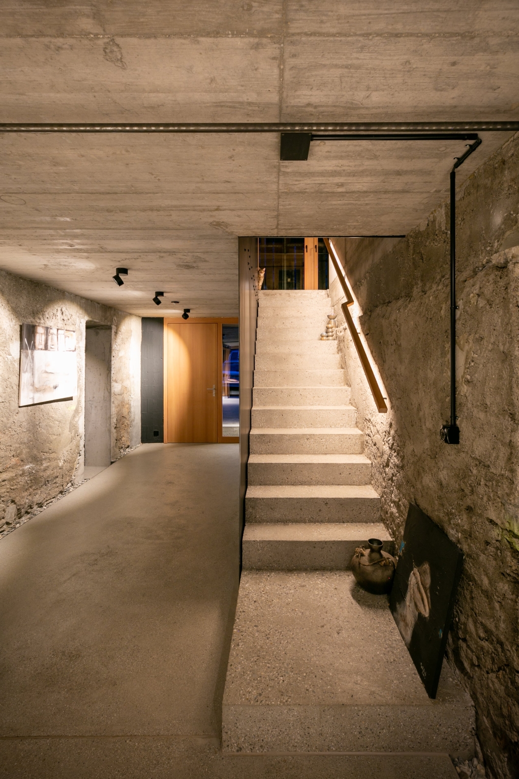 The hay barn was divided into two floors. Access from the street is through the ground floor, which once housed the gate. This area includes a guest room with shower and wet room, a studio with cellar, and the utility room. The upper floor houses the living area of the building with a kitchen and another room with a bathroom and dressing room. From this floor, one can access the covered terrace in the intermediate structure. Above the living room extends a gallery, inviting one to linger.
