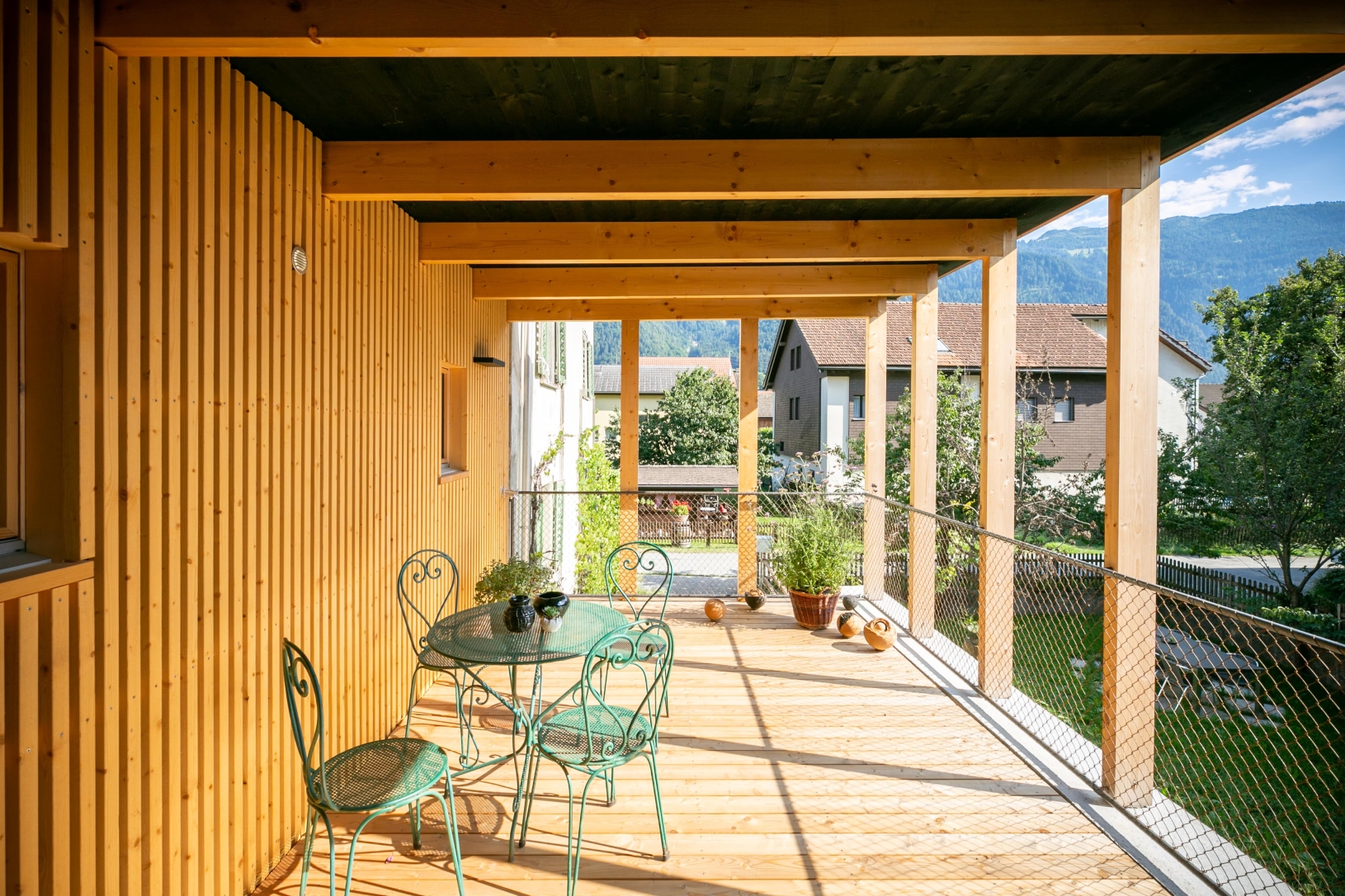 The residential building was fully preserved. The shape of the old hay barn was retained but extended in the direction of the ridge to achieve harmonious integration. The intermediate structure connecting both buildings was deconstructed and expanded with a simple wooden construction. Through this intervention and the unassuming intermediate structure, the main buildings are highlighted better, retaining their original characteristics.
