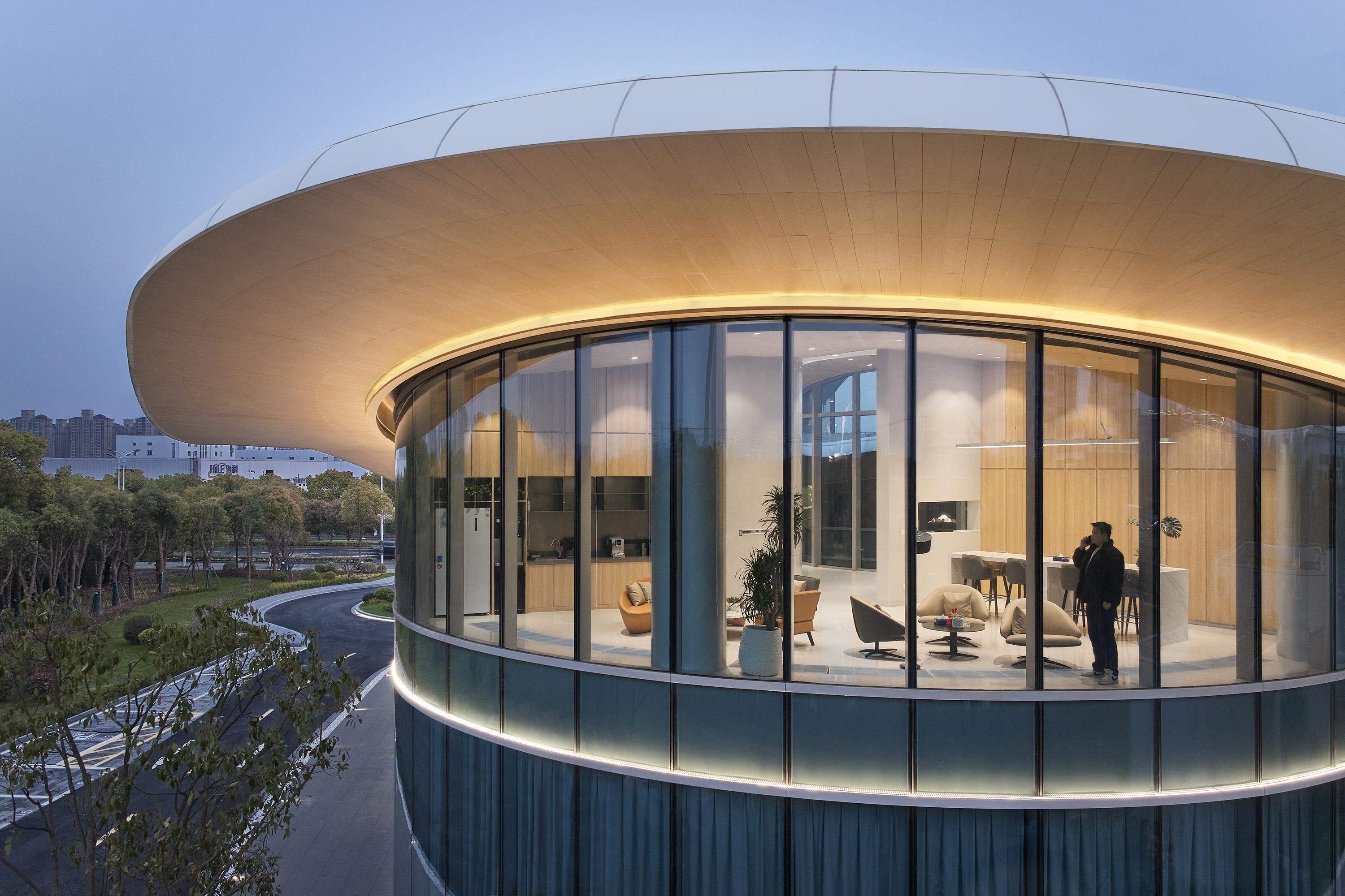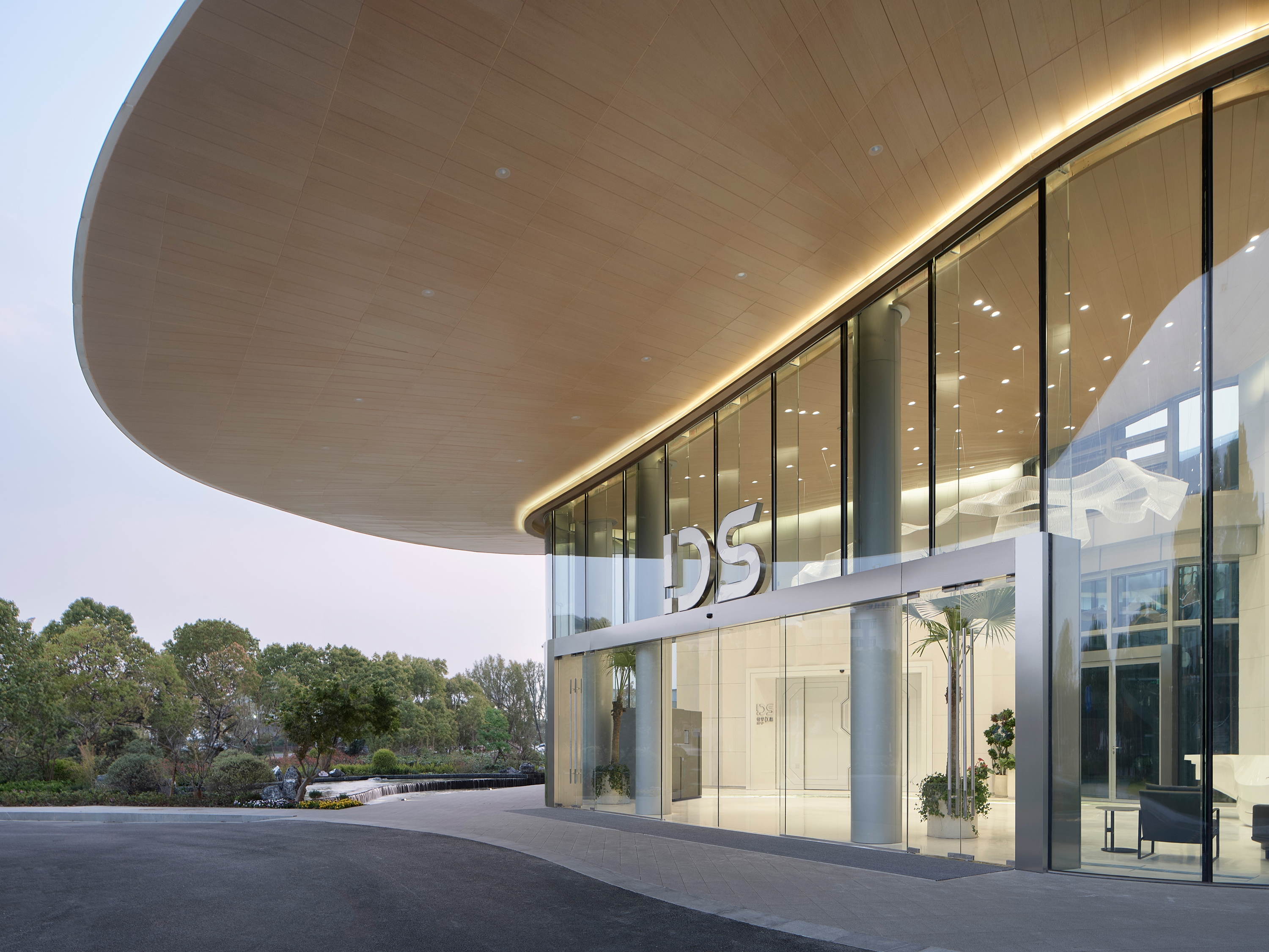 Steel is generously applied in the main structure of the building. And we choose ultra clear glass for the facade, with the aim of blurring boundaries between indoor and outdoor spaces. Looking at the building from afar, the ultra clear glass subtly blends into the greenery, while the white roof is hovering over like a piece of cloud.The width of eave stretches to 8 meters, providing guests who arrive in vehicles with a shade from sun and rain.