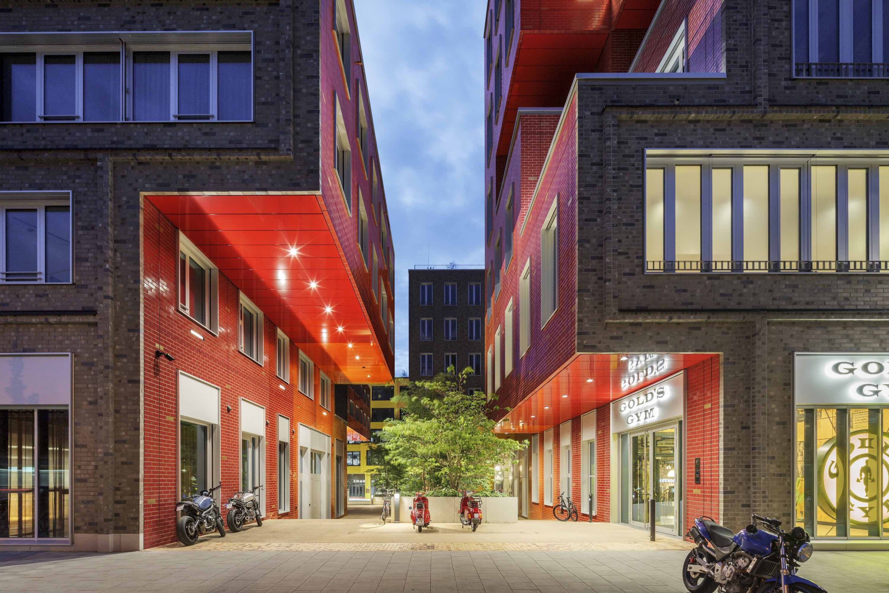 Separated from the hotel by a new pedestrian canyon is a Gold's Gym with offices above. Carving out this, and two additional, canyons was key to making the neighborhood more welcoming and introducing a sense of place to the community beyond simply the new development. The main canyon leads to another office building and a public plaza, the facade of which is clad in the same glossy, red-to-orange brick as the sides of the canyon—an image of pure joy that draws people in.