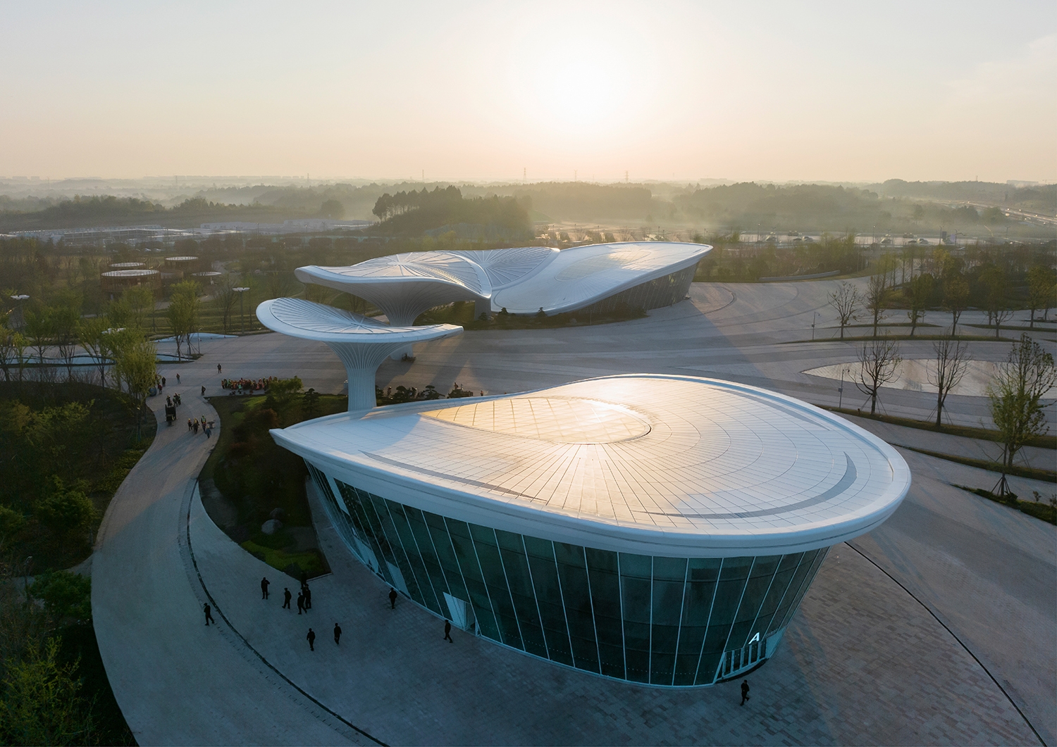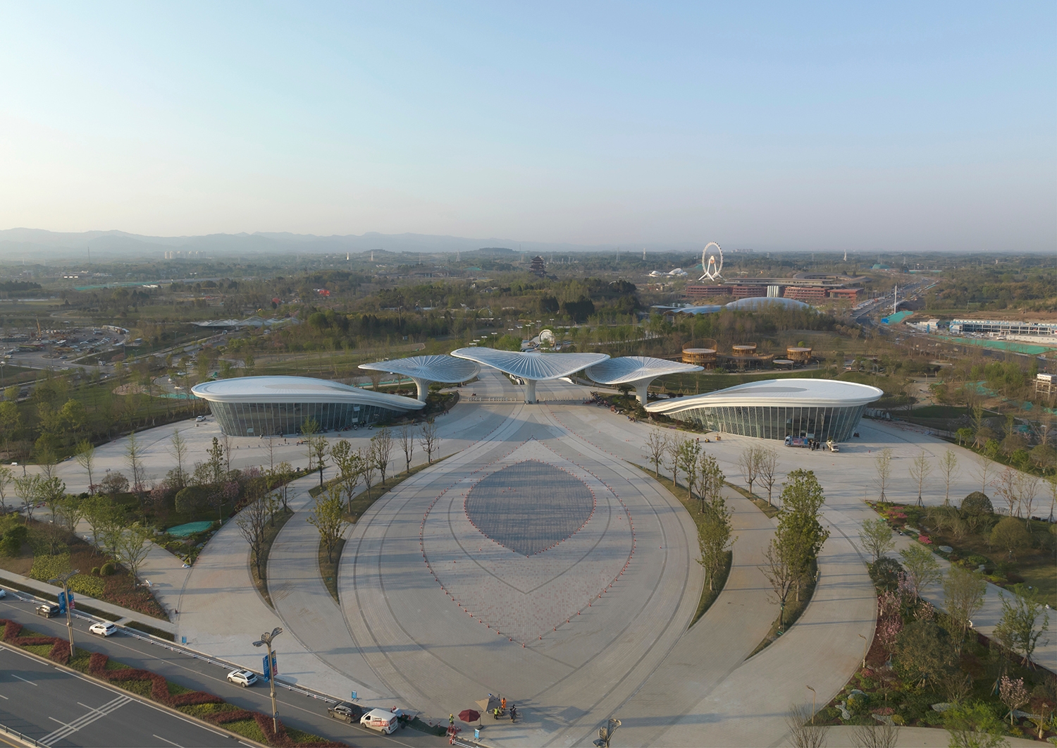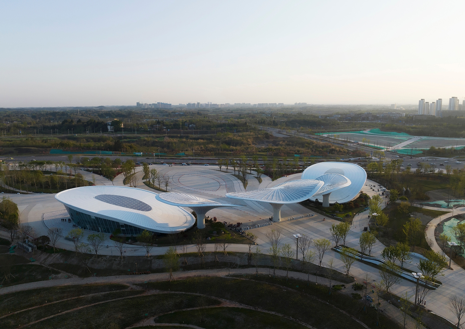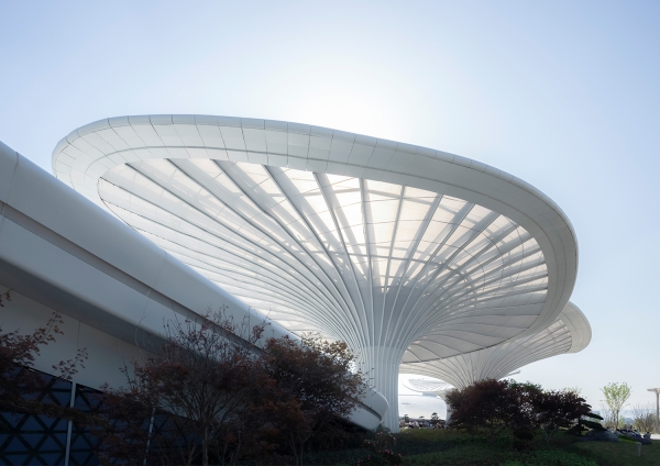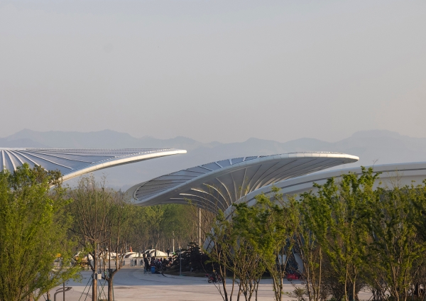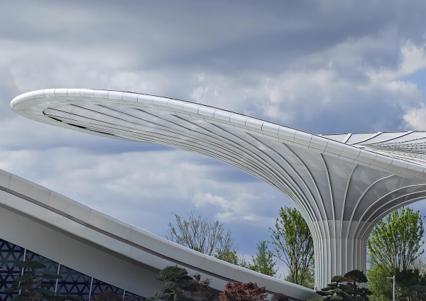 The Comprehensive Service Pavilion is a core service building and main entrance with a key impression for the 2024 Chengdu World Horticultural Exposition. The design draws inspiration from the "Han Que" (traditional Chinese ceremonial gate tower), with the shape of the Confederate rose, the city flower of Chengdu, to highlight functional features and local culture, resonating with the Expo's theme. Three twisted and tensile mega canopies with two independent pavilions as wings, create a welcoming and hospitality image. While giving it a biomimetic shape, the integrated parametric technique also addresses two systems of the hyperbolic asymmetrical structure and the rainwater reused collection. The energy-saving glass, plants, and a natural ventilation system were used and combined with different ETFE and STFE membrane materials, to improve indoor air quality. To consider the economy, practicality, energy efficiency, and sustainability, the Comprehensive Service Pavilion will continue to serve as a community center, offering leisure spaces and commercial services to citizens after the Expo. Not just as a new public space for the city, but also establishing a new landmark for Chengdu.