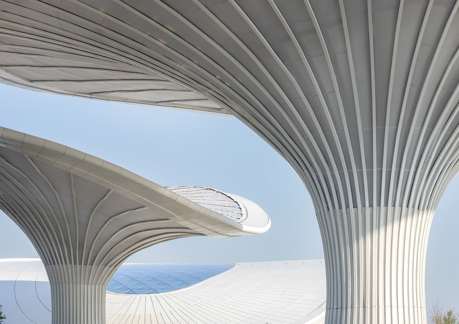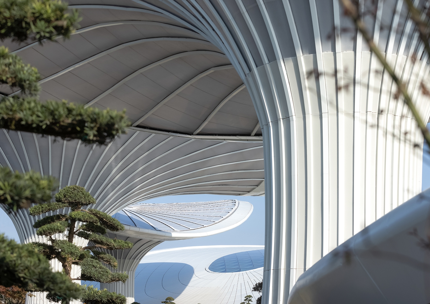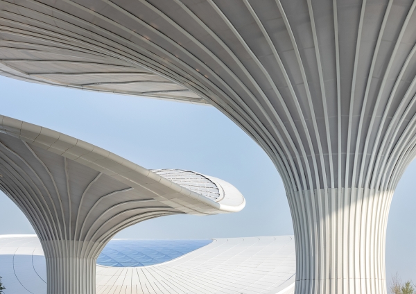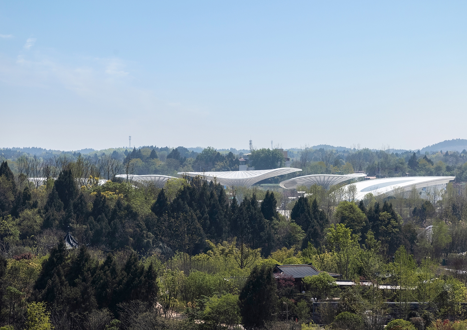 The Comprehensive Service Pavilion is a core service building and main entrance with a key impression for the 2024 Chengdu World Horticultural Exposition. The design draws inspiration from the "Han Que" (traditional Chinese ceremonial gate tower), with the shape of the Confederate rose, the city flower of Chengdu, to highlight functional features and local culture, resonating with the Expo's theme. Three twisted and tensile mega canopies with two independent pavilions as wings, create a welcoming and hospitality image. While giving it a biomimetic shape, the integrated parametric technique also addresses two systems of the hyperbolic asymmetrical structure and the rainwater reused collection. The energy-saving glass, plants, and a natural ventilation system were used and combined with different ETFE and STFE membrane materials, to improve indoor air quality. To consider the economy, practicality, energy efficiency, and sustainability, the Comprehensive Service Pavilion will continue to serve as a community center, offering leisure spaces and commercial services to citizens after the Expo. Not just as a new public space for the city, but also establishing a new landmark for Chengdu.