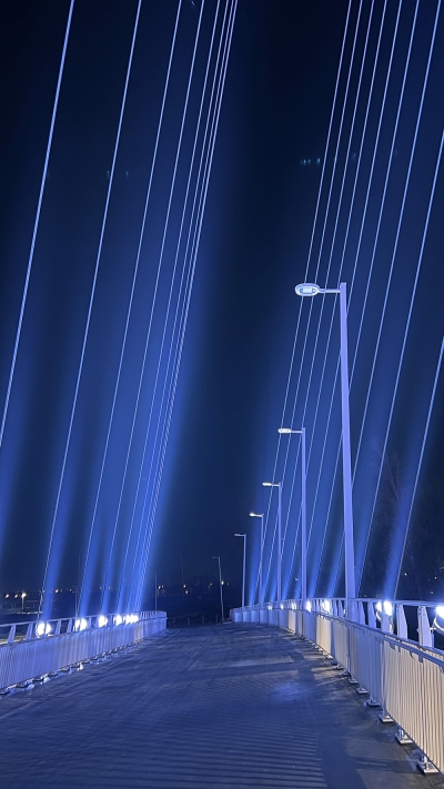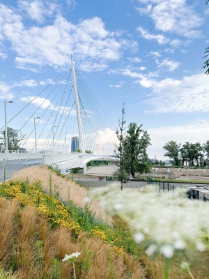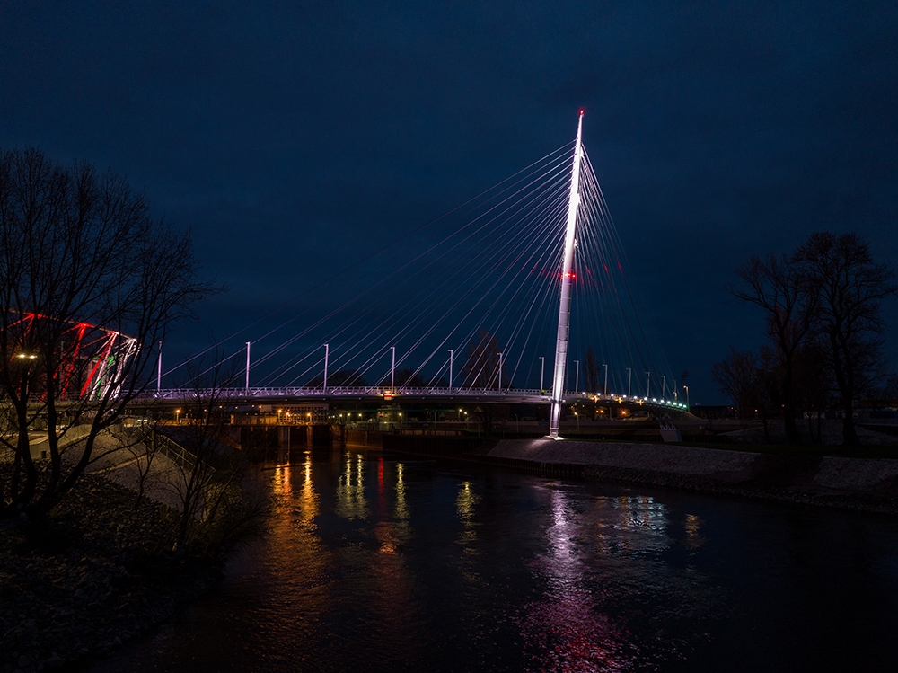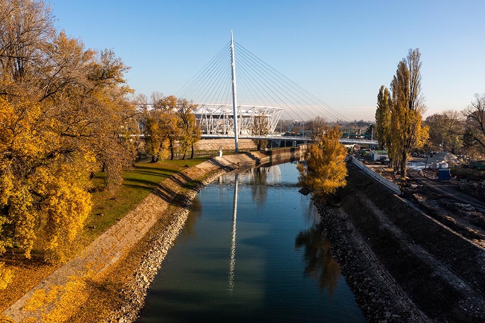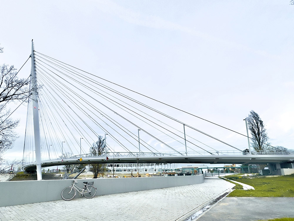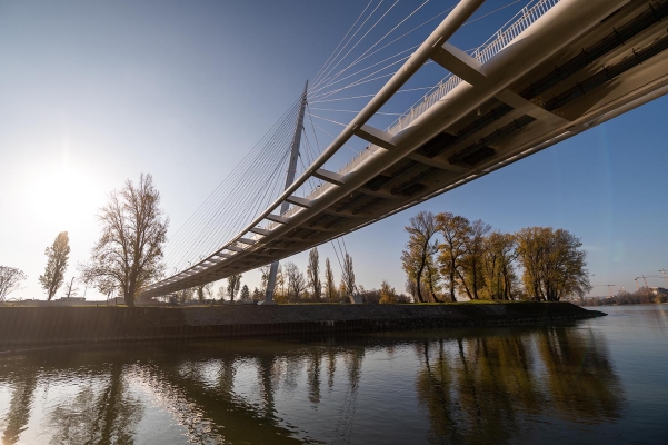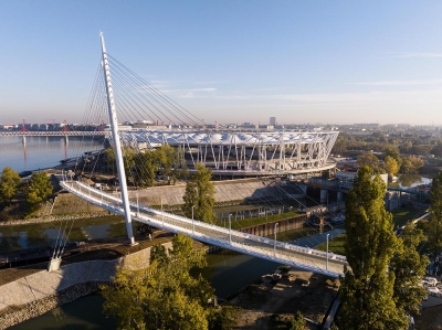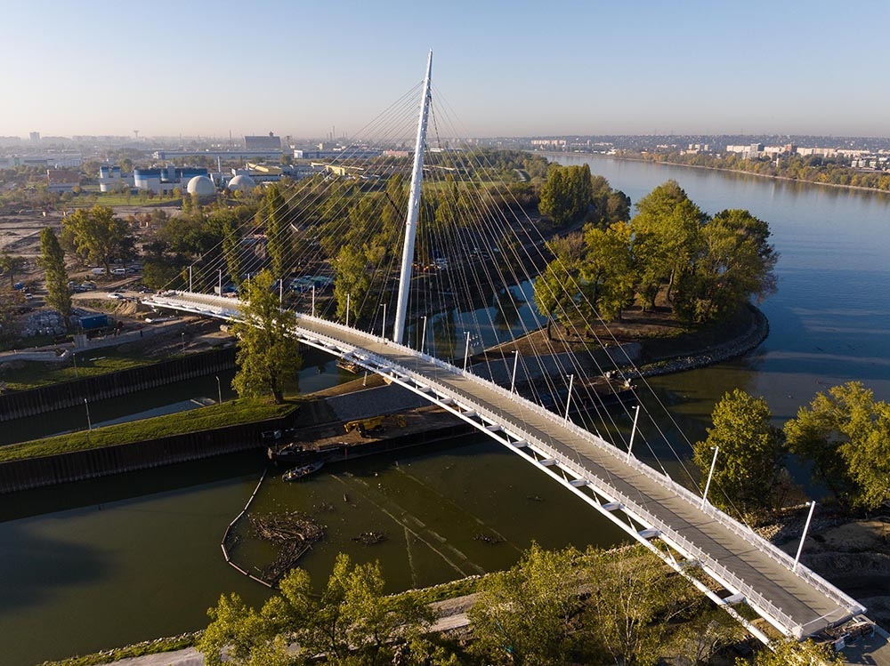 Its radiates lightness – a needle-like pylon, a transparent network of 53 cables suspending the slender bridge deck without any intermediate support. By following the bend of the river, this new element of the capital’s skyline aims to highlight the Danube waterfront. The bridge is also in strong architectural synergy with the neighboring Athletics Stadium.