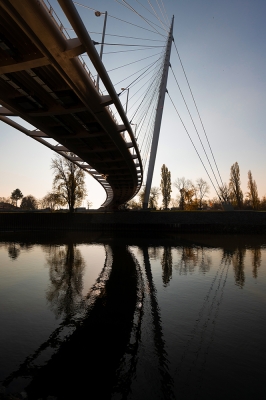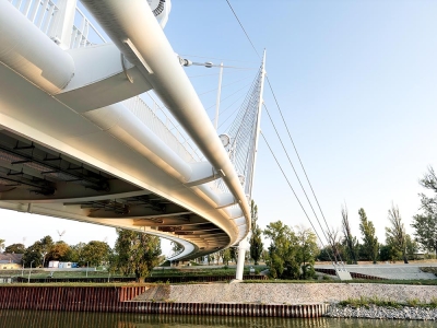The Robinson Bridge is a newly built pedestrian & cycle bridge located at the confluence of the Danube and its Soroksári-Branch in Budapest. The 168 m span bridge is a unique curved cable-stayed structure with a single pylon.