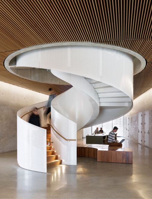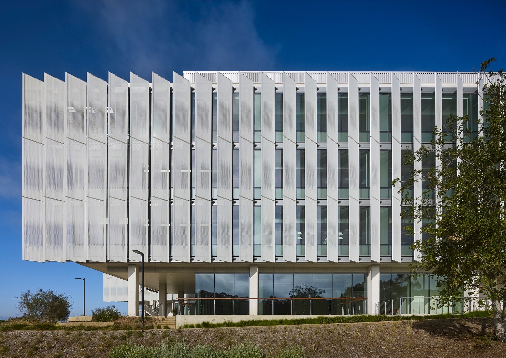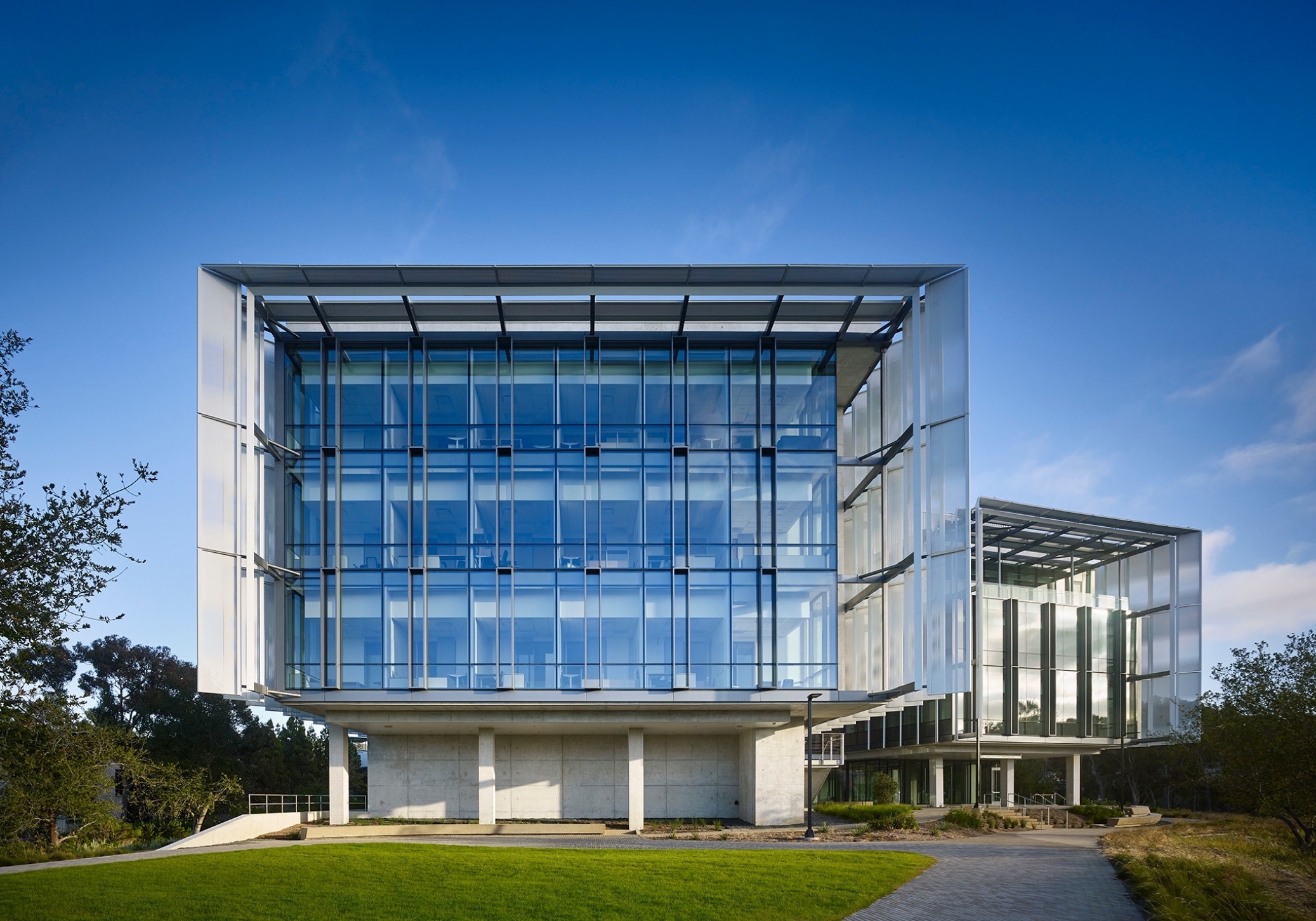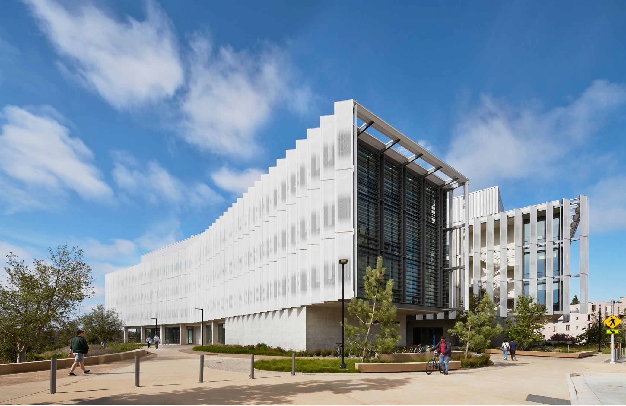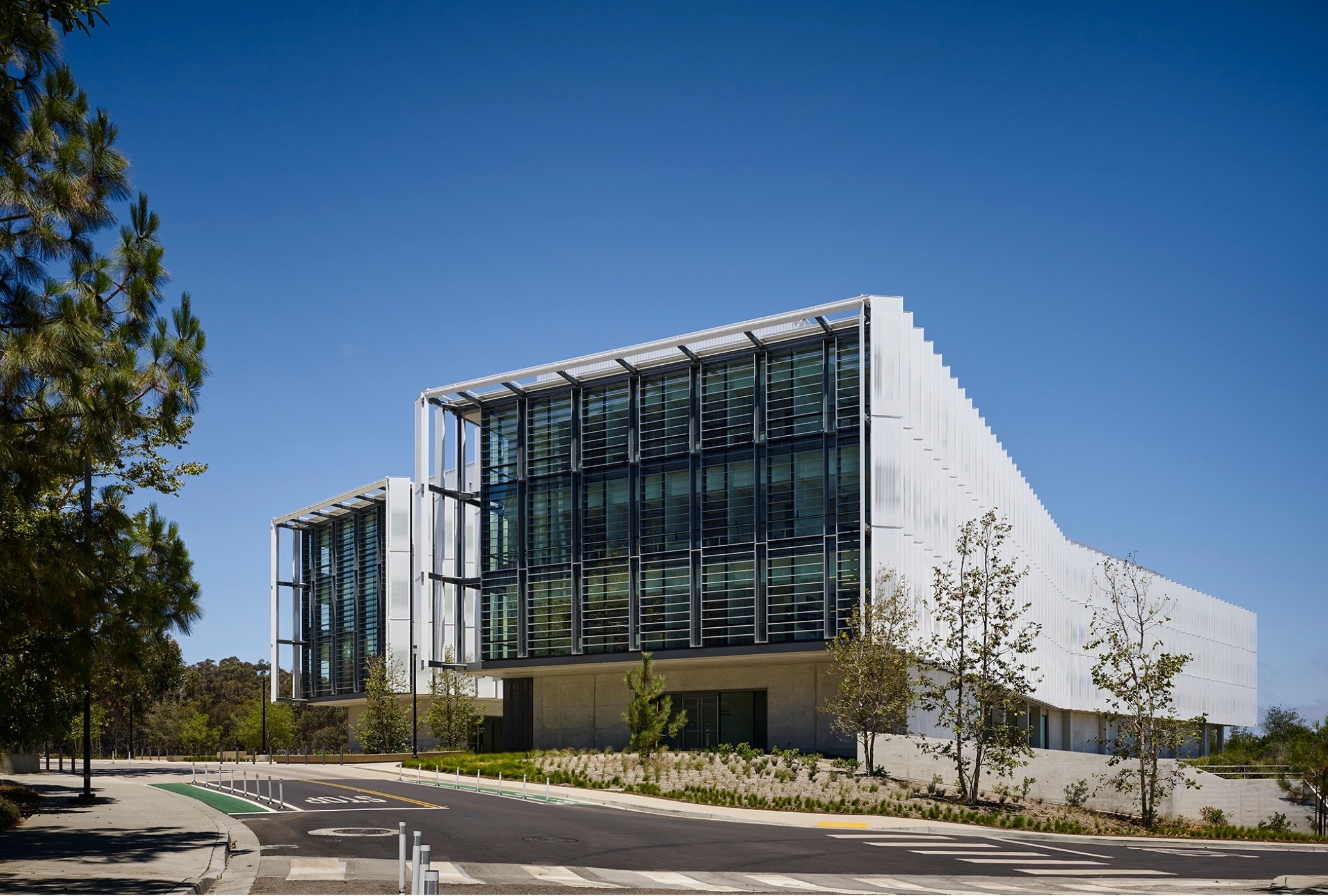 The design parti leverages its atrium as a connector, where engagement extends beyond the boundaries of the research spaces. From multiple vantage points within, visitors, students, and faculty alike can look around at the diverse technology and investigations being explored. The collaboratories are ultra-flexible, utilizing a kit of parts so that the spaces adapt and evolve alongside the technology and innovation they facilitate. The LEED-Platinum design features a splayed geometry coupled with vertical sunshades that give the building a serrated sculptural appearance, reducing solar gain while also providing passive daylight to students deep within the building.