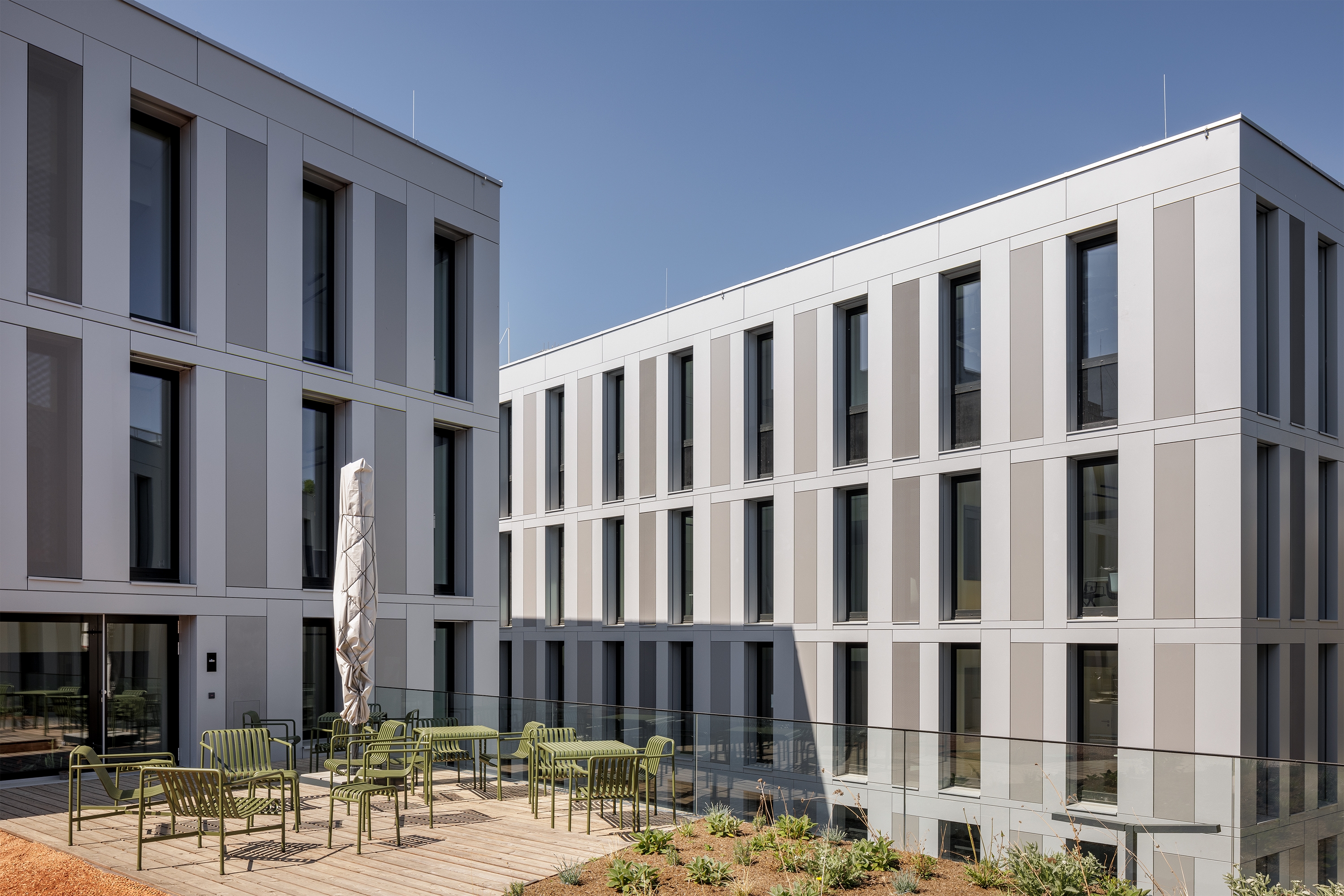 The effectiveness and efficiency of the 4 new campus buildings begins with their form and neutral utilisation. The buildings are very compact and can be quickly adapted to changing research environments. Economy and ecology also complement each other through the simple design of the building services.