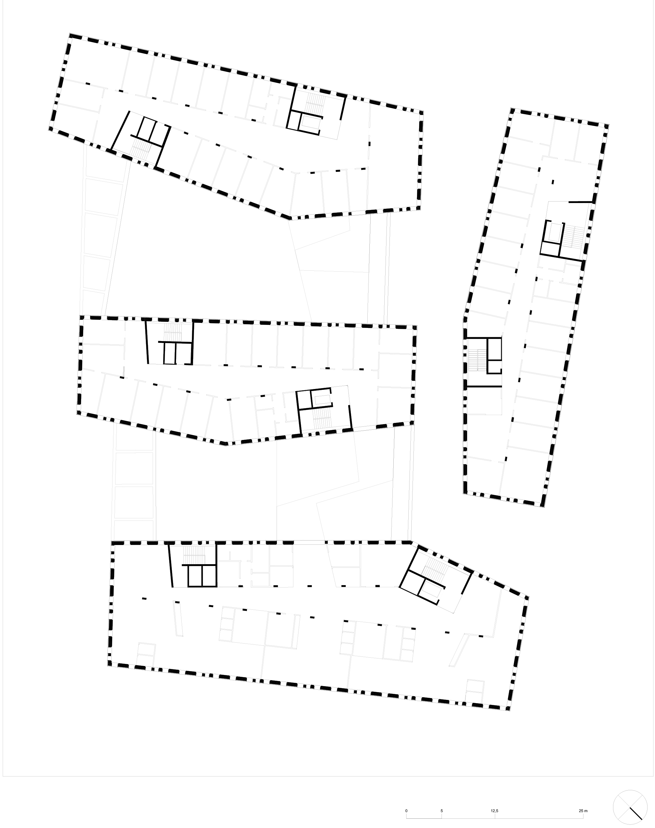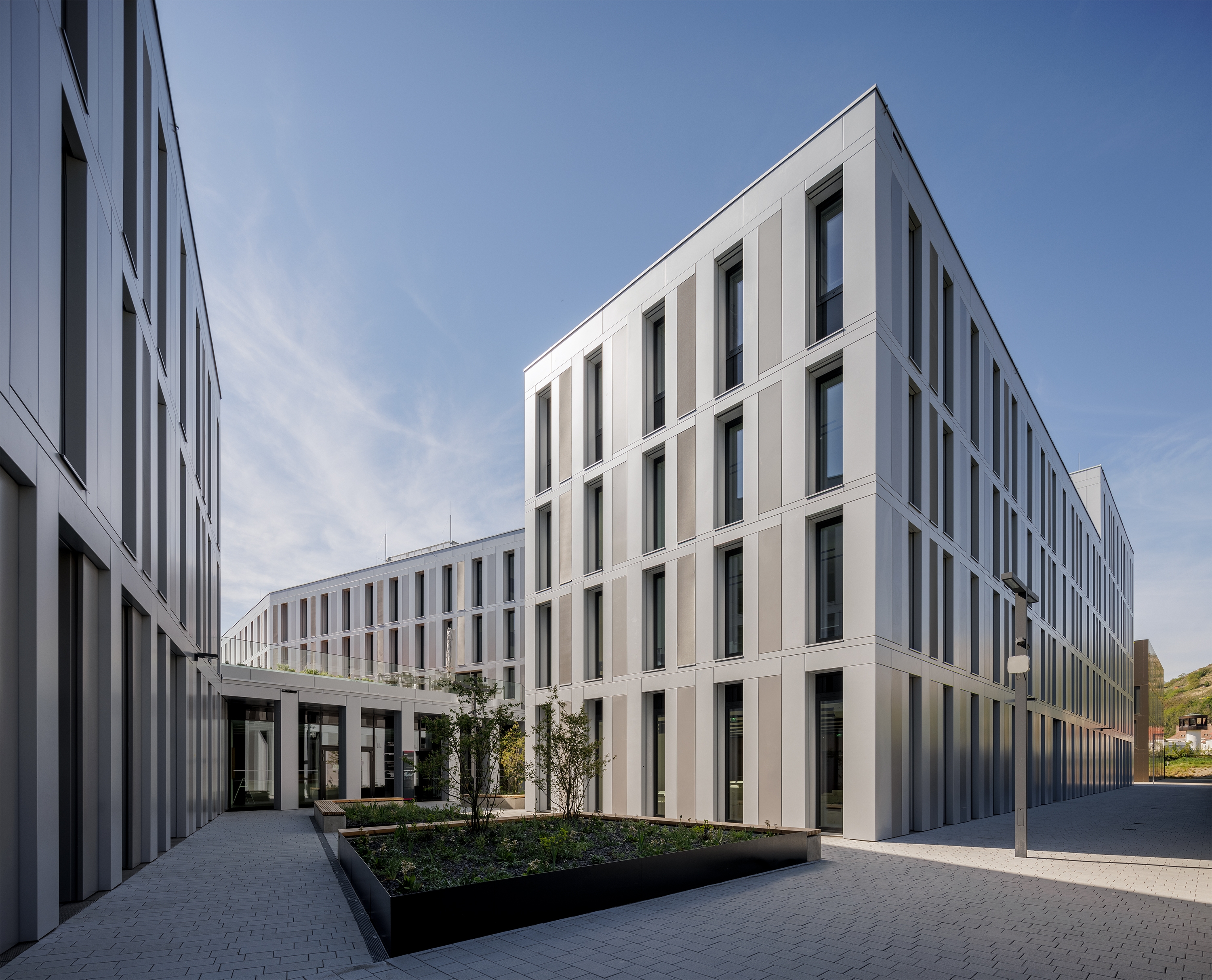 Urbanistically, the ensemble is integrated into the context. Three of the buildings are connected by a base storey, one building is free-standing. A city within the city with paths, squares and arcades has been created.