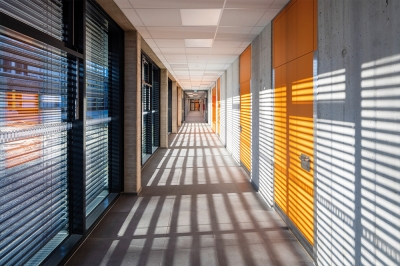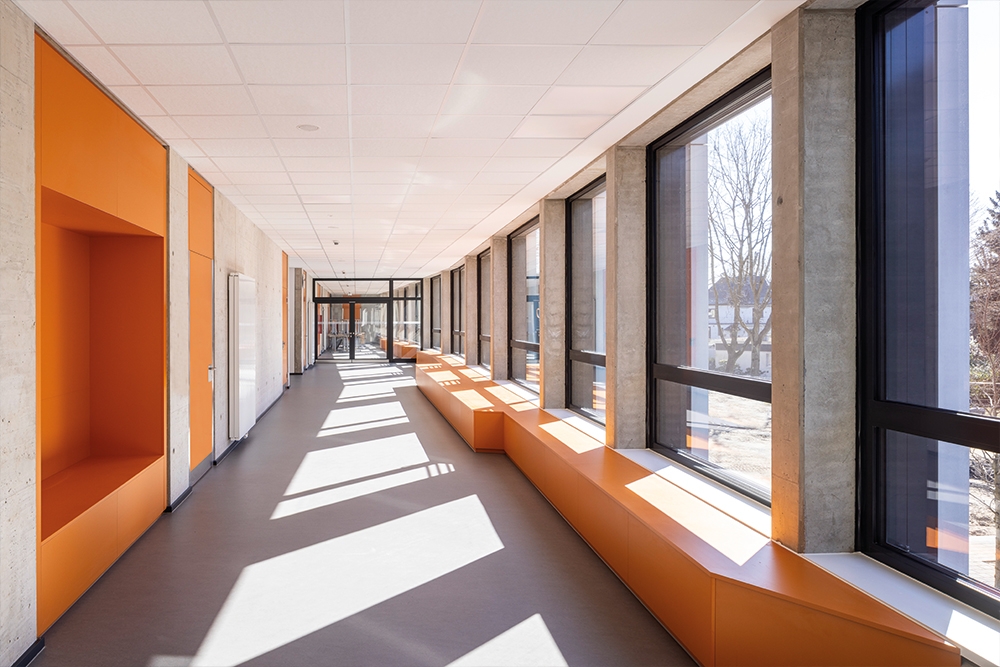 The new building to extend the school will be constructed as a three-storey building block on the east side of the building. The two upper floors will have a widened corridor zone, which is reflected in the shape of the building and can be used by the users as a learning and recreation zone. The connection to the existing building is made via a bridge.