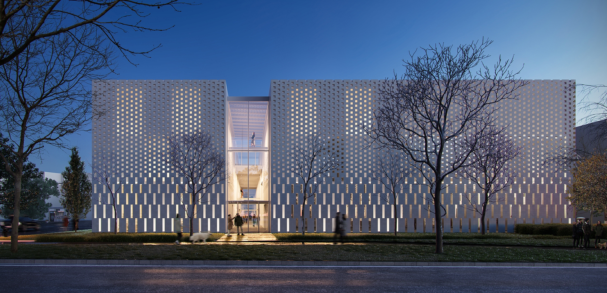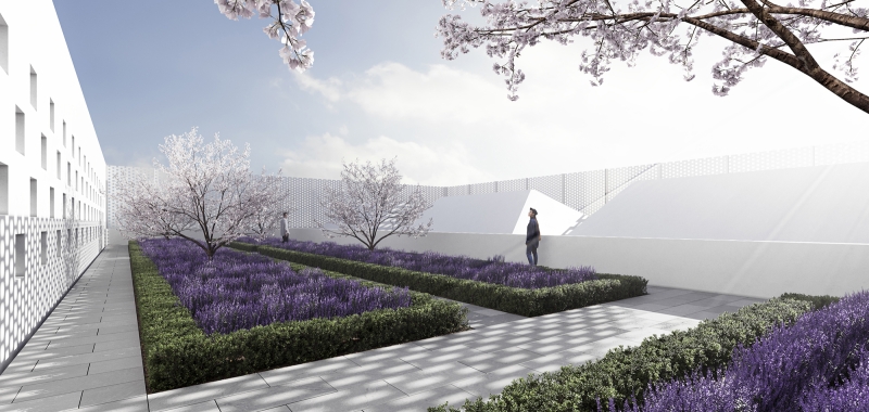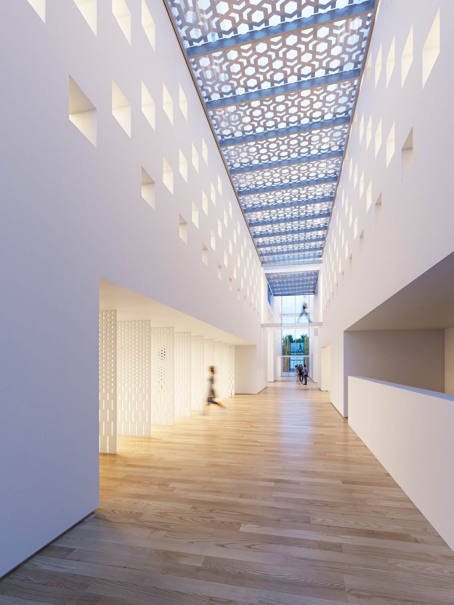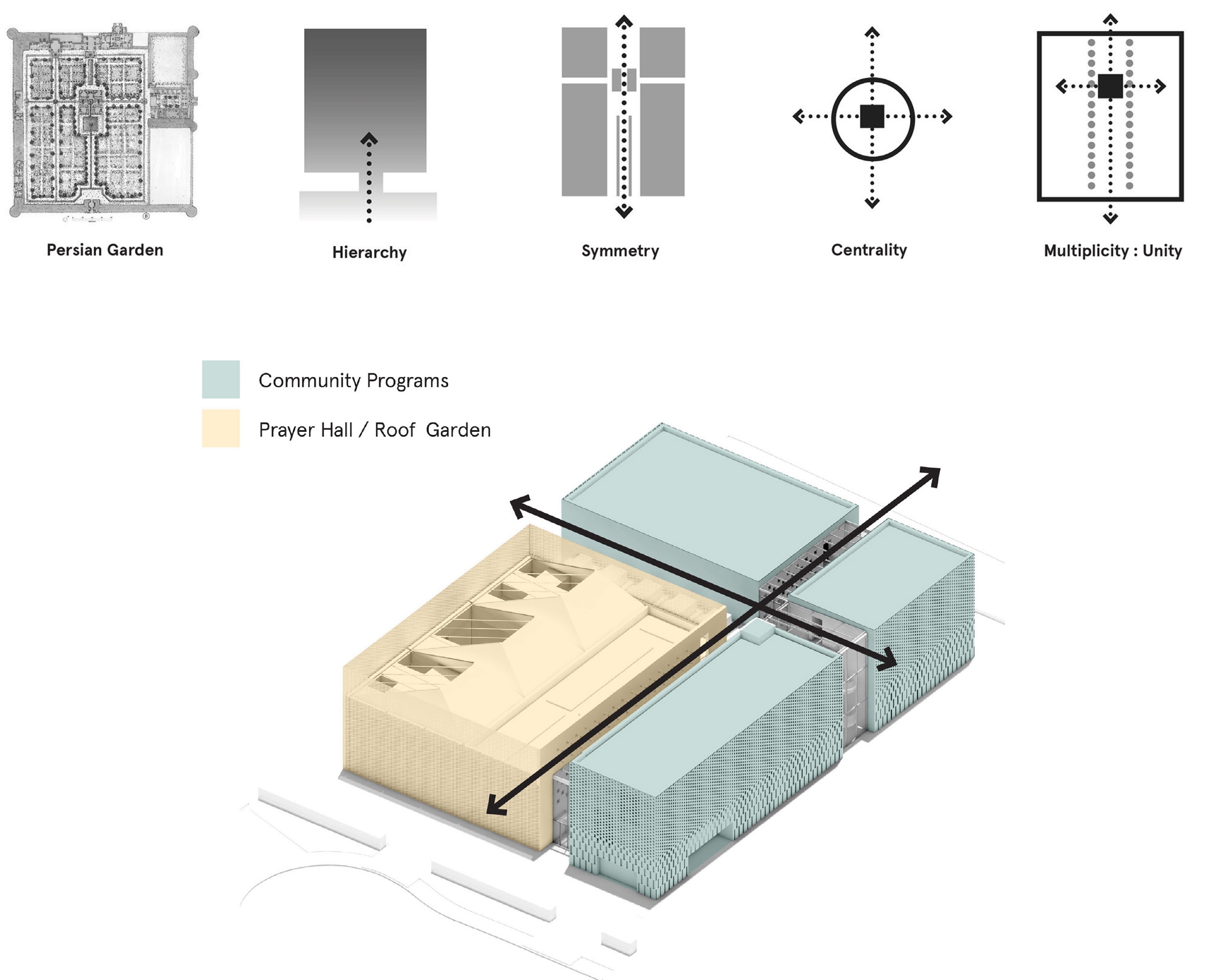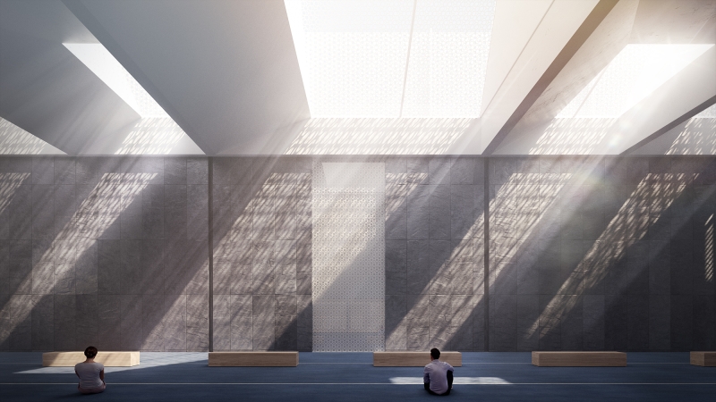 The layout and design apply Modernist idioms to the rich design traditions of Islamic architecture and landscape, and expresses, formally but humanely, a message of inclusion and pluralism. The organization of program and circulation is inspired by the form language of Islamic calligraphy, and its interplay of horizontal and vertical elements.