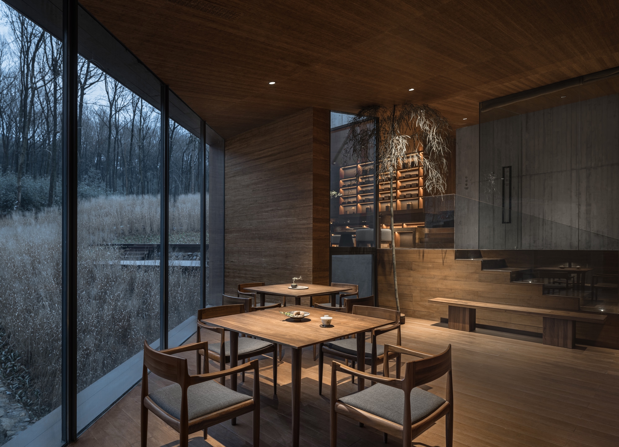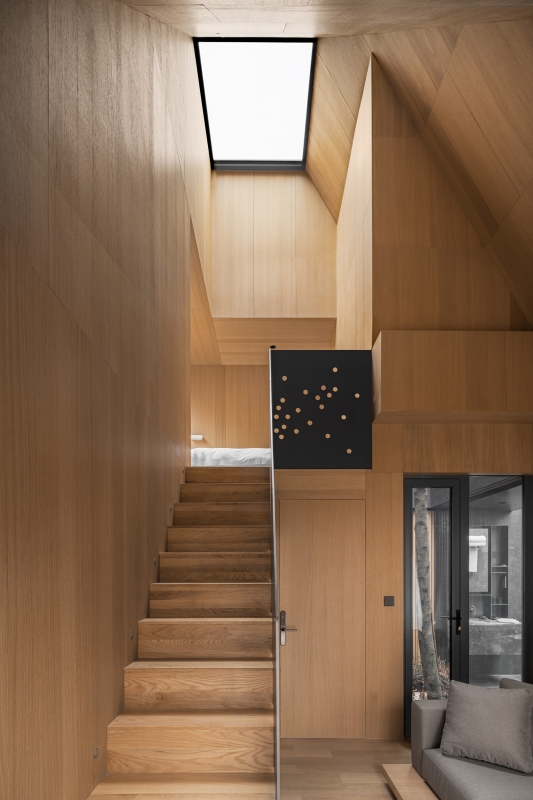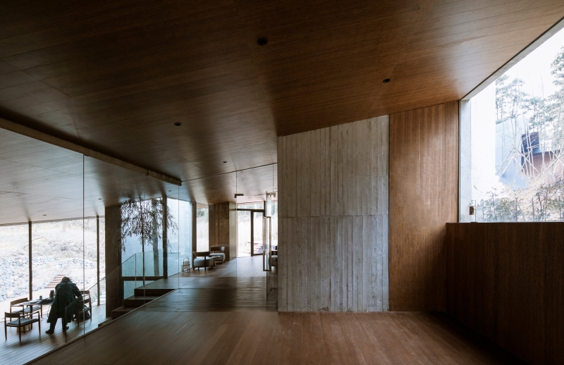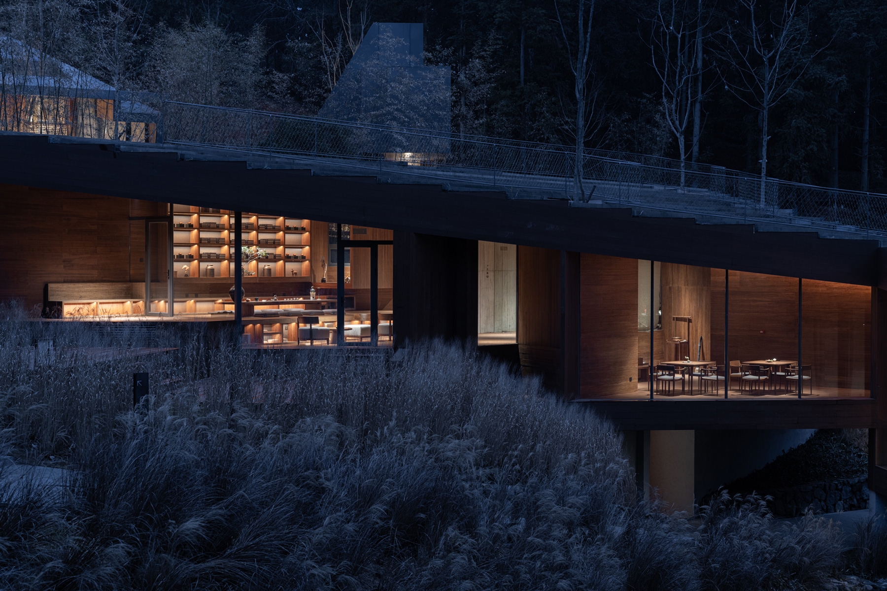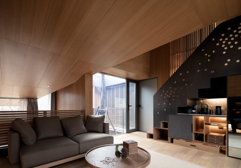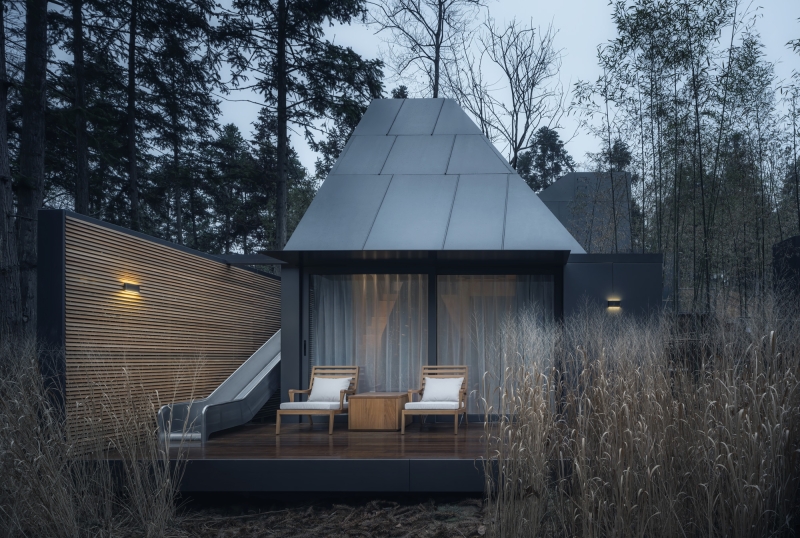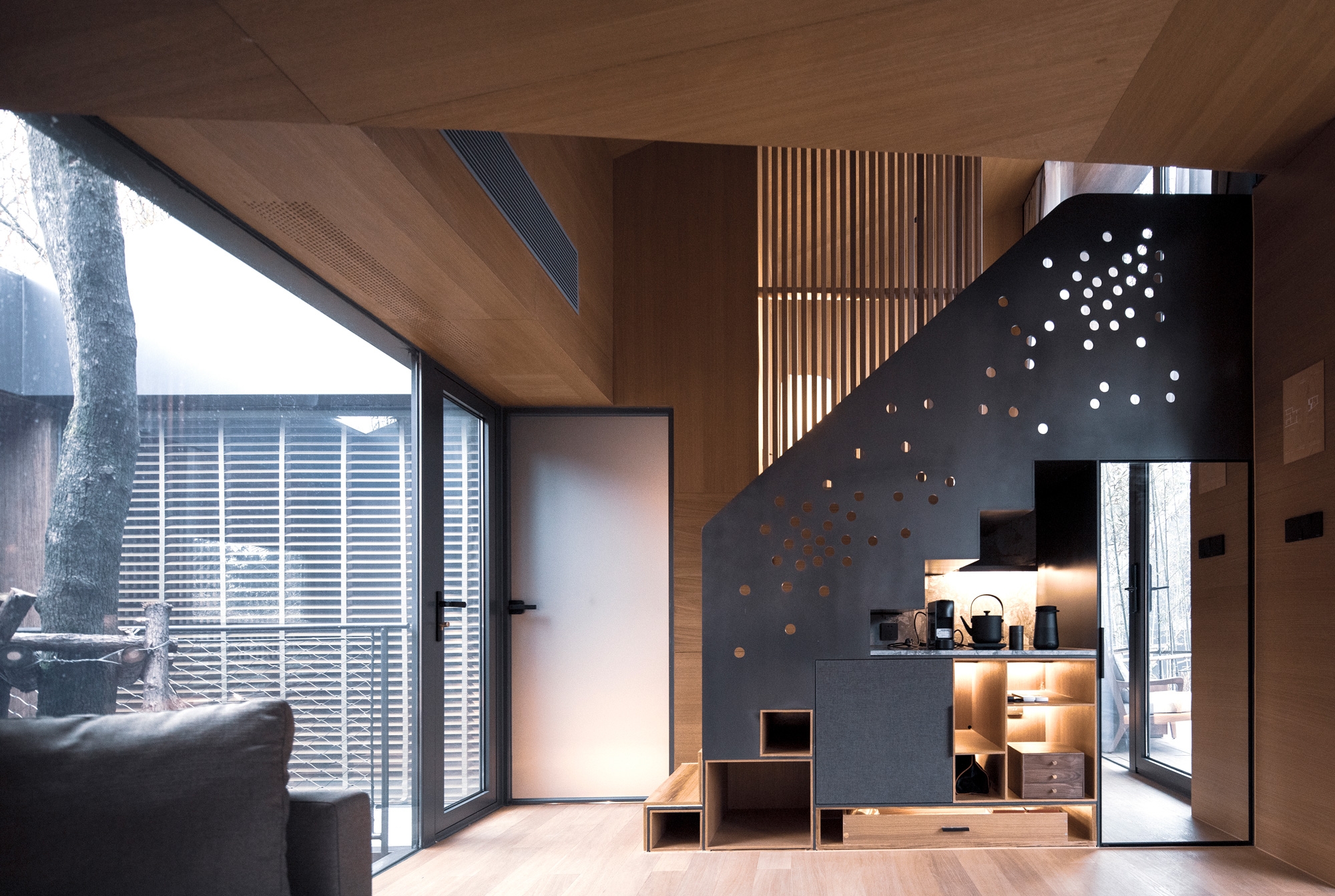 There are also several 38-68 sqm aluminum shell cabins designed in the depths of the forest, evoking the concept of architectural shelters. The weather-resistant aluminum shell can withstand harsh climates and contrasts sharply with the surroundings. The space is defined by human scale, with walls and roofs within reach, creating an experience similar to a camping tent, making visitors feel only a wall away from nature. The interior, clad entirely in wood, provides a warm and comfortable environment, forming a striking contrast with the outside wildness. This contrast allows visitors to more keenly feel the gentleness of nature or its rustic beauty.