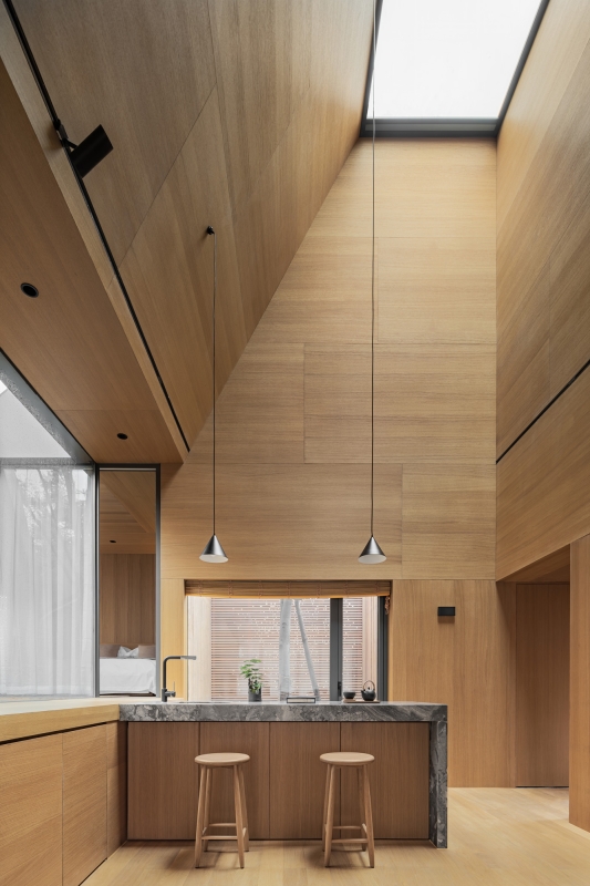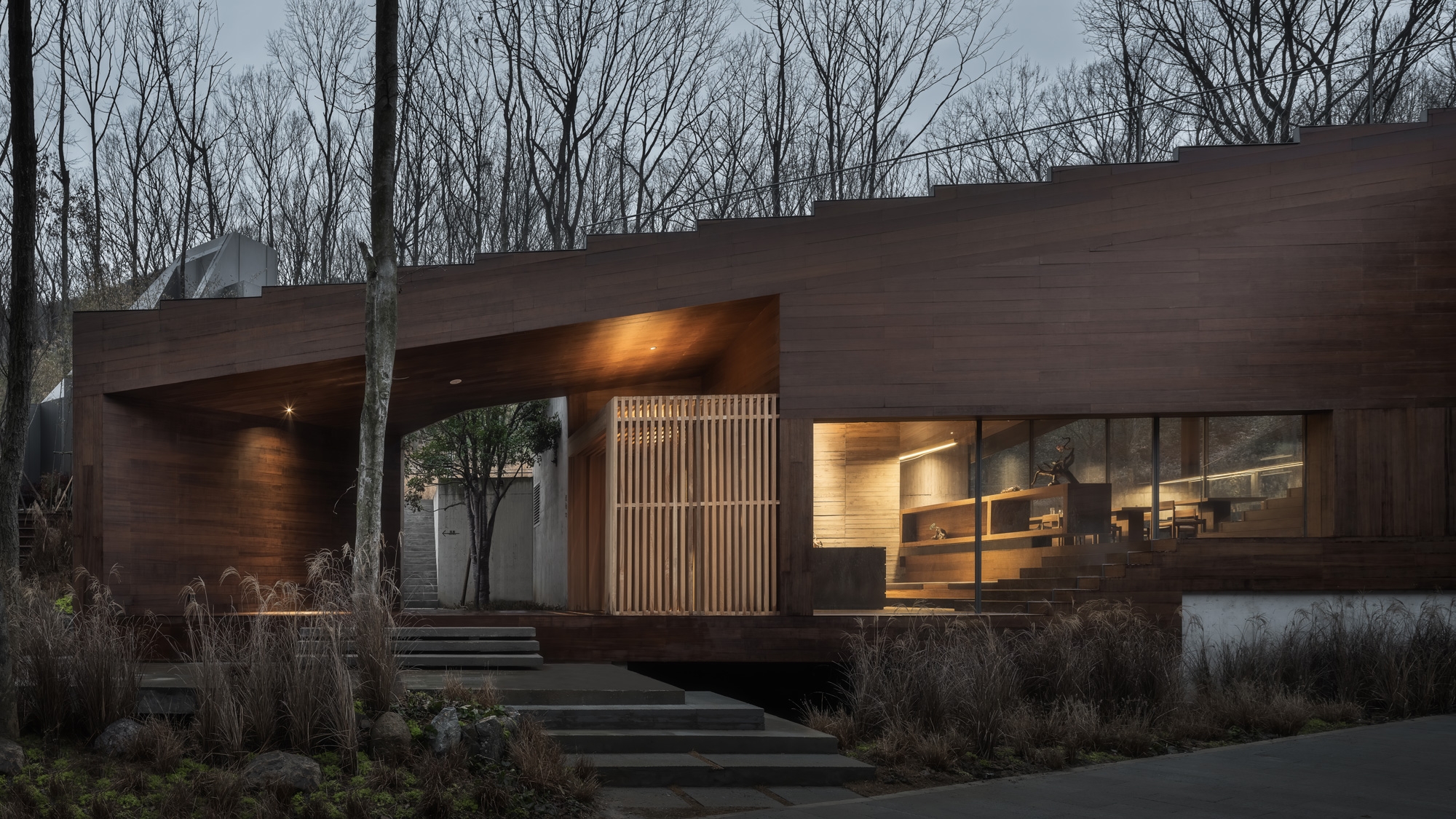 In a forest on the outskirts of Hangzhou, there is a unique leisure and vacation destination. The site consists of two connected rectangles. The building, shaped like a butterfly and connected by service spaces, features two V-shaped cuts facing the valley to introduce natural landscapes. The two sides of the building are embedded in the mountain, with the stream and mountain trail retained beneath. To preserve some trees, the vertical structure is designed as a "column courtyard," which serves both structural and spatial functions.