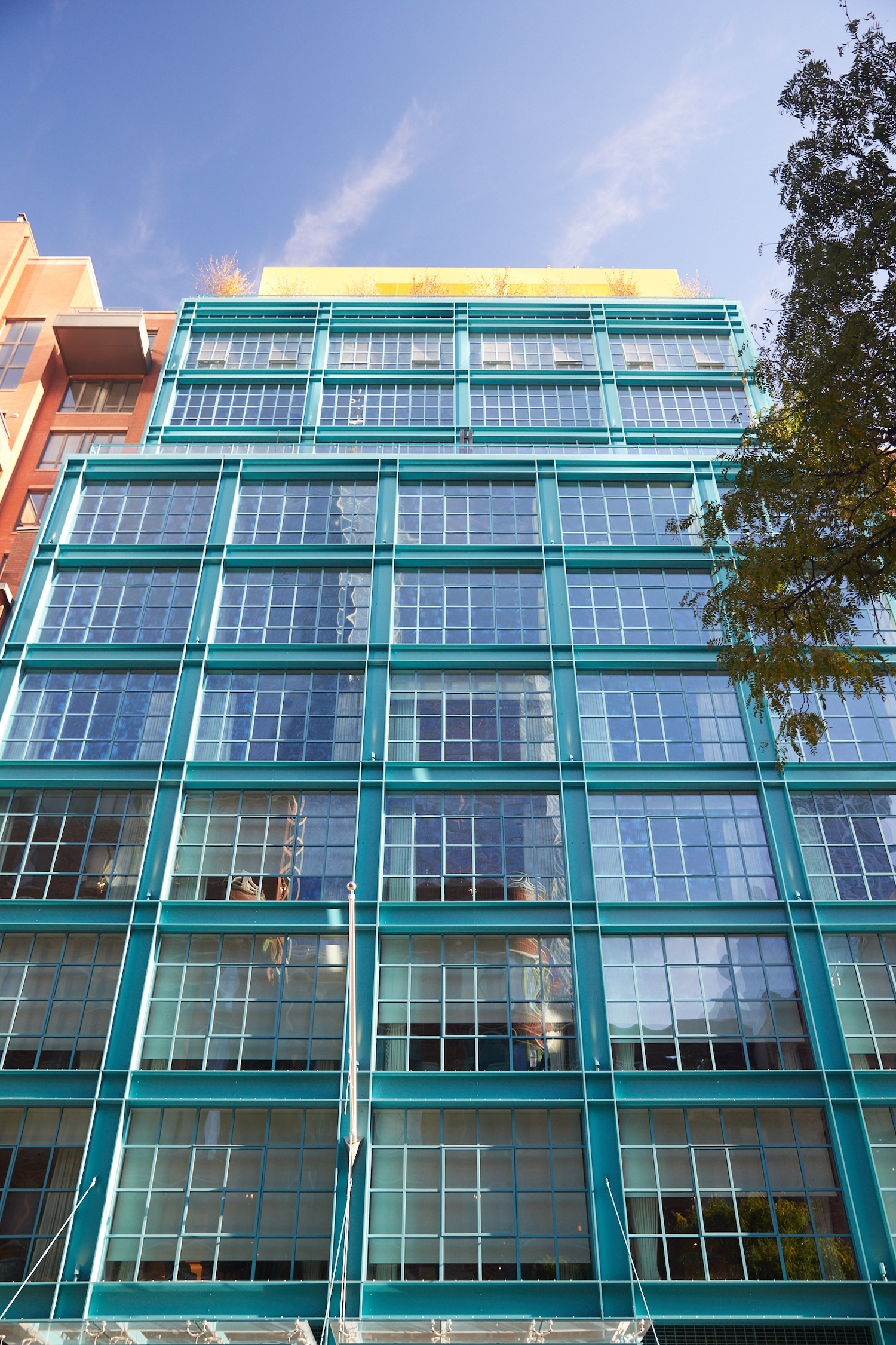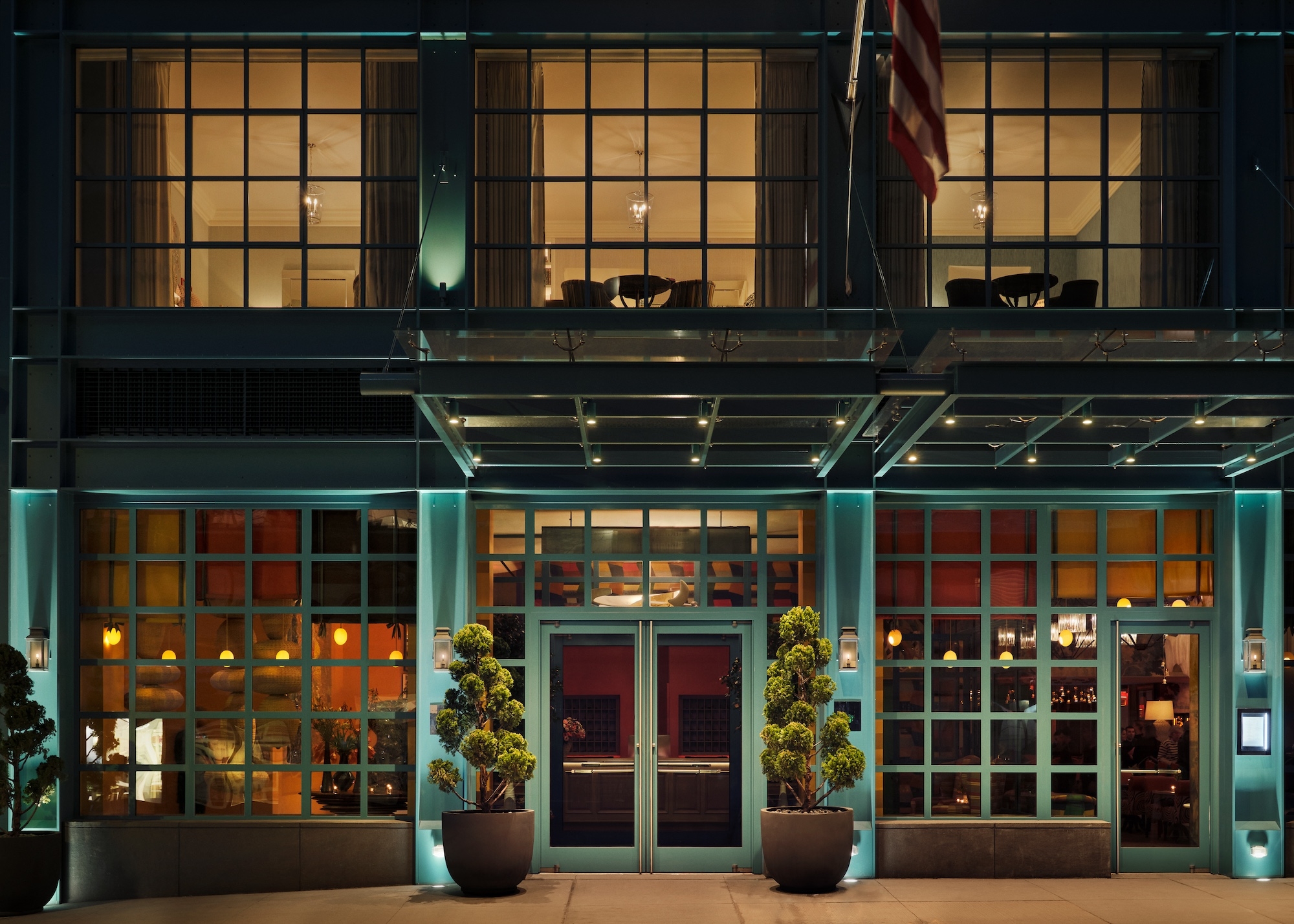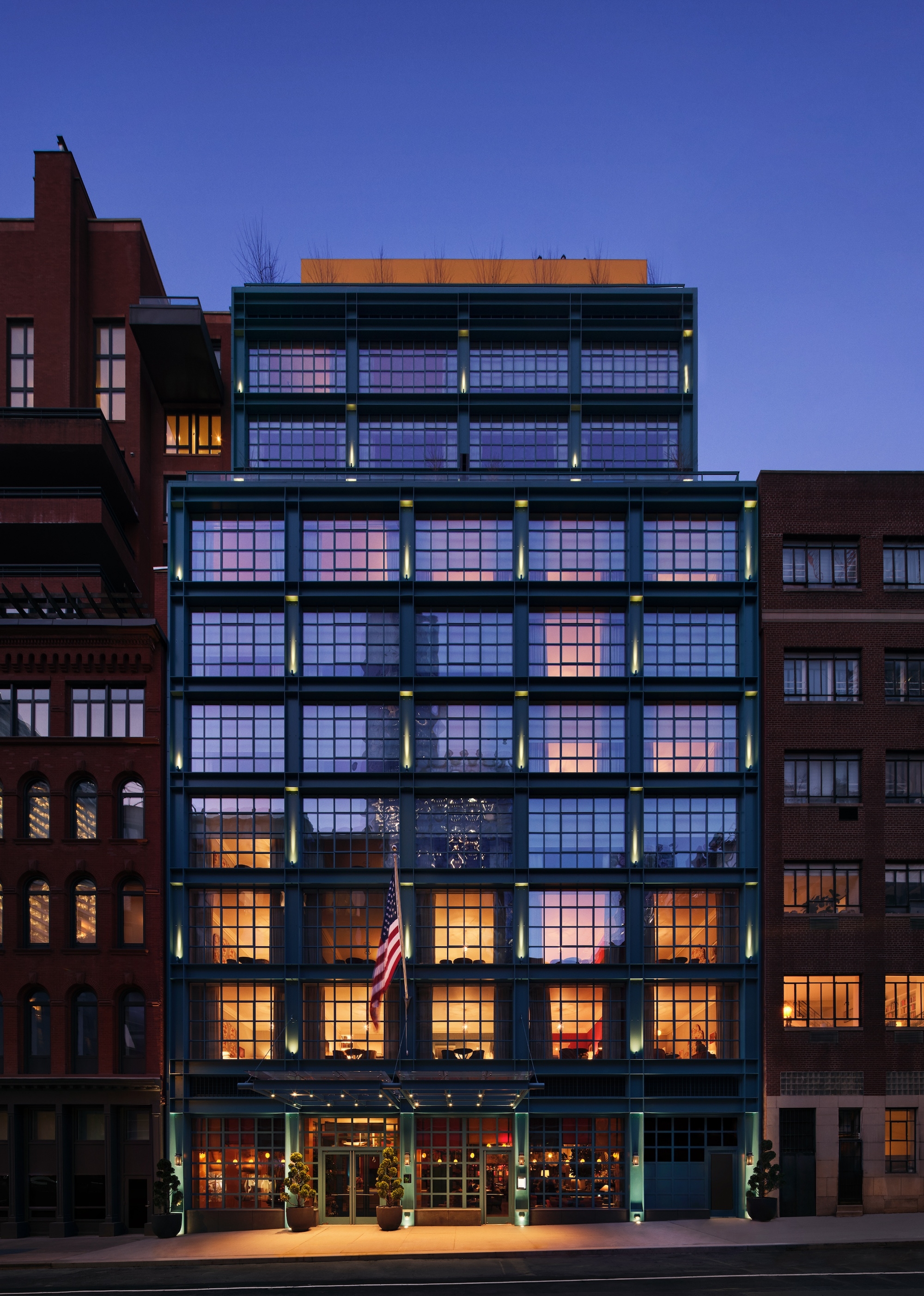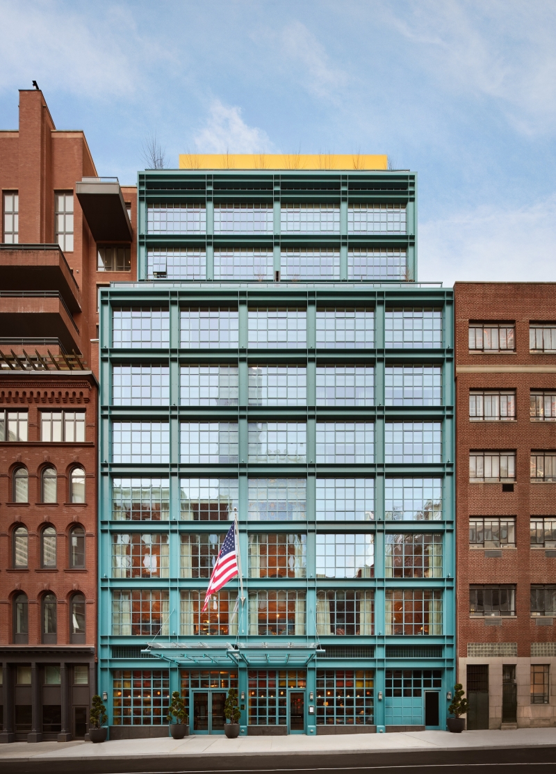The ground-up construction of the Warren Street Hotel is a remarkable addition to New York City's architectural landscape. The facade, characterized by its striking cyan blue framework and bright yellow rooftop, stands out in the Tribeca neighborhood, showcasing a commitment to pushing design boundaries. With a nod to Tribeca's industrial heritage, the facade incorporates expansive windows and high beams, creating a visually captivating structure. Through attention to detail and the use of modern materials, the architects ensured both aesthetic appeal and long-term durability. A cladding system of rainscreen metal panels layered atop a concrete structure produces shadows and reflections against the lively facade while filling the interiors with natural sunlight. The cladding, made up of metal extrusions, results in sharper edges, cleaner finishes, and a longer lifespan. Guests can also enjoy unobstructed views of the iconic World Trade Center and Lower Manhattan from the rooftop.