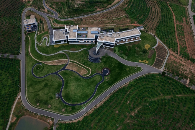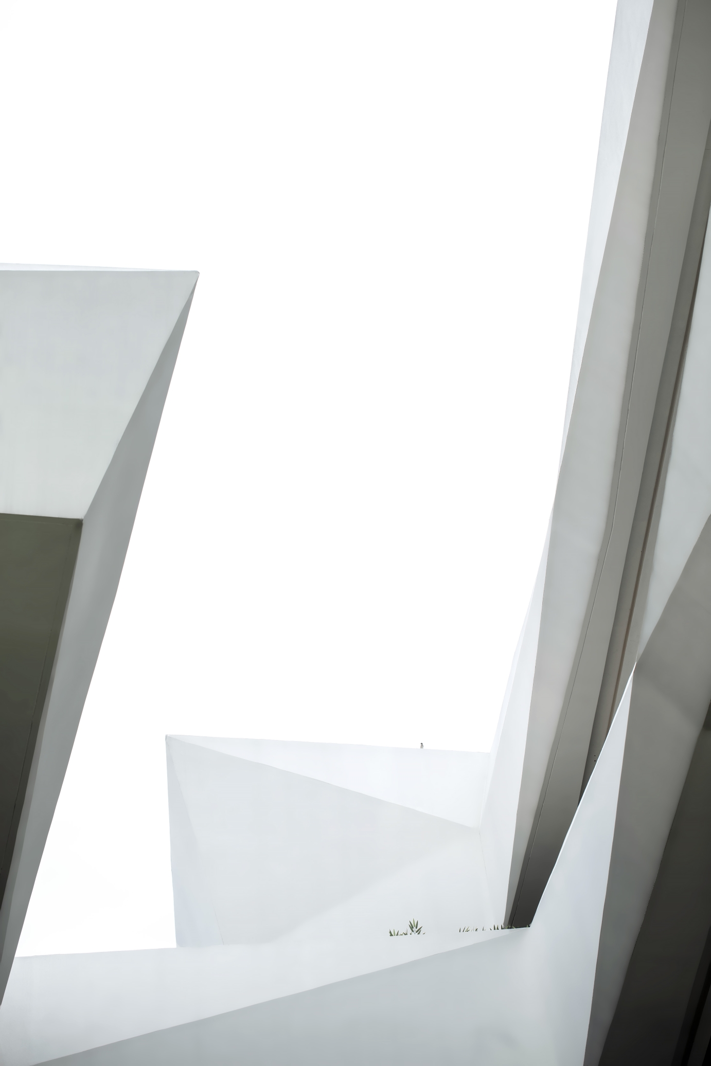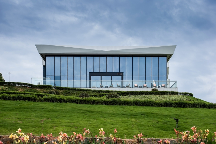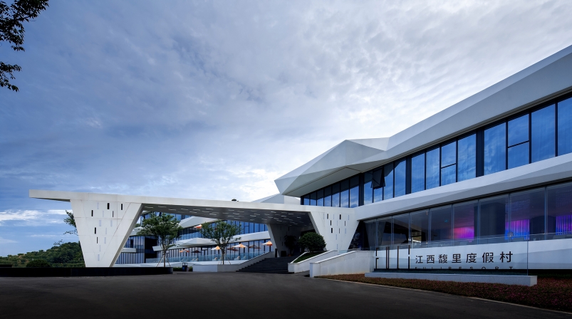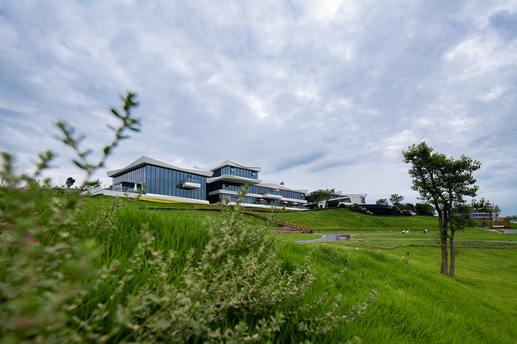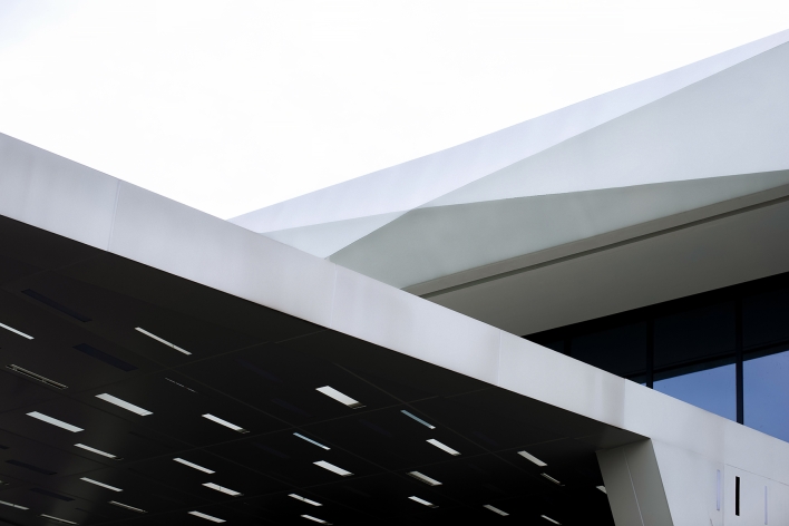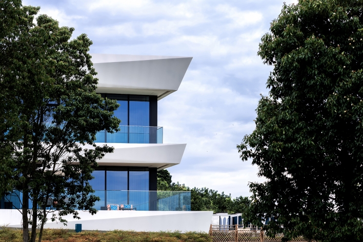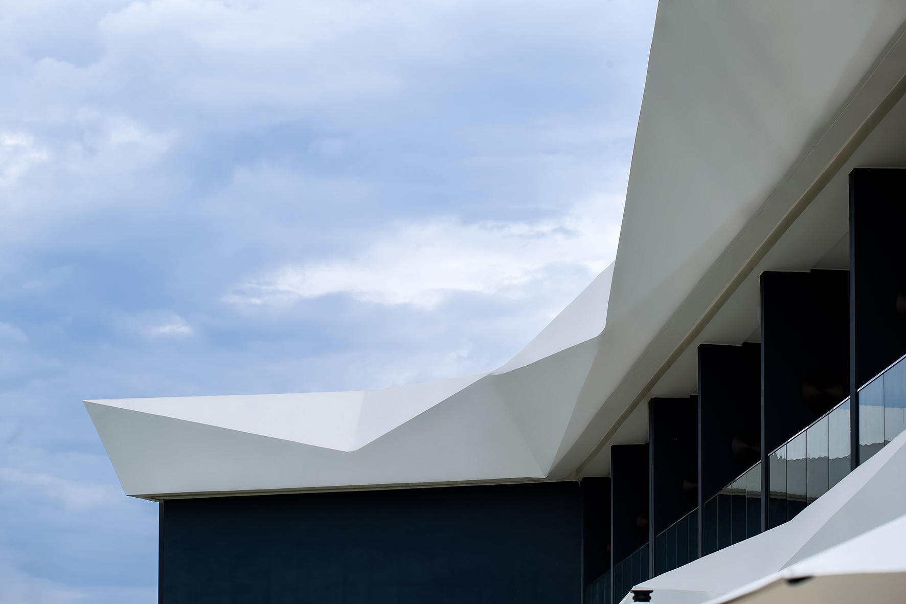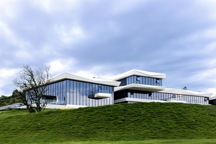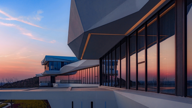 Lightweight architecture with horizontal floor slabs extending outward, connecting the main structure. The main body features full-height glass and white irregularly cut GRC, dark glass softens verticality, white GRC stands out as a visual focal point, harmonizing with the mountain.