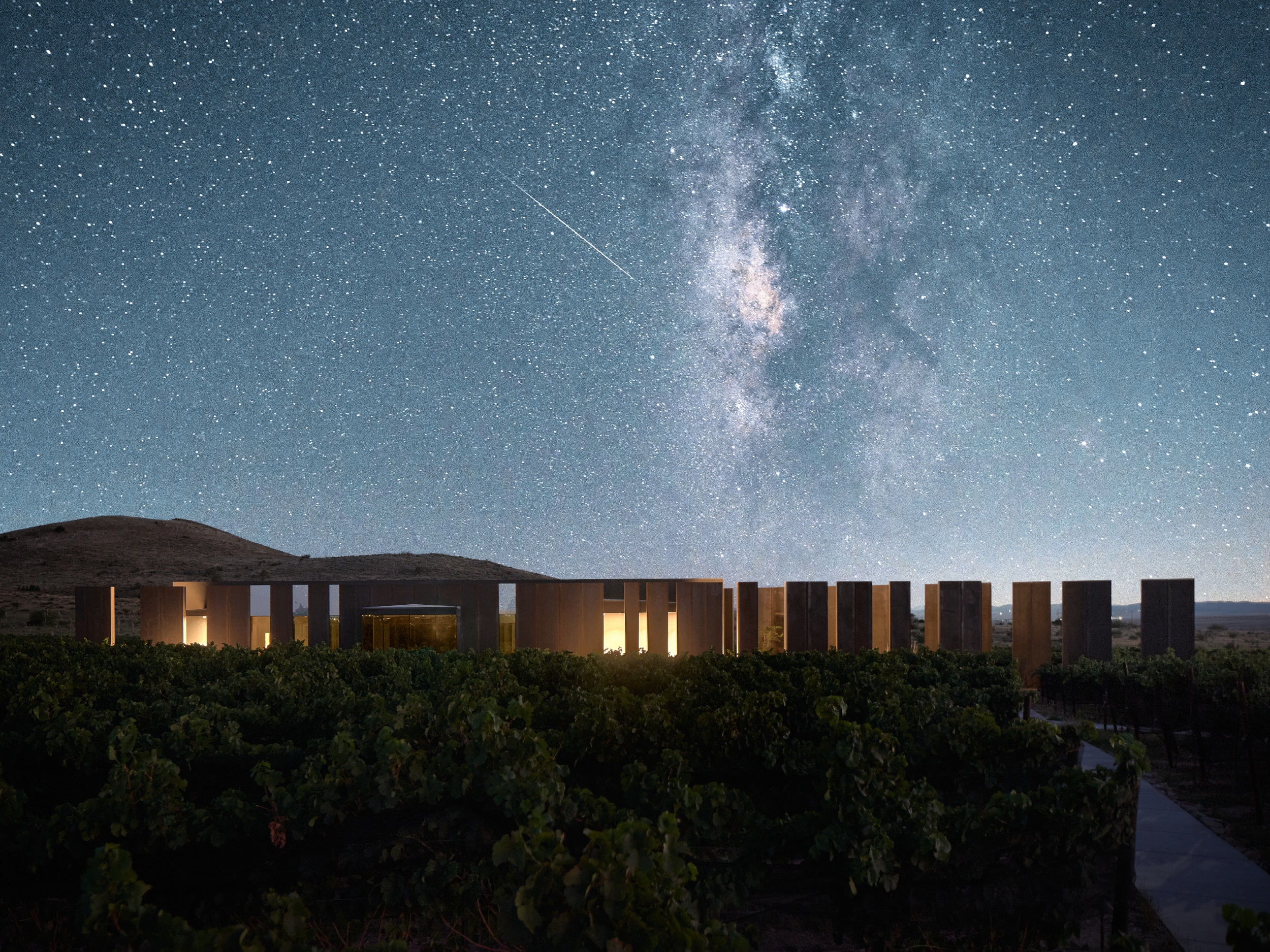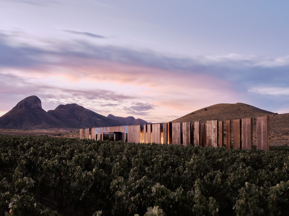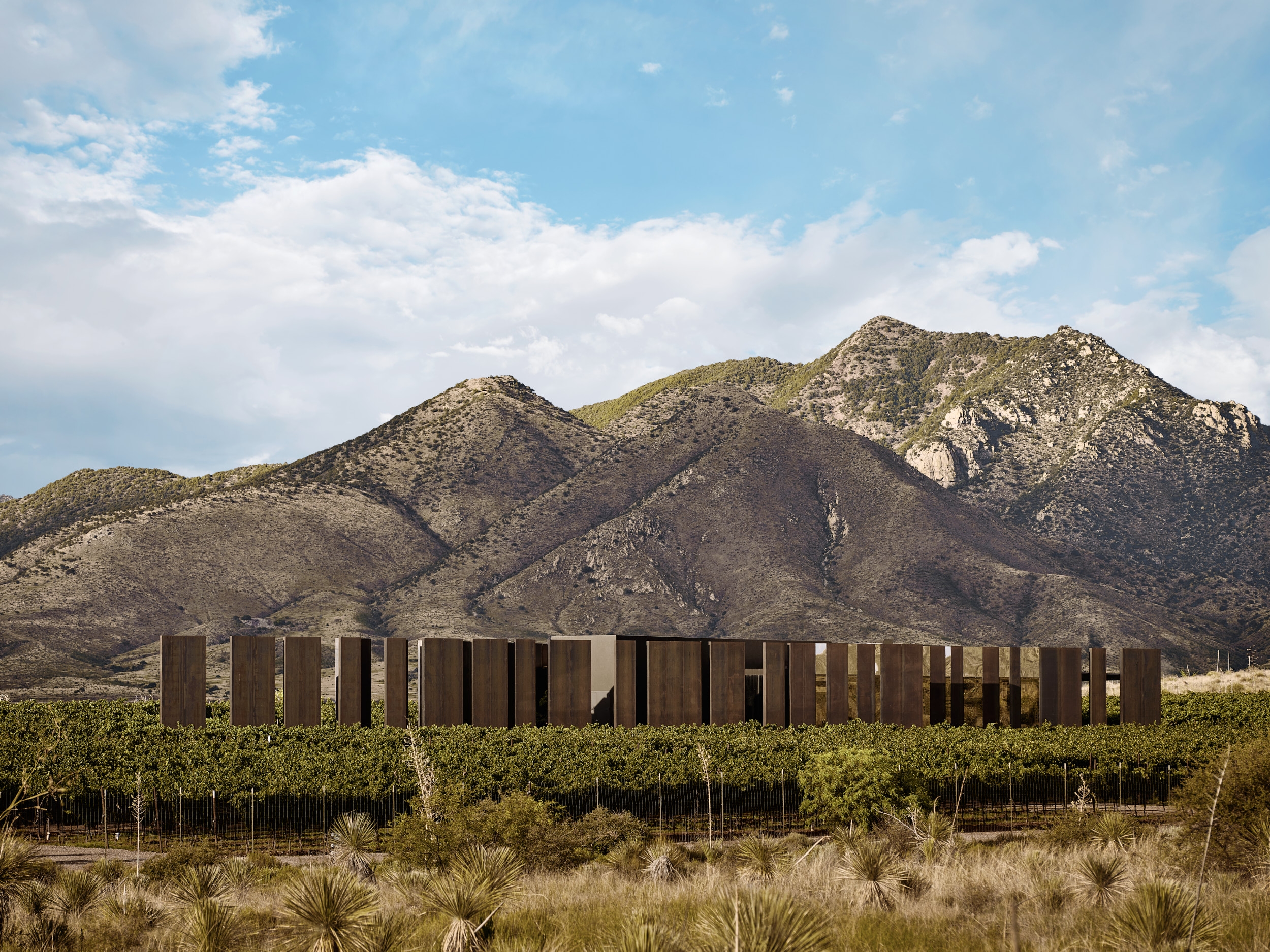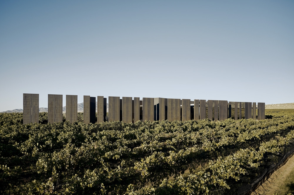 The design complements the striking landscape, an unspoiled swath of grasslands, mountain peaks, and a working vineyard. The resulting space takes the form of an abstraction in the landscape that is perceived as a large-scale art installation crafted in harmony with the terrain.