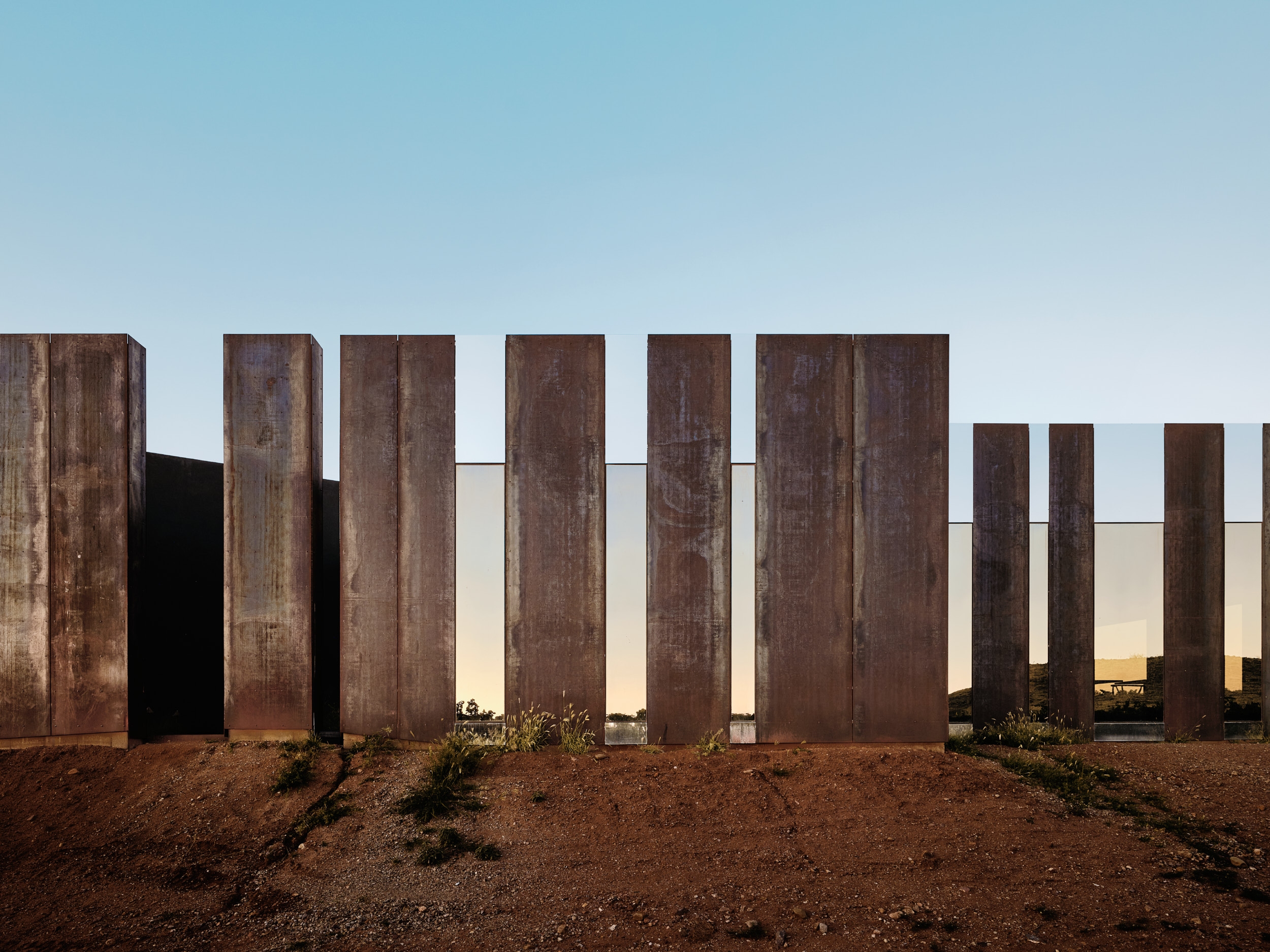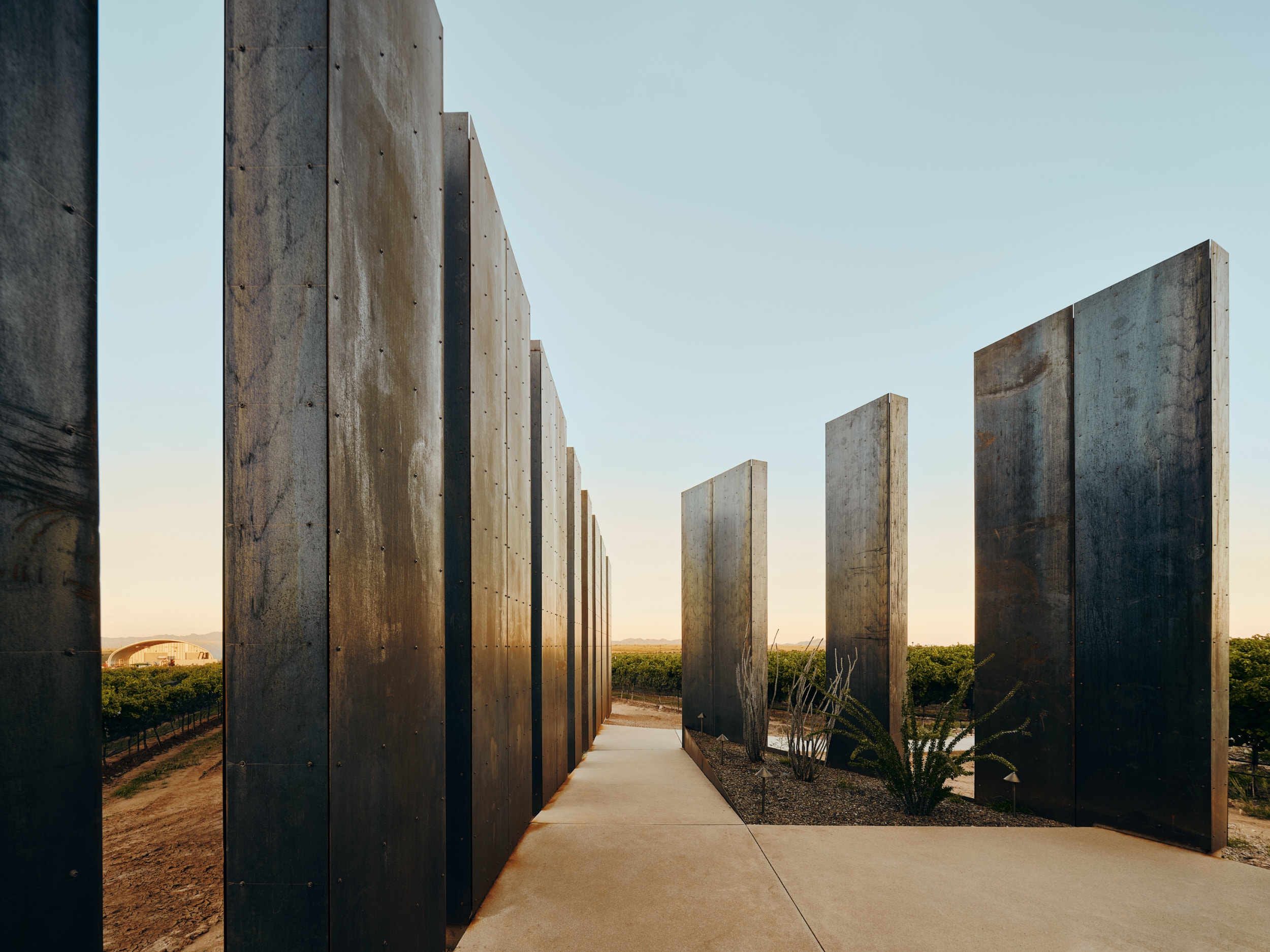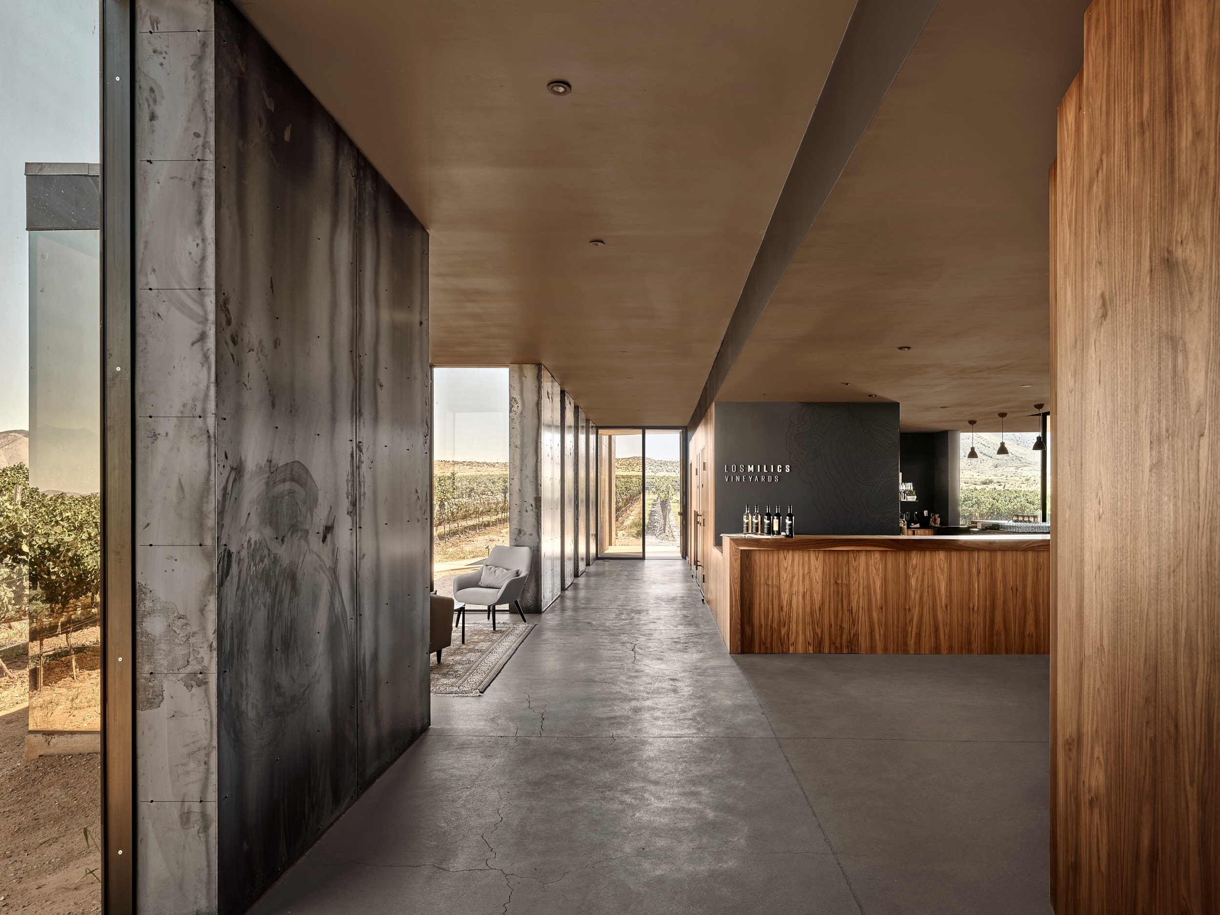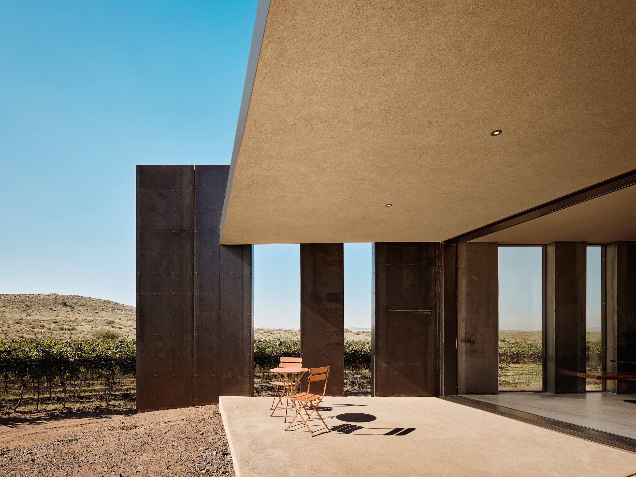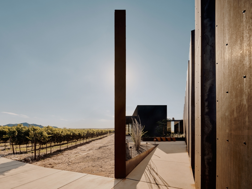 The weathered-steel panels surrounding the tasting room accentuate the horizon, while creating a dynamic experience as their appearance shifts dramatically throughout the day and changing seasons. The steel panels line the entryway to the tasting room, an expansive glass box oriented to the mountains. The tasting room reframes the landscape through the experience of taking away, suspending, and then reintroducing the iconic peaks.