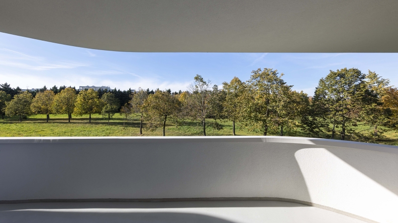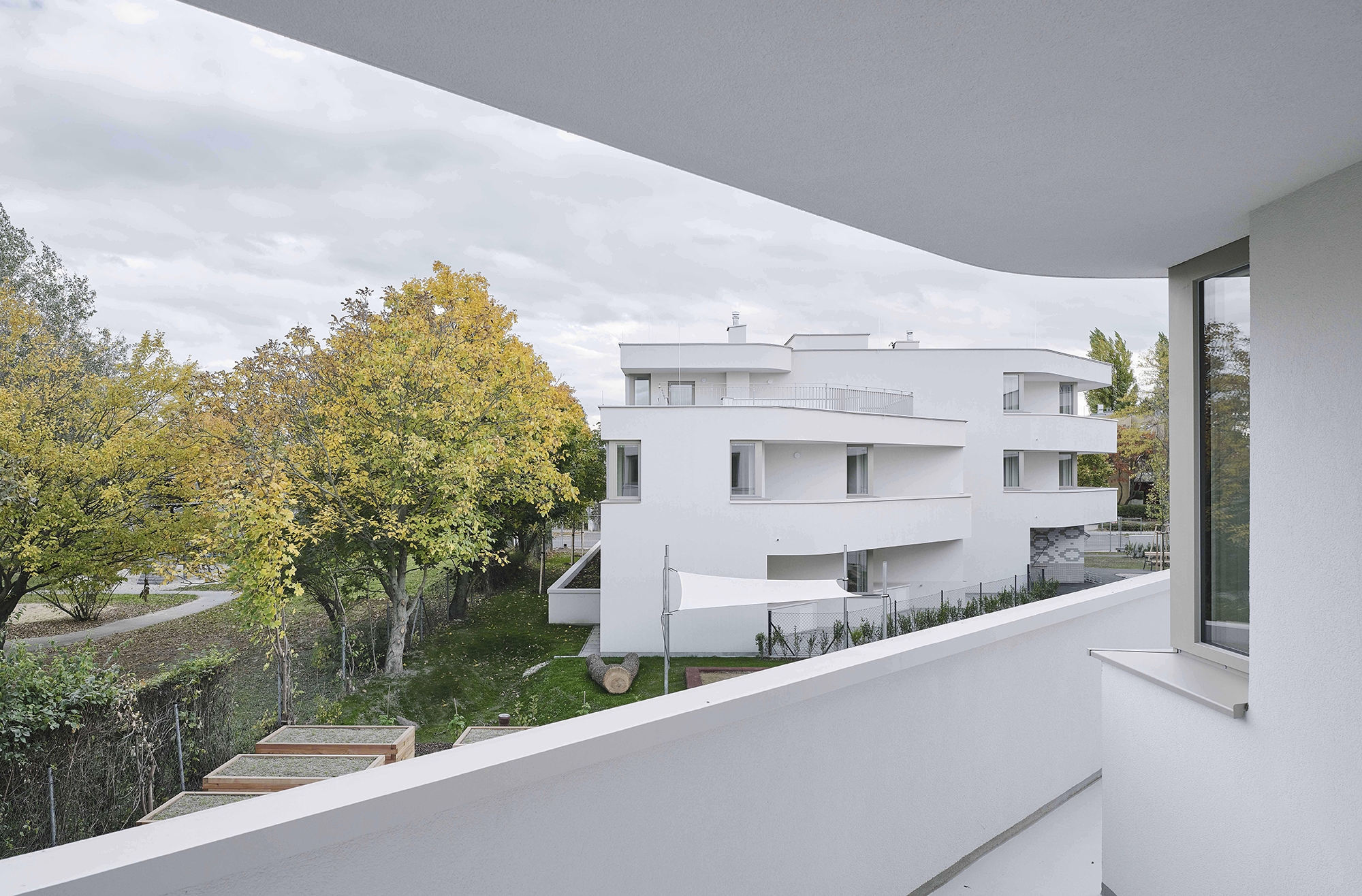 The sinuous composition of generously proportioned balconies arises directly out of the logic of the saw-toothed plans. The stucco facades are rendered into a structured pattern of finely fluted and smoothly screed finishes. These subtly contrasting surface variations emphasize the project's sculptural lines and lend a tactile, hand-crafted quality. Selected surfaces are clad in patterns of glazed, multi-colored bricks, which endow the estate with a touch of warmth, and delicacy.