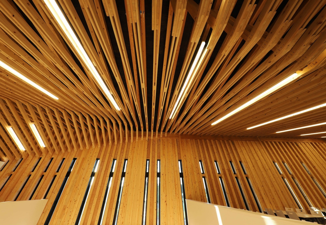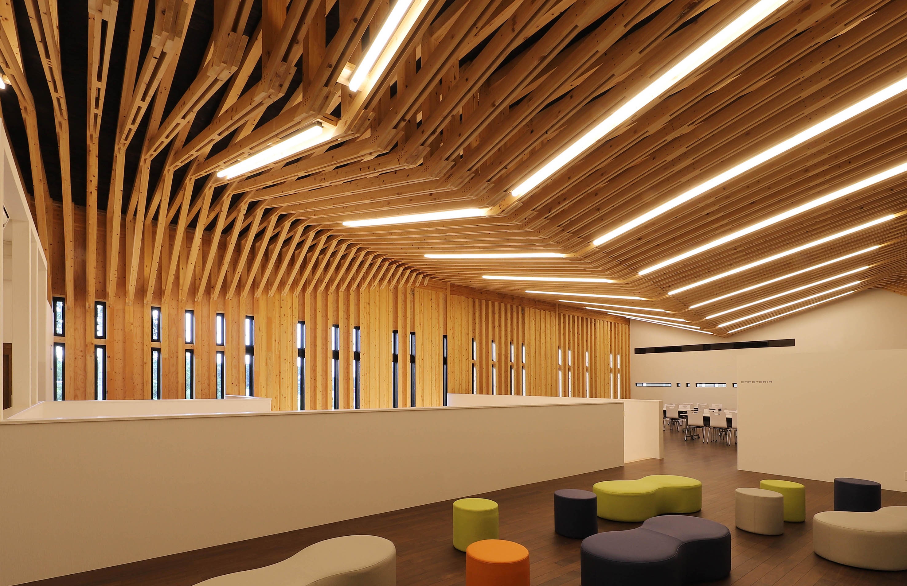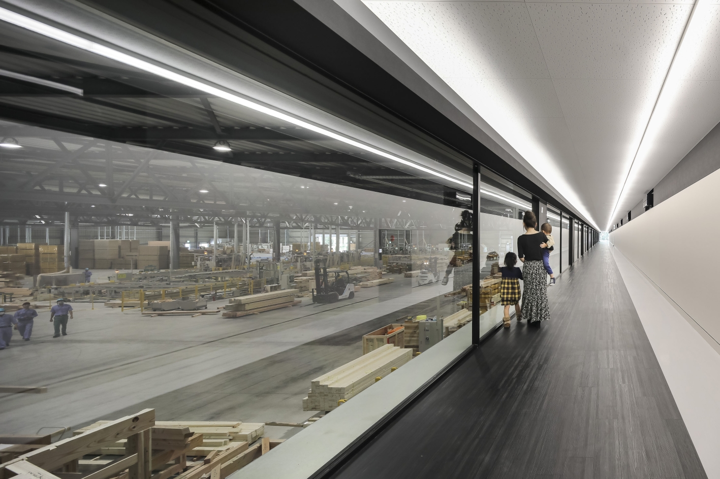 A nearly 100-meter-long viewing aisle, encased in a random stripe wooden shell, is cantilevered and appears to float from the factory wall. This striking façade design, with a sense of acceleration and speed, symbolizes Aida Sekkei’s future evolution. The plant highlights the company’s advanced precut methods and stands as a testament to its commitment to innovation and excellence in timber construction, aiming to inspire ongoing growth and development.