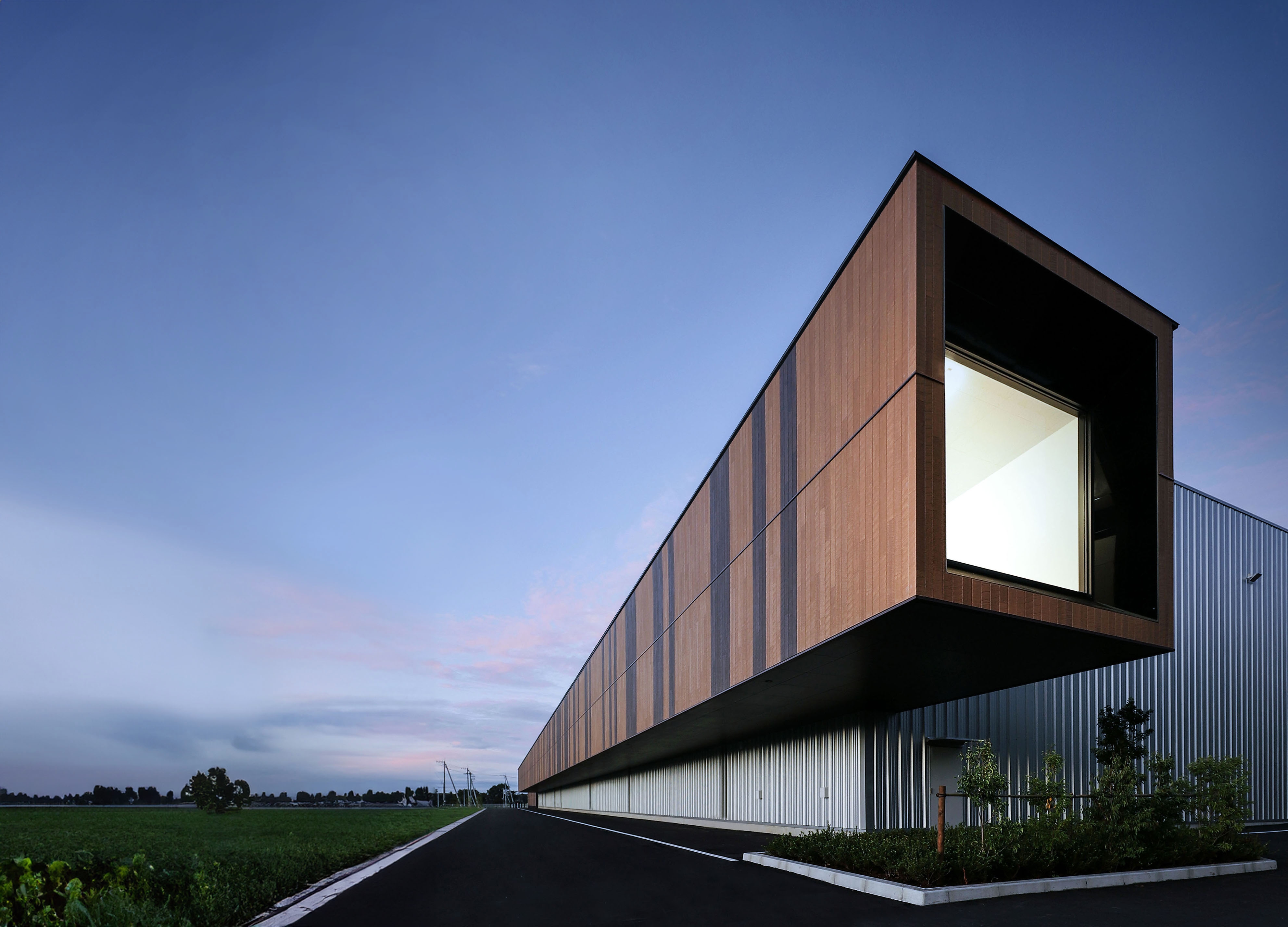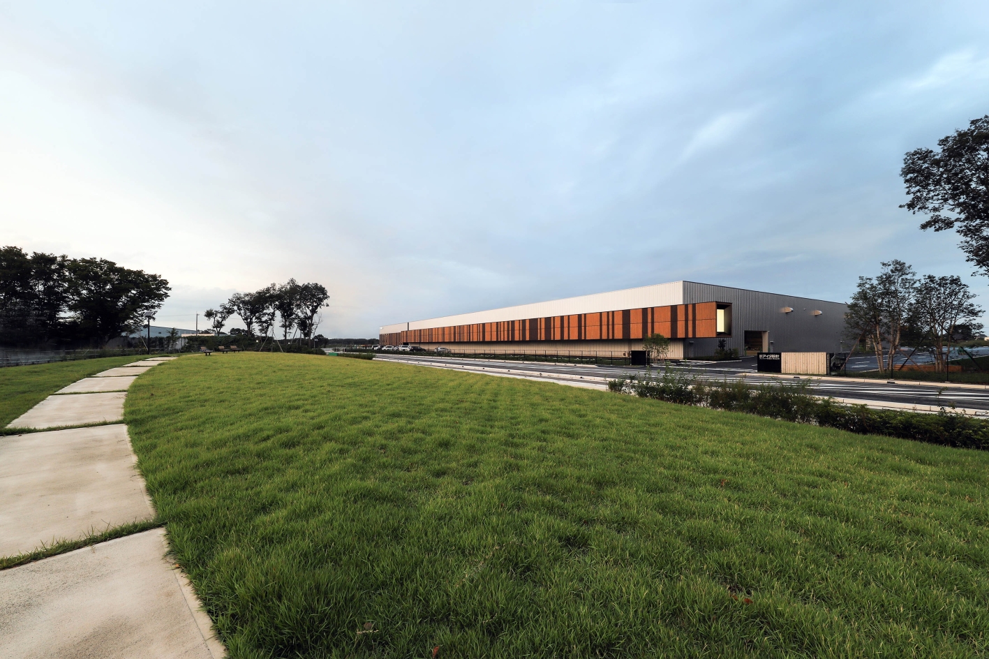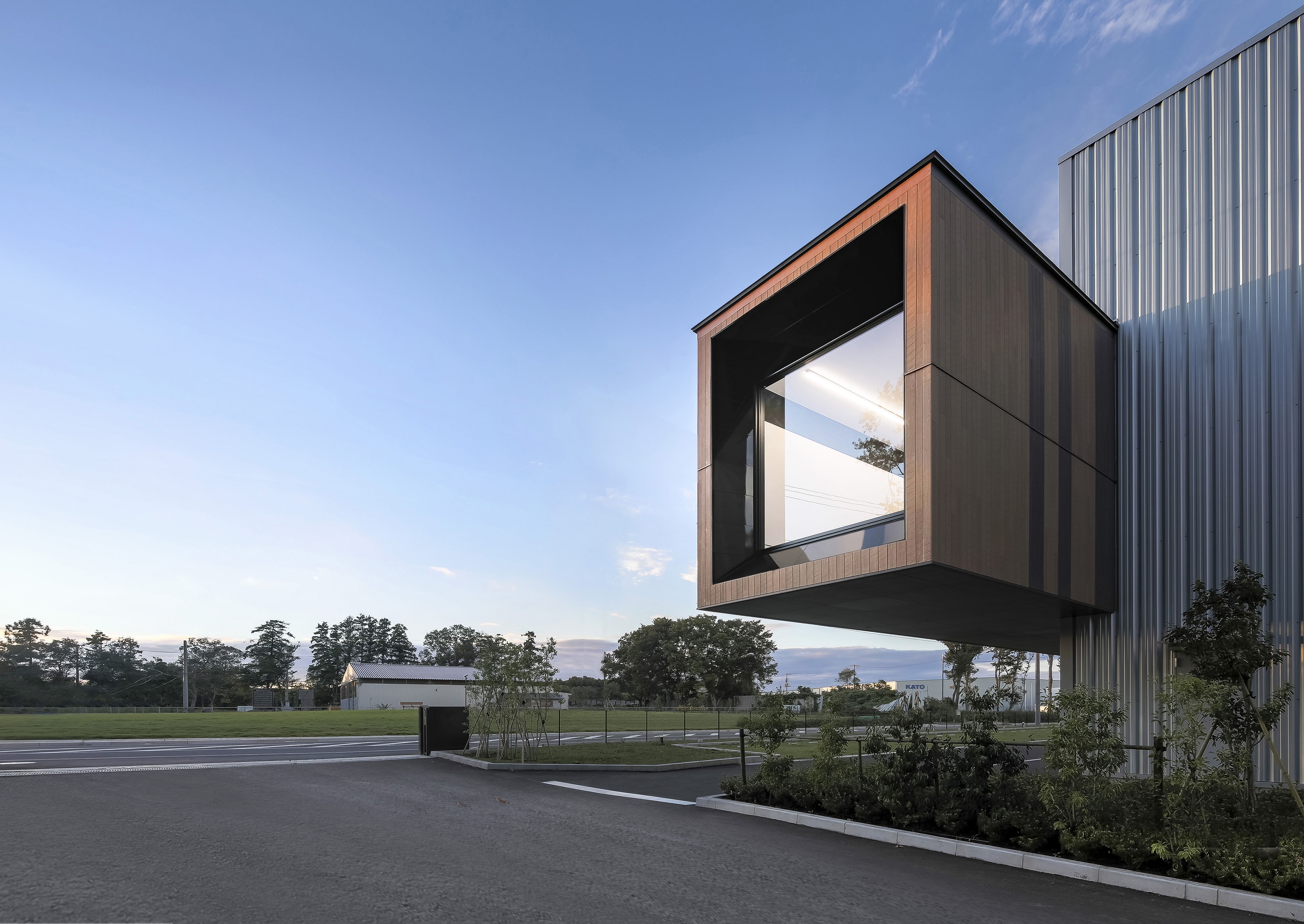 The architectural design aims to manifest Aida Sekkei’s corporate identity and inspire its future. The 130m x 100m x 10m building features subtly shifted masses to create functional spaces, including viewing aisles, truck berths with wide canopies, and offices. This layout, while simple and practical, enhances utility.