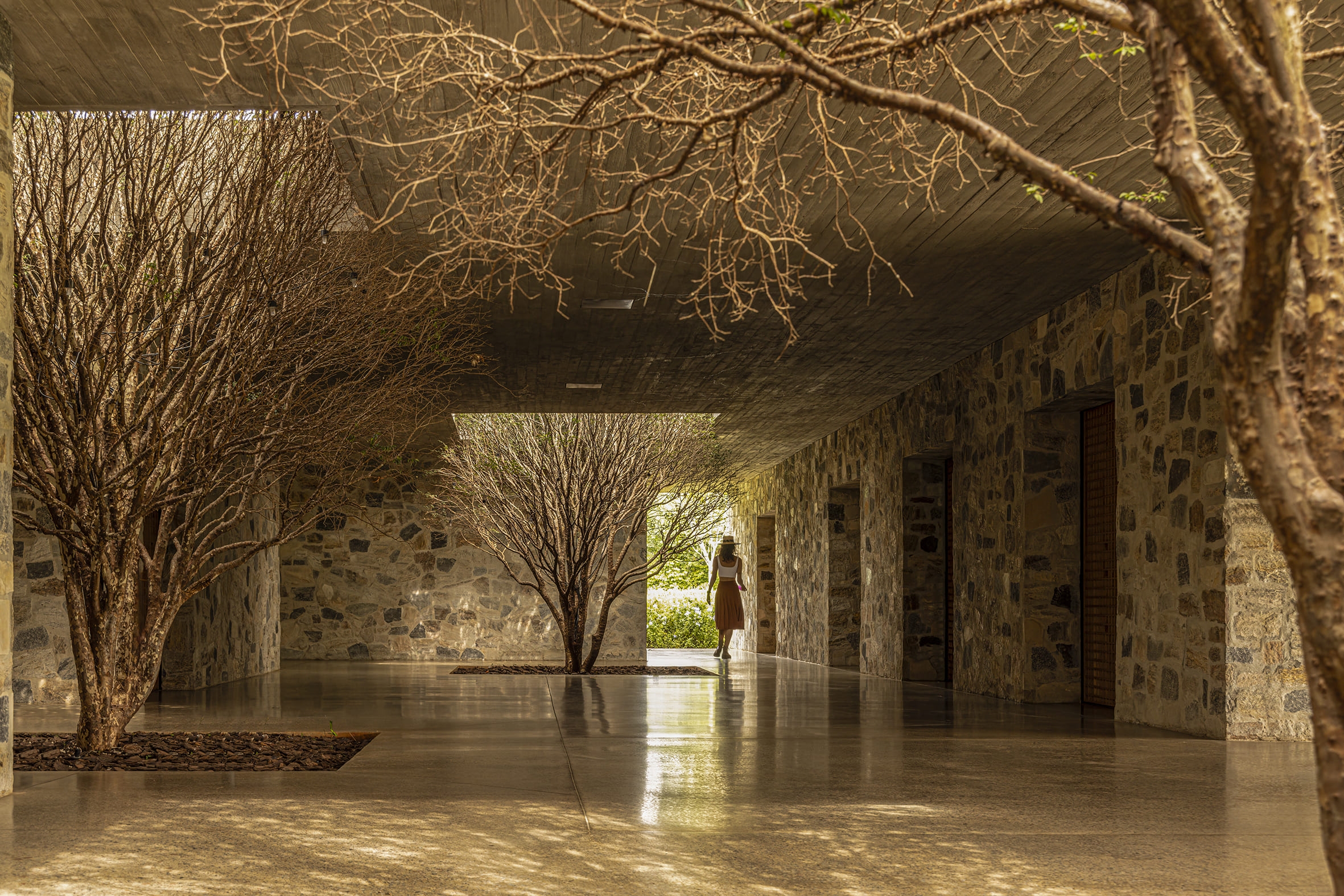 As one stroll through the opaque volumes, entrances and viewpoints can be discovered, inviting new explorations to unfold. The spaces are drawn with unexpected natural light coming from the ceilings and with berry trees shadows screening over the walls and floor.