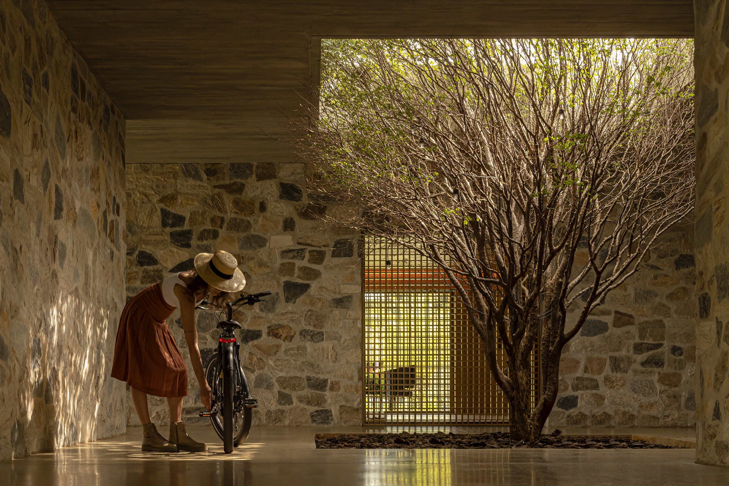 A warmer glow comes from squared openings on the rustic stone walls, where mashrabyas sliding panels let the internal light out and mark the entrance to each room.