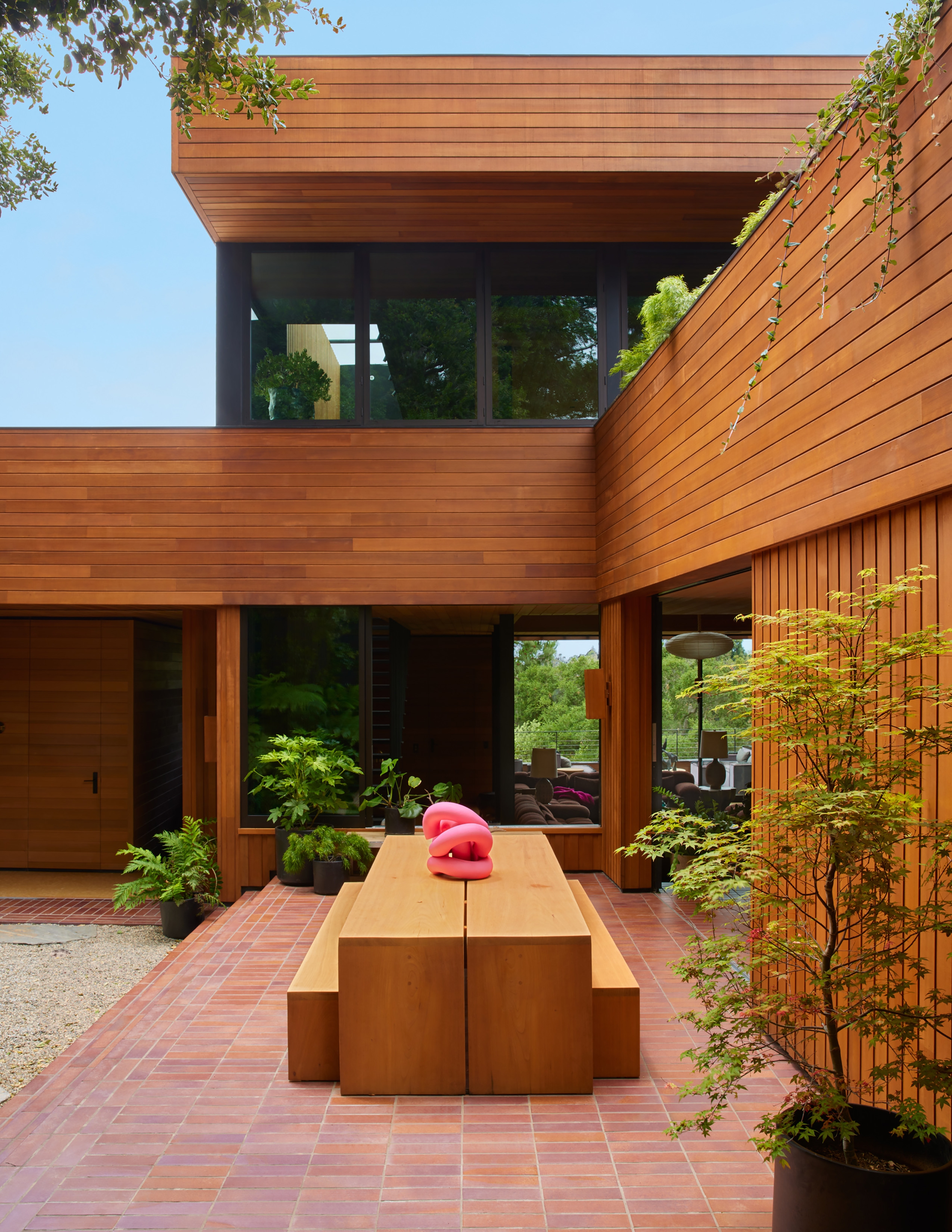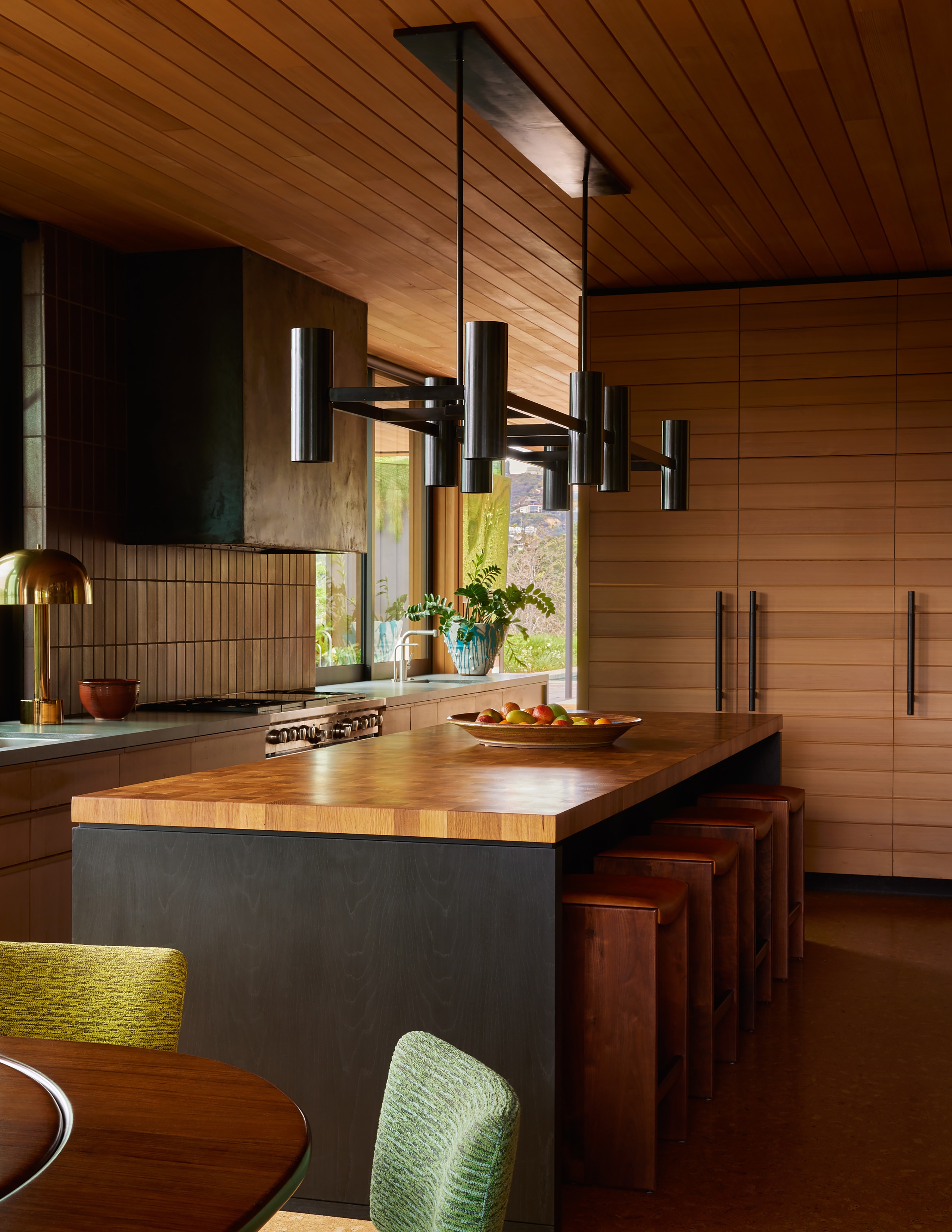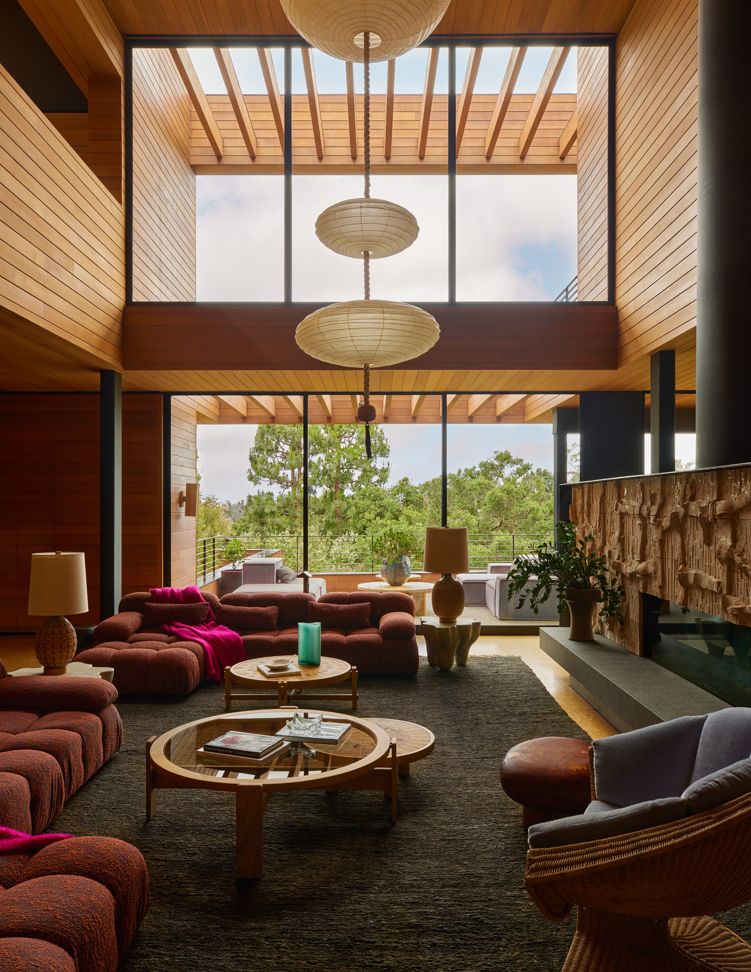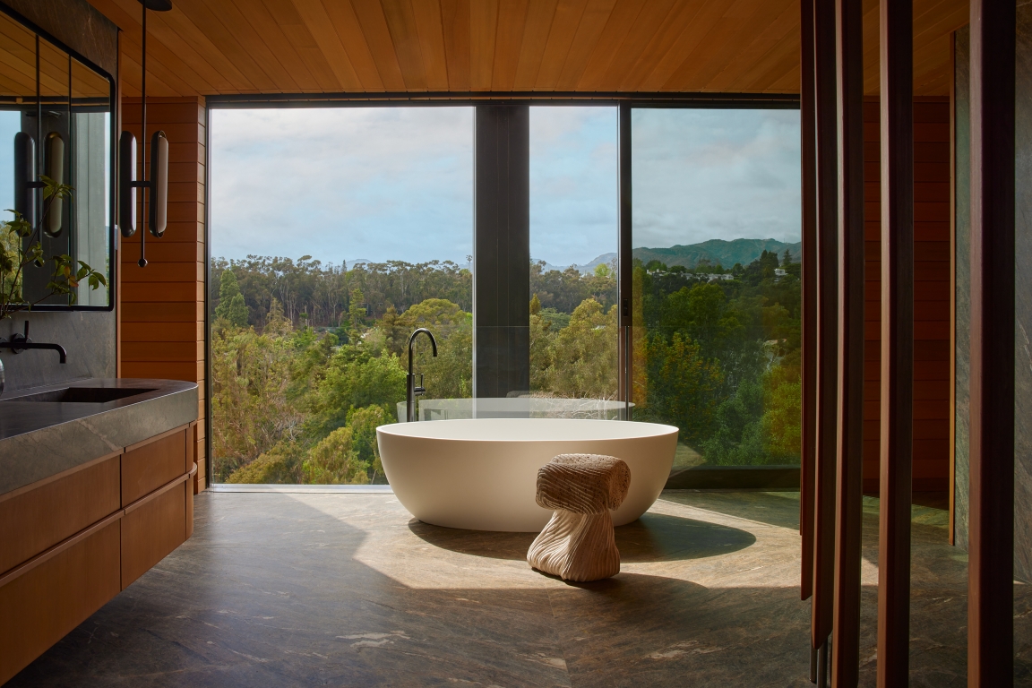 Perched on the crest of a westward canyon, this residence exudes a serene, treehouse-like ambiance, seamlessly integrating with its natural surroundings. Situated in a lush, wooded neighborhood, home to modernist houses by architects such as Ray Kappe and Richard Neutra, the design honors this heritage with principles of organic modernism.