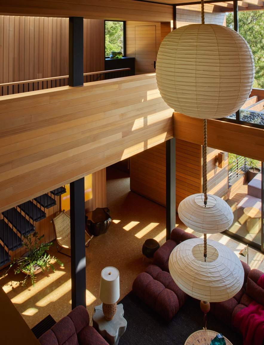 A primary objective was to create outdoor connections at multiple levels, harmonizing with the existing topography and hillside. The use of low-carbon Western Red Cedar cladding enhances material sustainability, while fostering biophilic engagement. Terraced softscapes with native, drought-tolerant plants optimize site permeability, and overhanging trellises reduce solar heat gain. On the main floor, operable sliders along the north-south axis harness prevailing southwest winds, facilitating passive cooling while accentuating the immersive experience of living among the trees. The living areas are designed to flow effortlessly onto an expansive deck, creating a seamless transition between interior and exterior spaces. The upper floor houses the primary sleeping quarters offering views of the Pacific Ocean and Santa Monica Mountains.