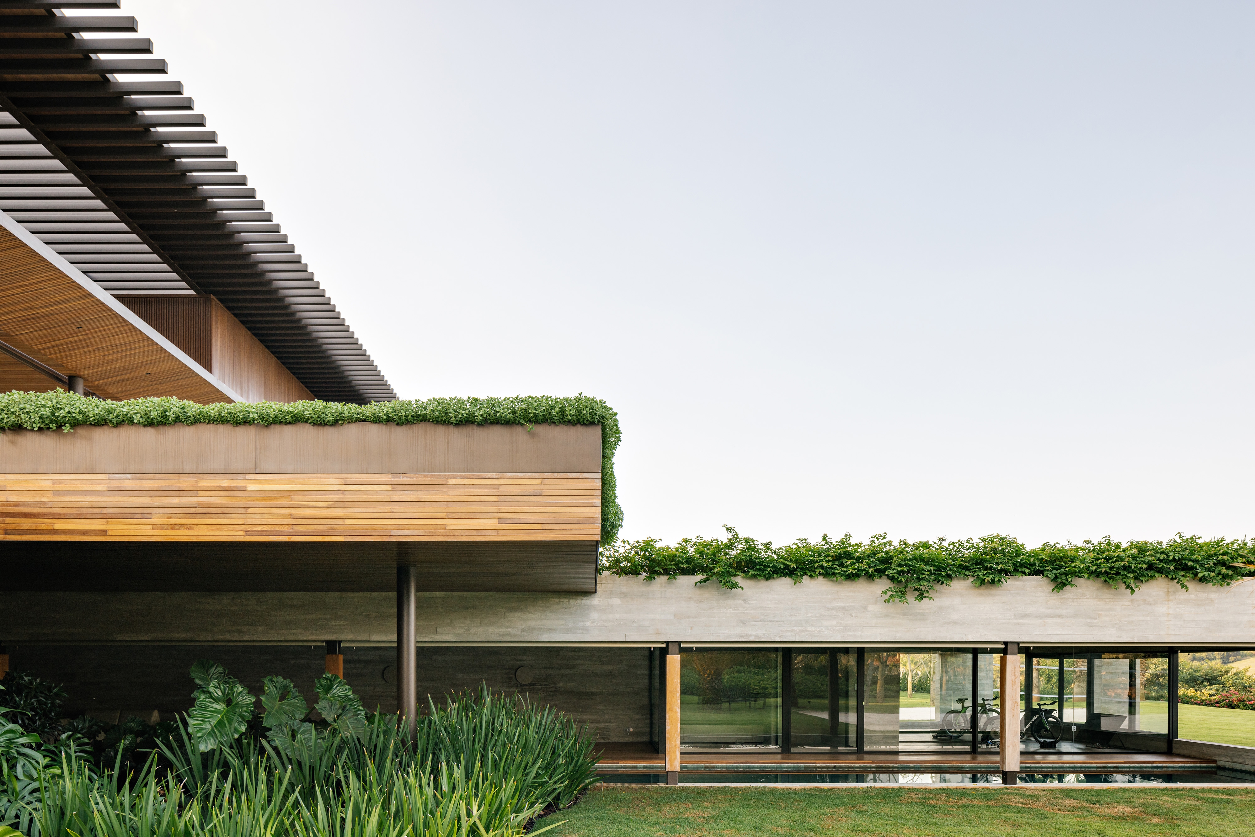 The implementation of green roofing establishes a visual continuity between architecture and landscape. The concept of implementation arises from respect for the topography and gently integrates by positioning the main block and adjacent blocks, resulting in a lightweight volumetrics.Highlighting the slender lines drawn by the metal structure of the upper eaves, we emphasize a horizontality in the ensemble, balancing the scale of a house where the large footage and the verticality of 3 floors challenge the precision required to create the correct proportion in each environment.