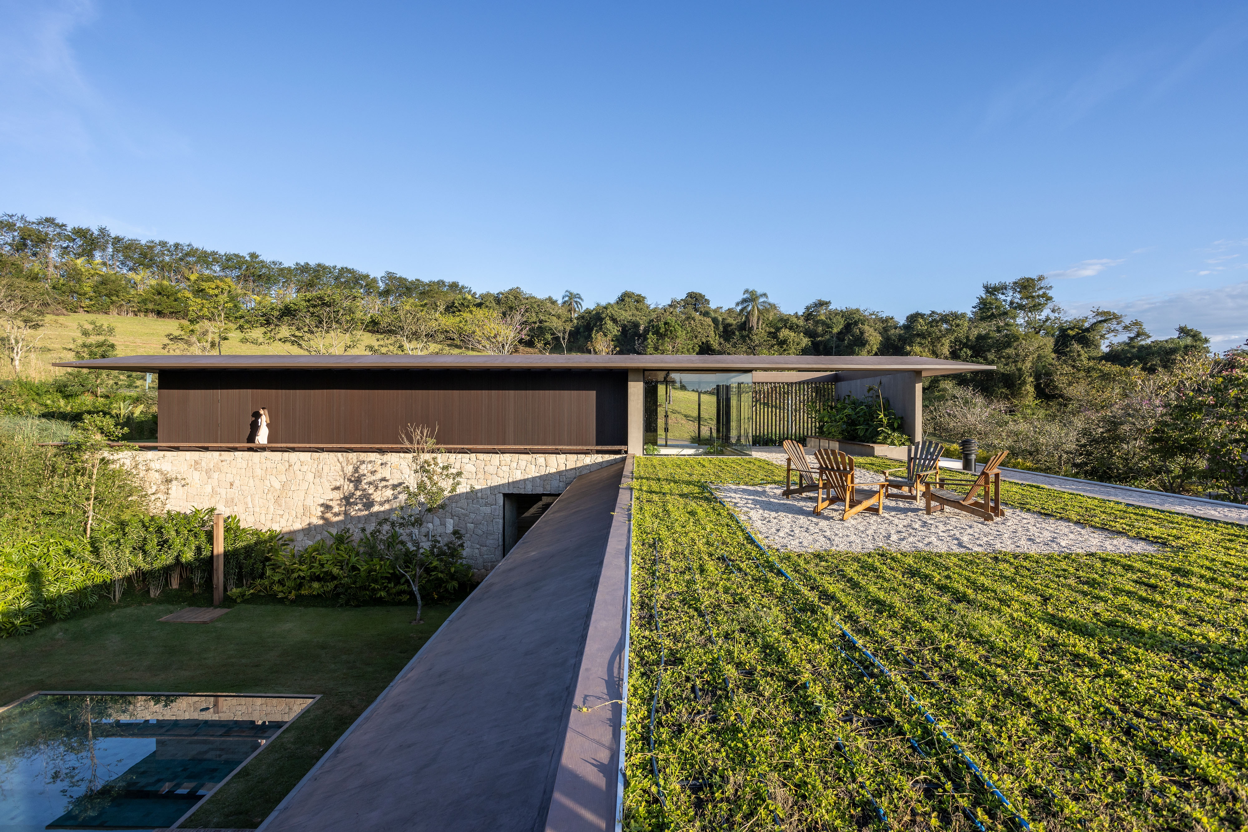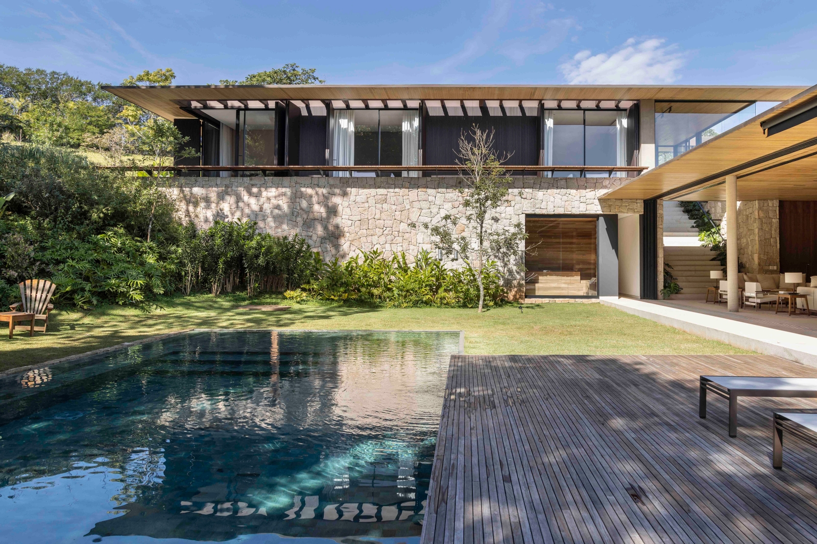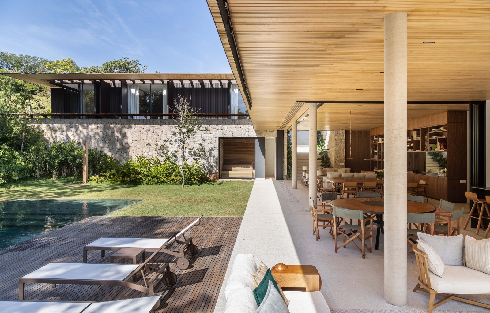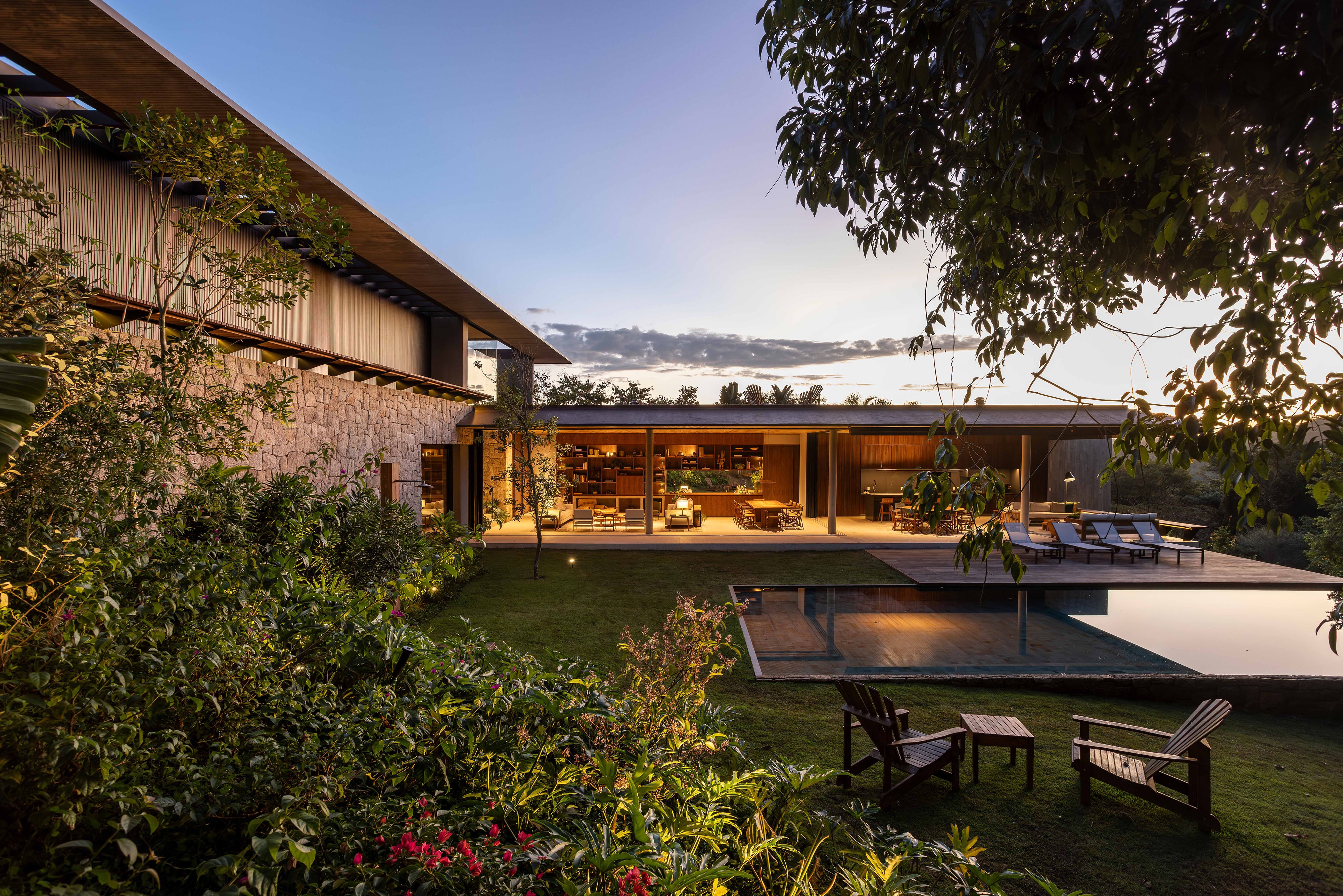 The LS Residence stands out for its masterful adaptation to a sloping terrain. The initial impression reveals a single-story house, but upon entering, it unveils itself in two levels: the private area on the upper level and the social area below, integrated with the leisure area. An L-shaped floor plan organizes the spaces, providing a functional and dynamic distribution.