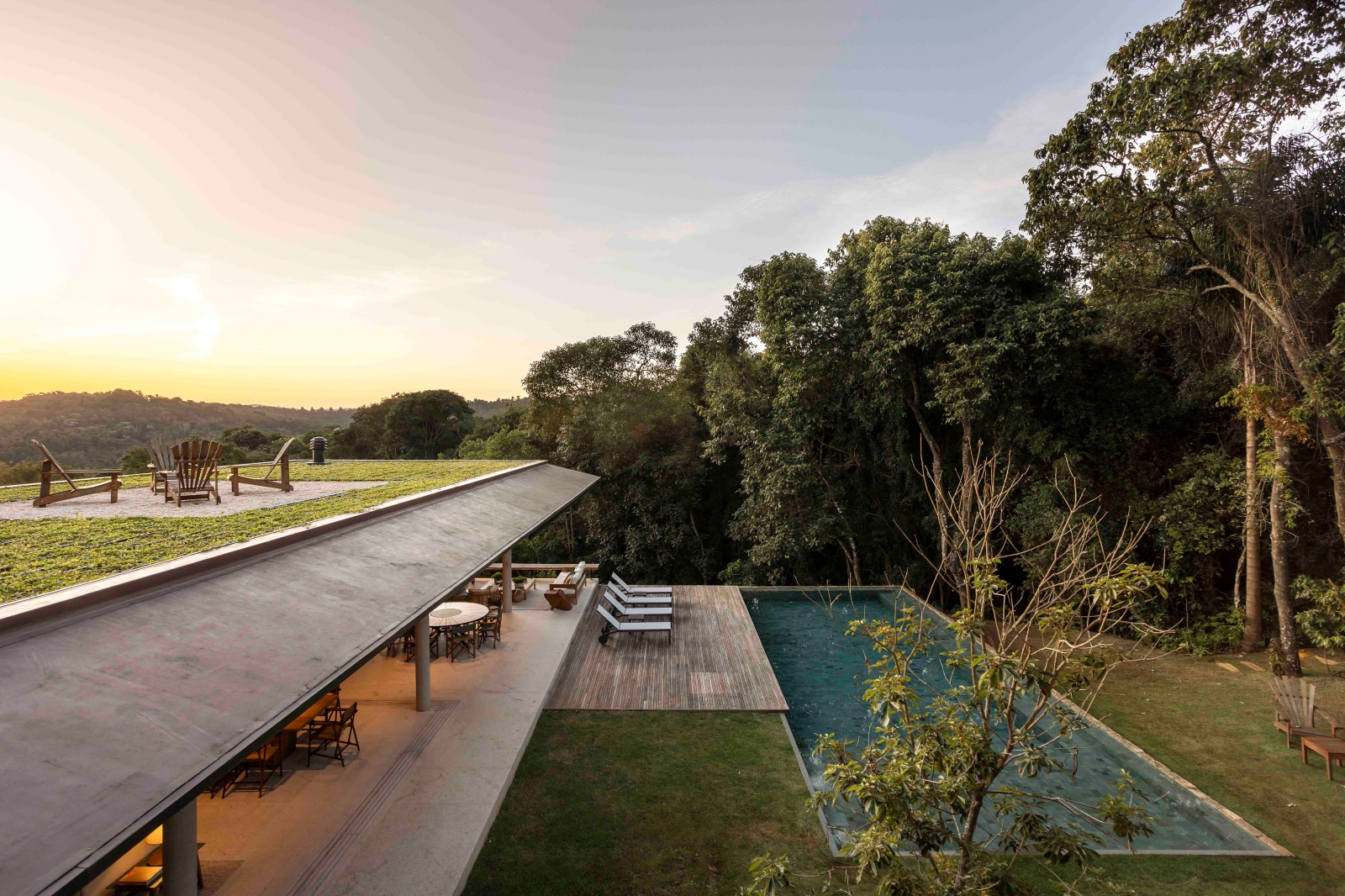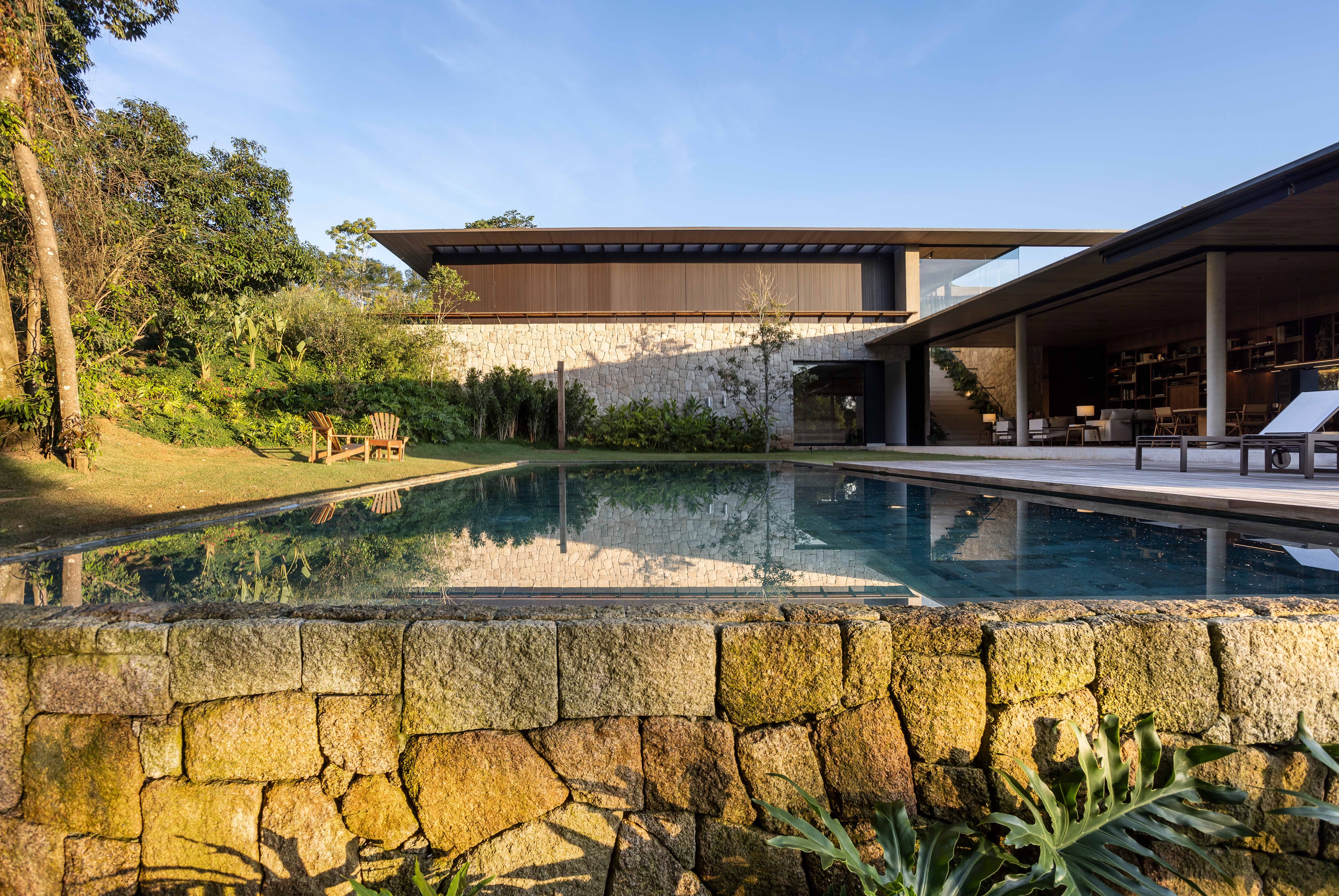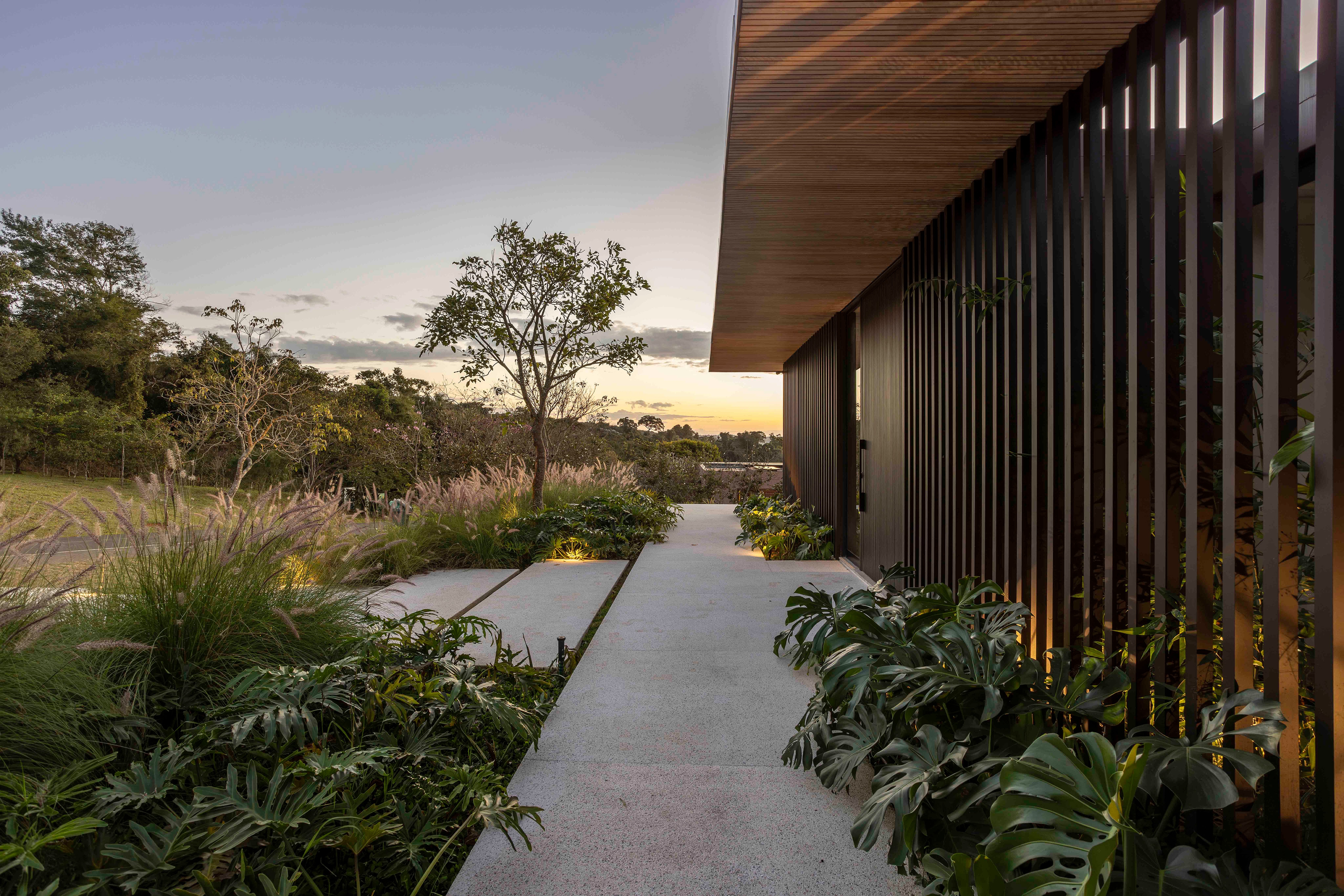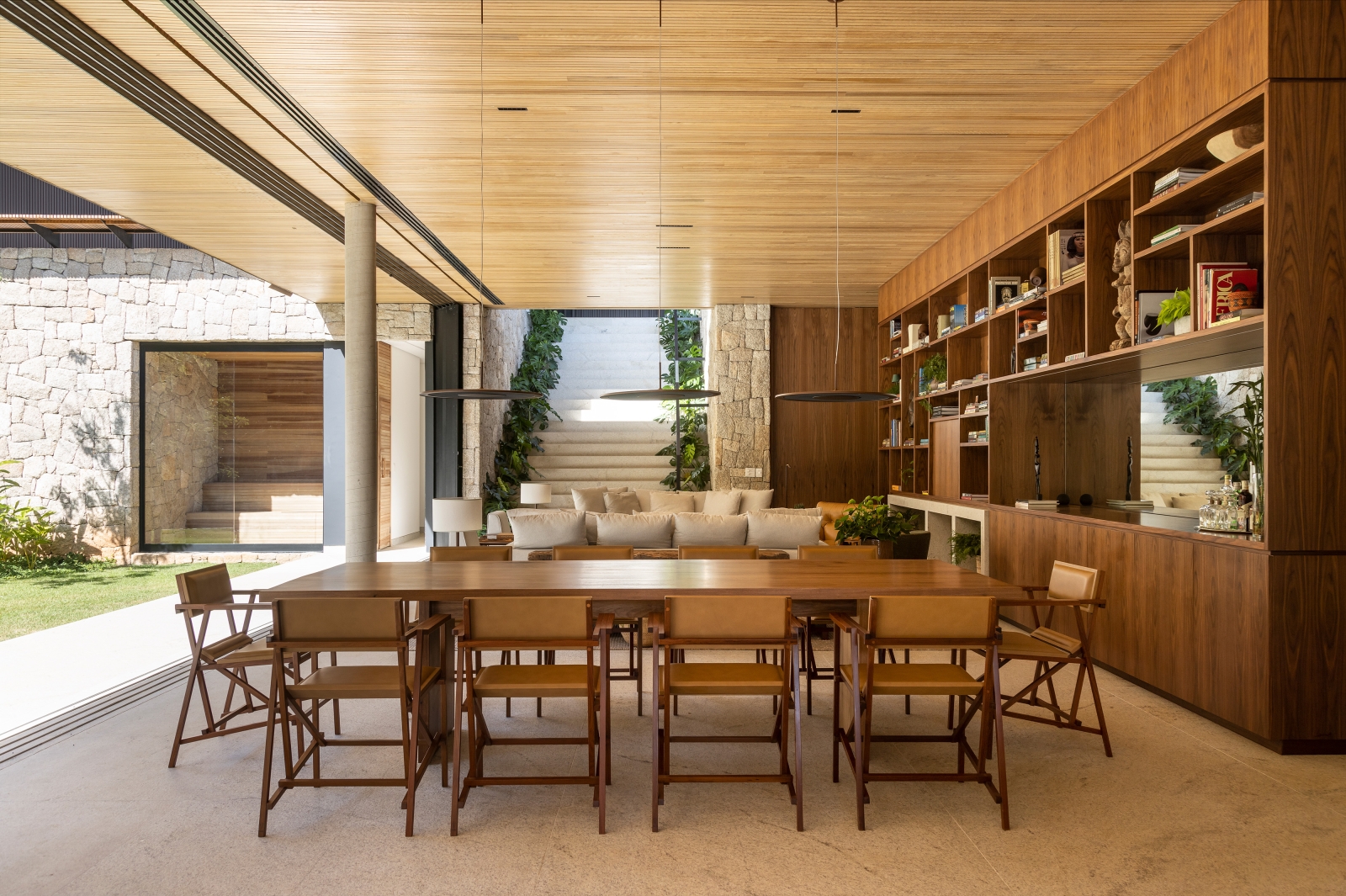 The LS Residence stands out for its masterful adaptation to a sloping terrain. The initial impression reveals a single-story house, but upon entering, it unveils itself in two levels: the private area on the upper level and the social area below, integrated with the leisure area. An L-shaped floor plan organizes the spaces, providing a functional and dynamic distribution.