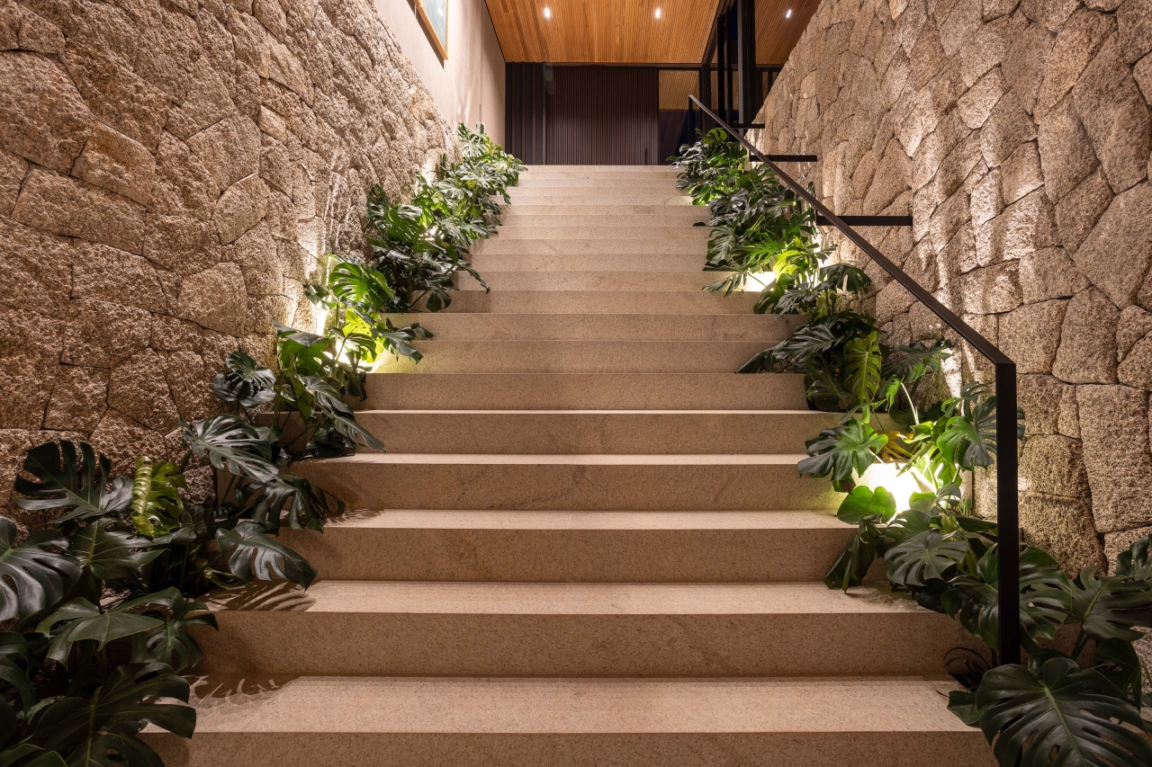 The house's social area, connects to the street via a staircase and leads to a leisure area with a pool. This design creates a smooth transition between indoor and outdoor spaces, offering a harmonious experience.