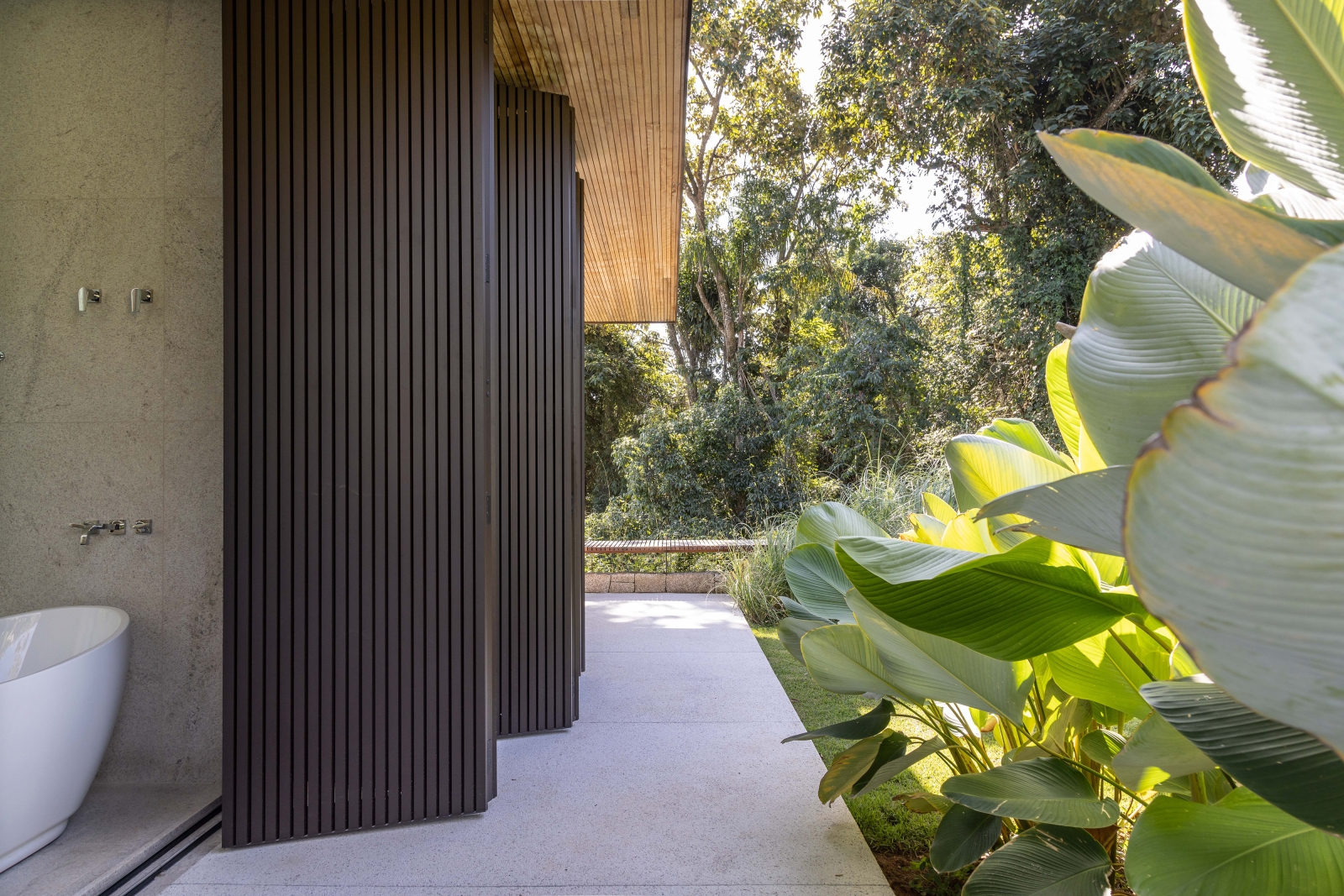 The facade, covered with dark-toned slatted panels, creates a harmonious play of solids and voids, dynamically interacting with the passage of light. The entrance, highlighted by a pivot opening, leads to a glass block that shapes the foyer, offering a sensory experience from the moment of entry. Materials such as stone, wood, and slatted panels intertwine with landscaping, merging with the surrounding vegetation. Within the longitudinal volume, openings in the private area facing the leisure area add movement to the internal facade, providing panoramic views when open or ensuring privacy when closed.