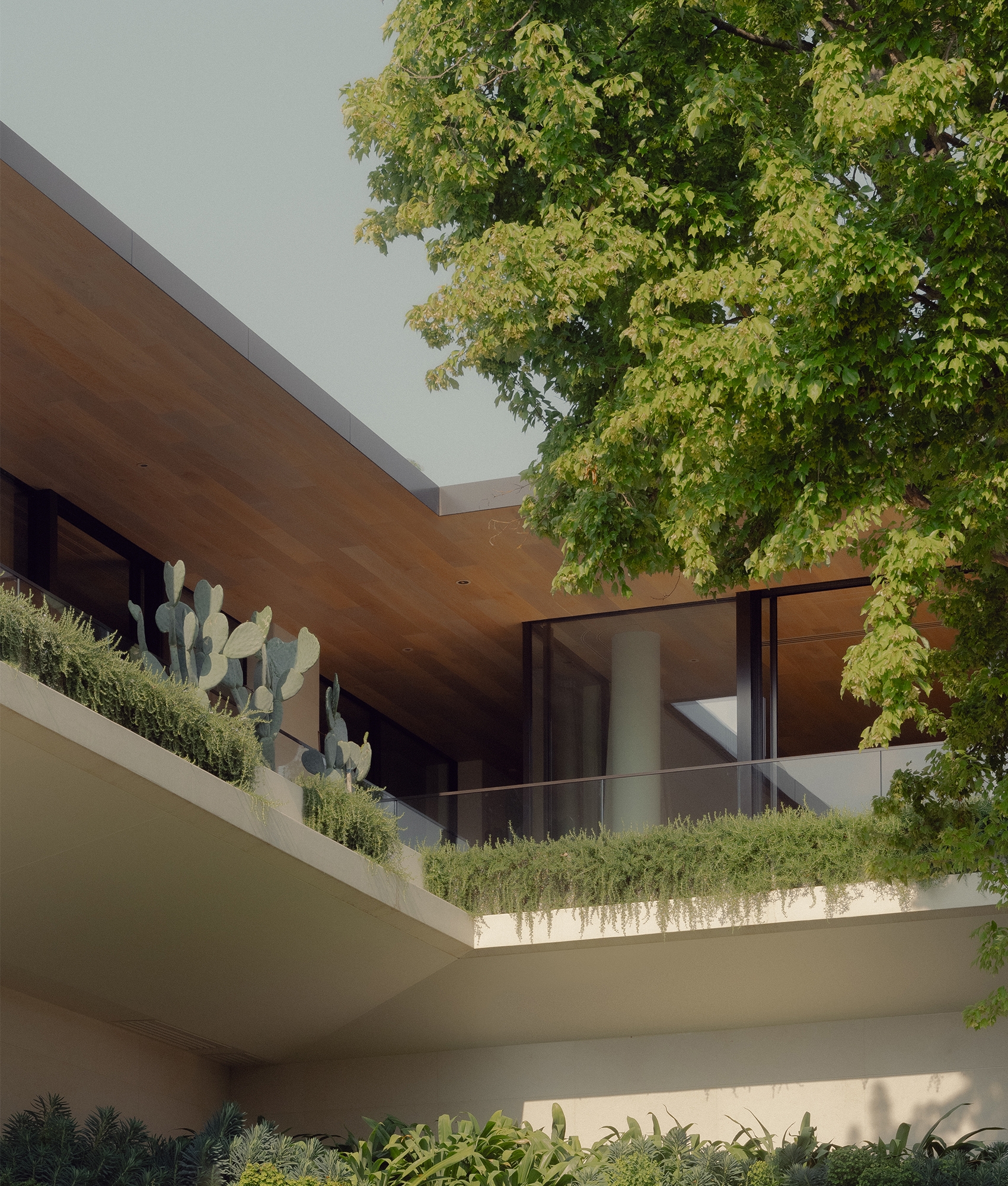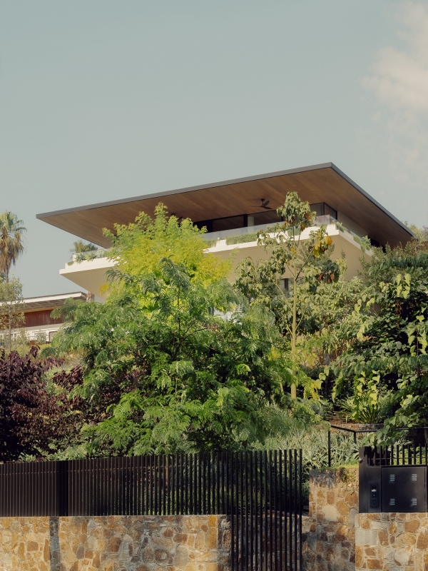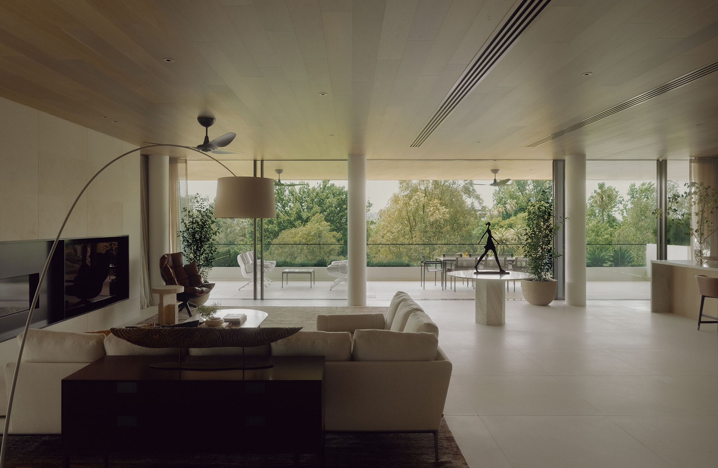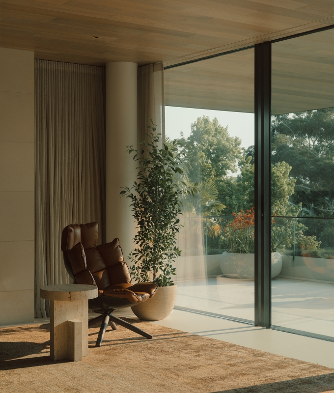 The floorplan captures garden outlooks, framed by expansive glazing. As well as seamless indoor-outdoor living, allowing the residents to step outside and entertain on the terrace, the heroic cantilevered space doubles as a shading device in hot months by creating a cooler outdoor area underneath.