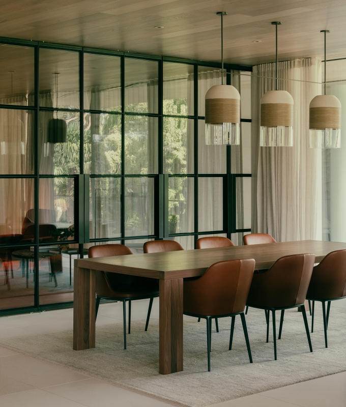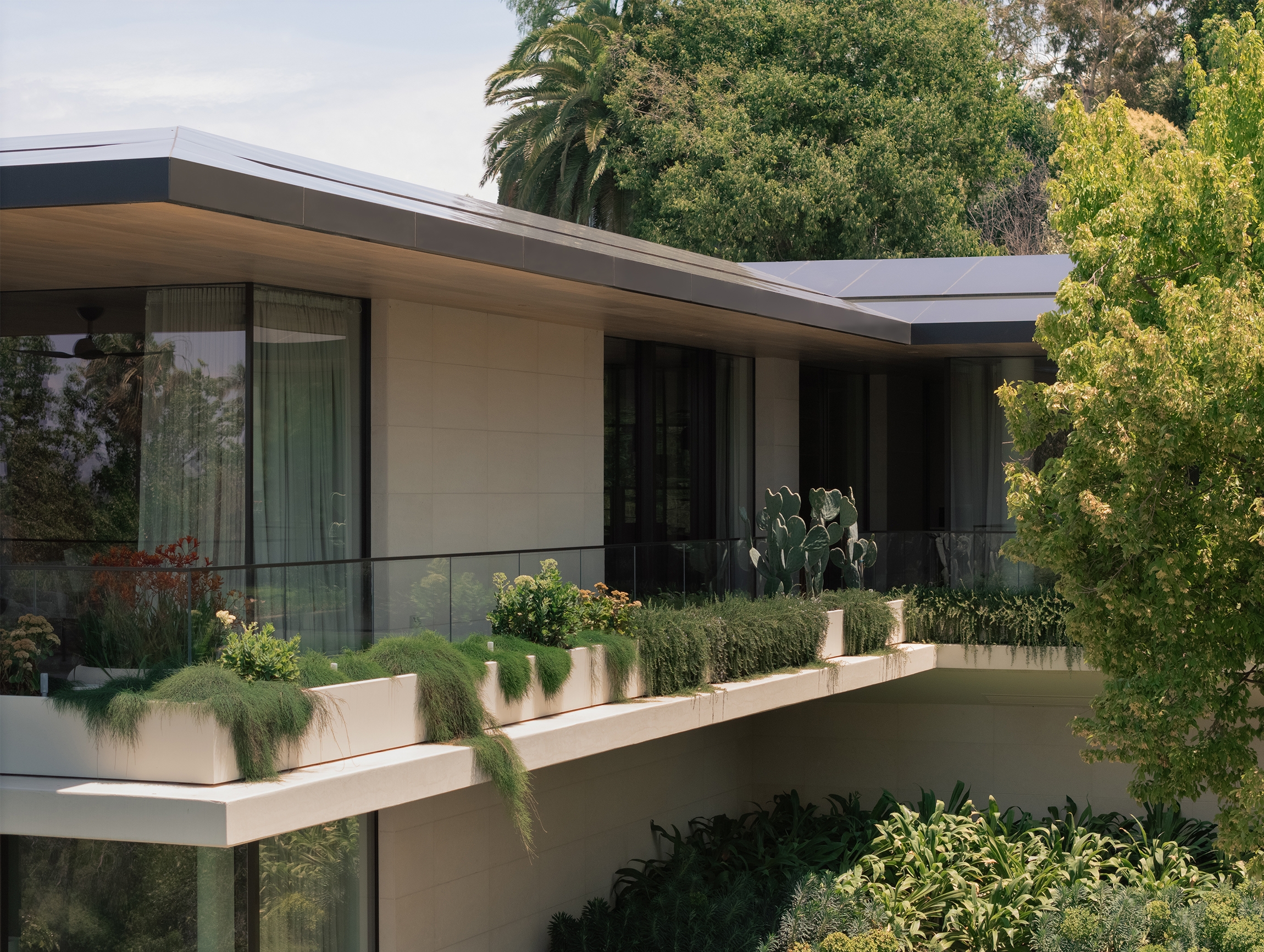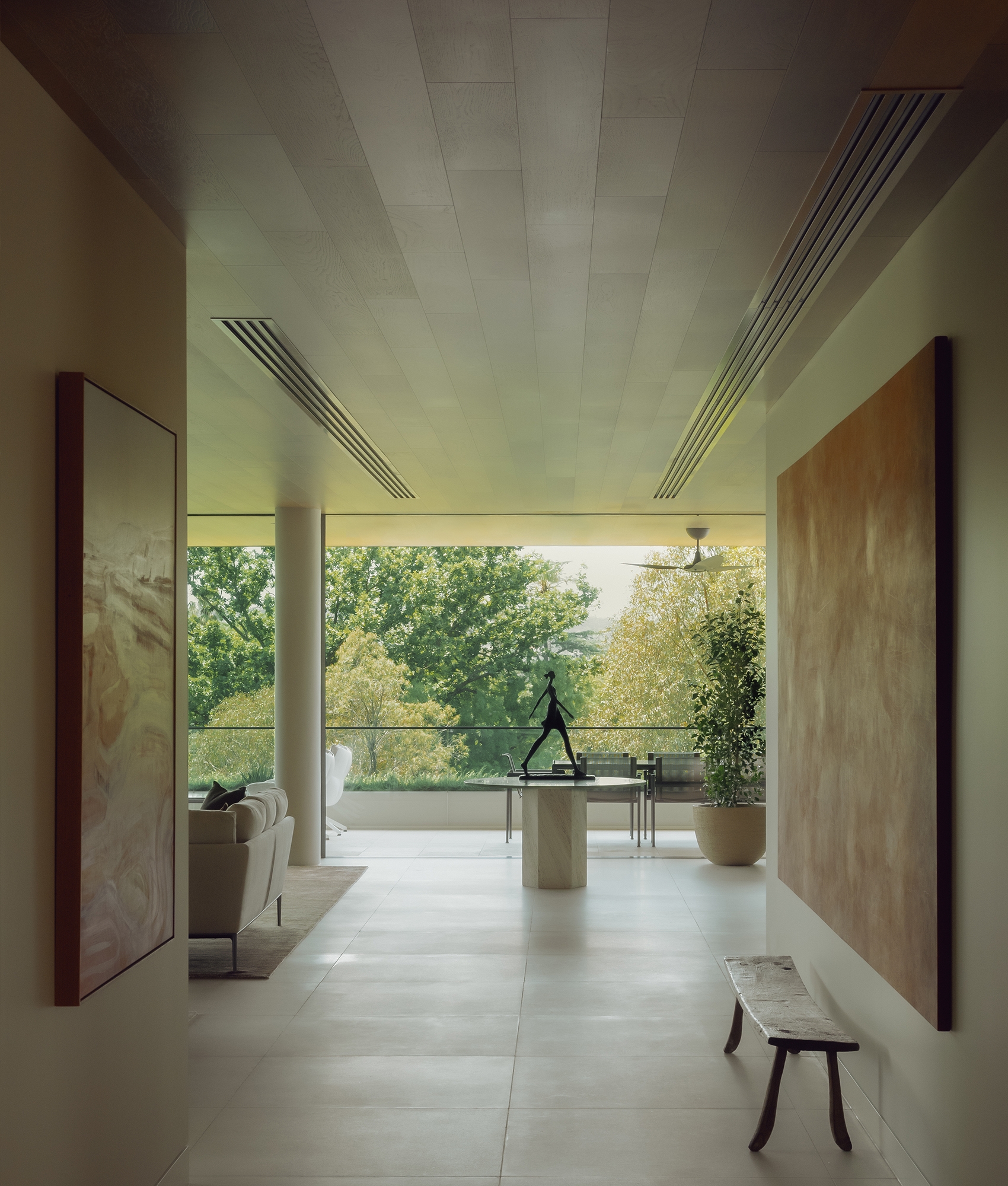 The floorplan captures garden outlooks, framed by expansive glazing. As well as seamless indoor-outdoor living, allowing the residents to step outside and entertain on the terrace, the heroic cantilevered space doubles as a shading device in hot months by creating a cooler outdoor area underneath.
