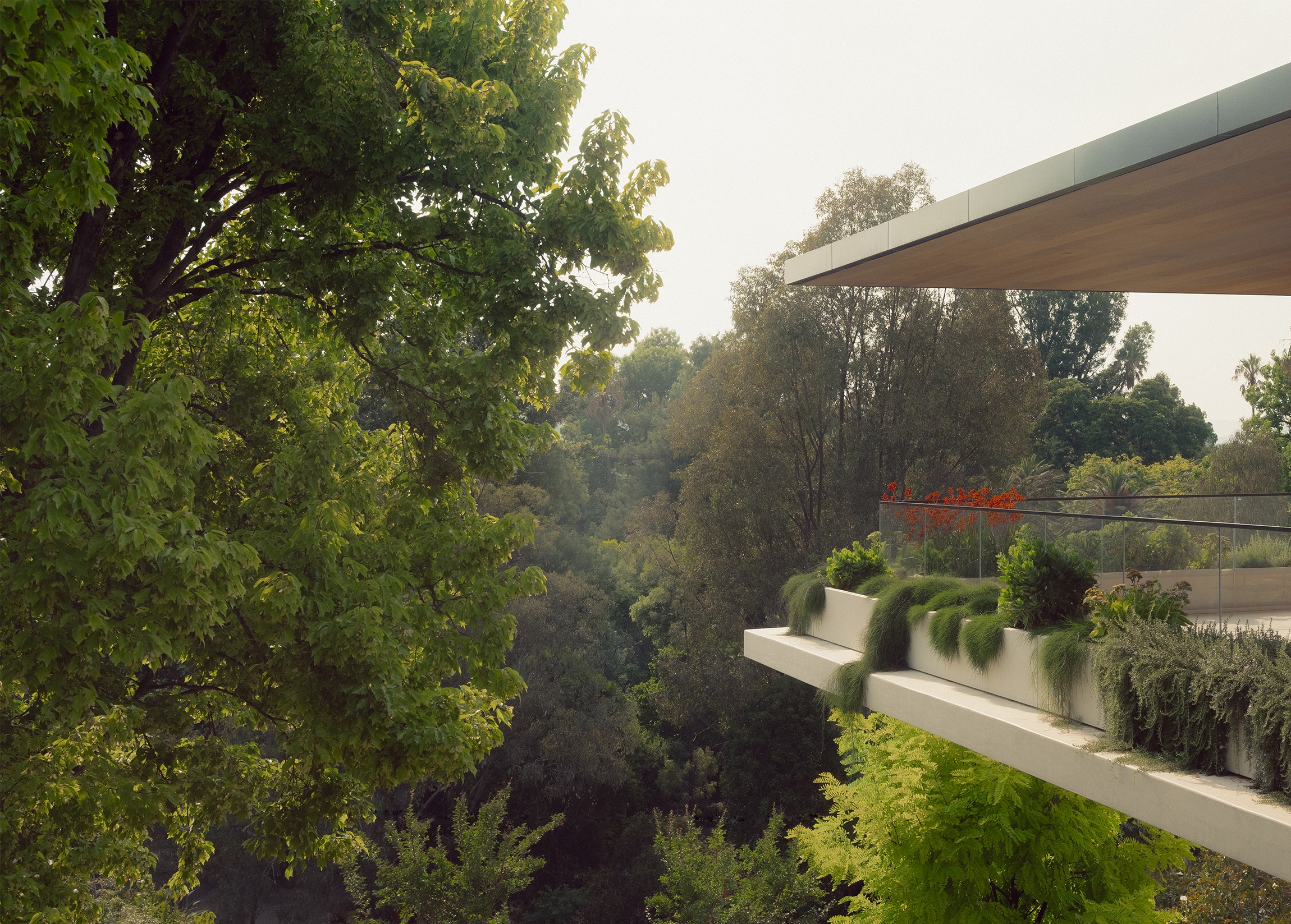 In some ways, the home presents as simple and even modest. A monolithic concrete soffit to the first floor with chamfer cements the form in the landscape and creates the illusion of floating. The expansive terrace cantilevers significantly create a feeling of floating in a forest.