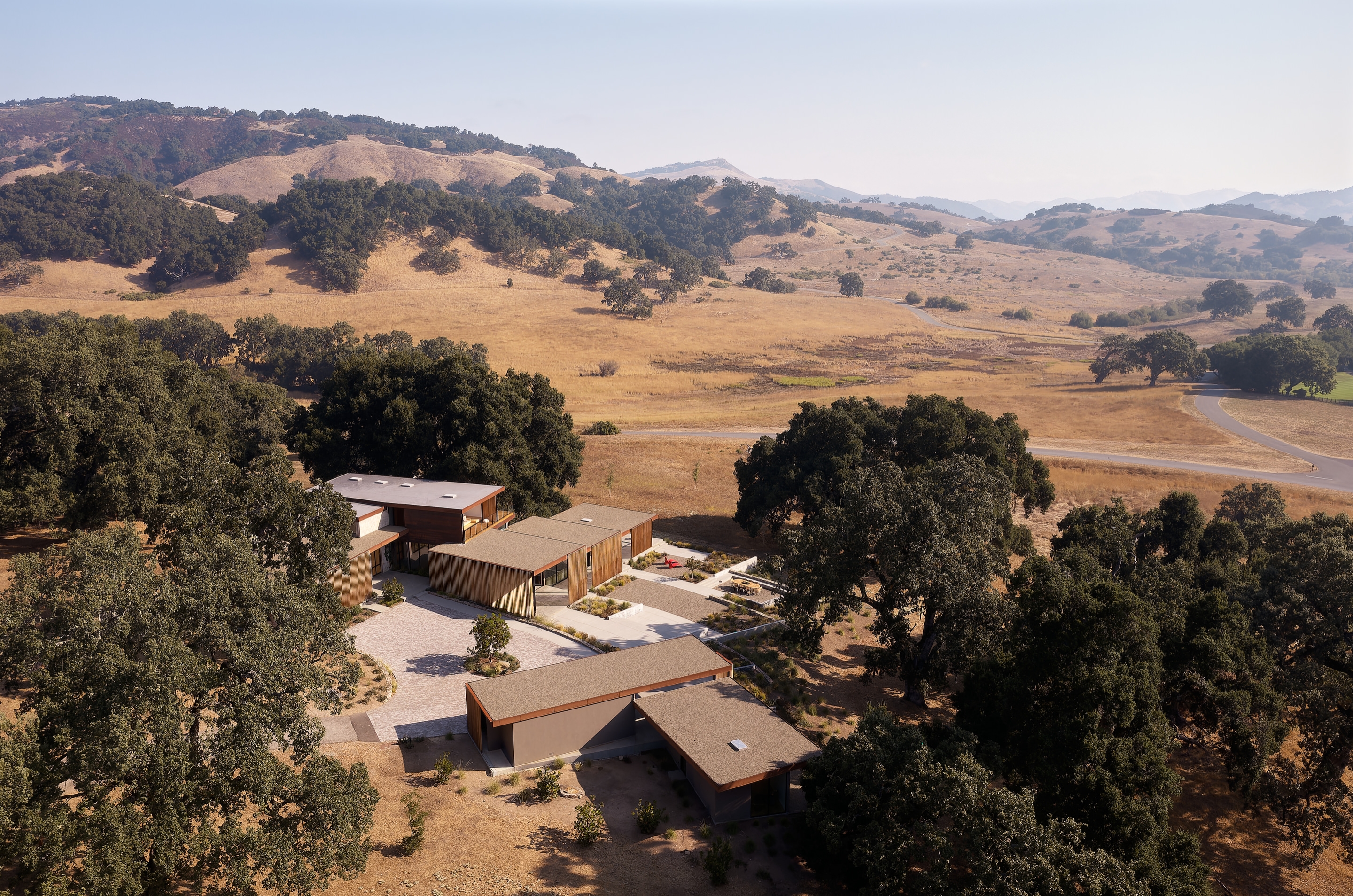 A compound for a multigenerational family, integrated into the landscape. The design process was monitored through five hearings with the Design Review Board, with adherence to the land development and design guidelines verified at every step.