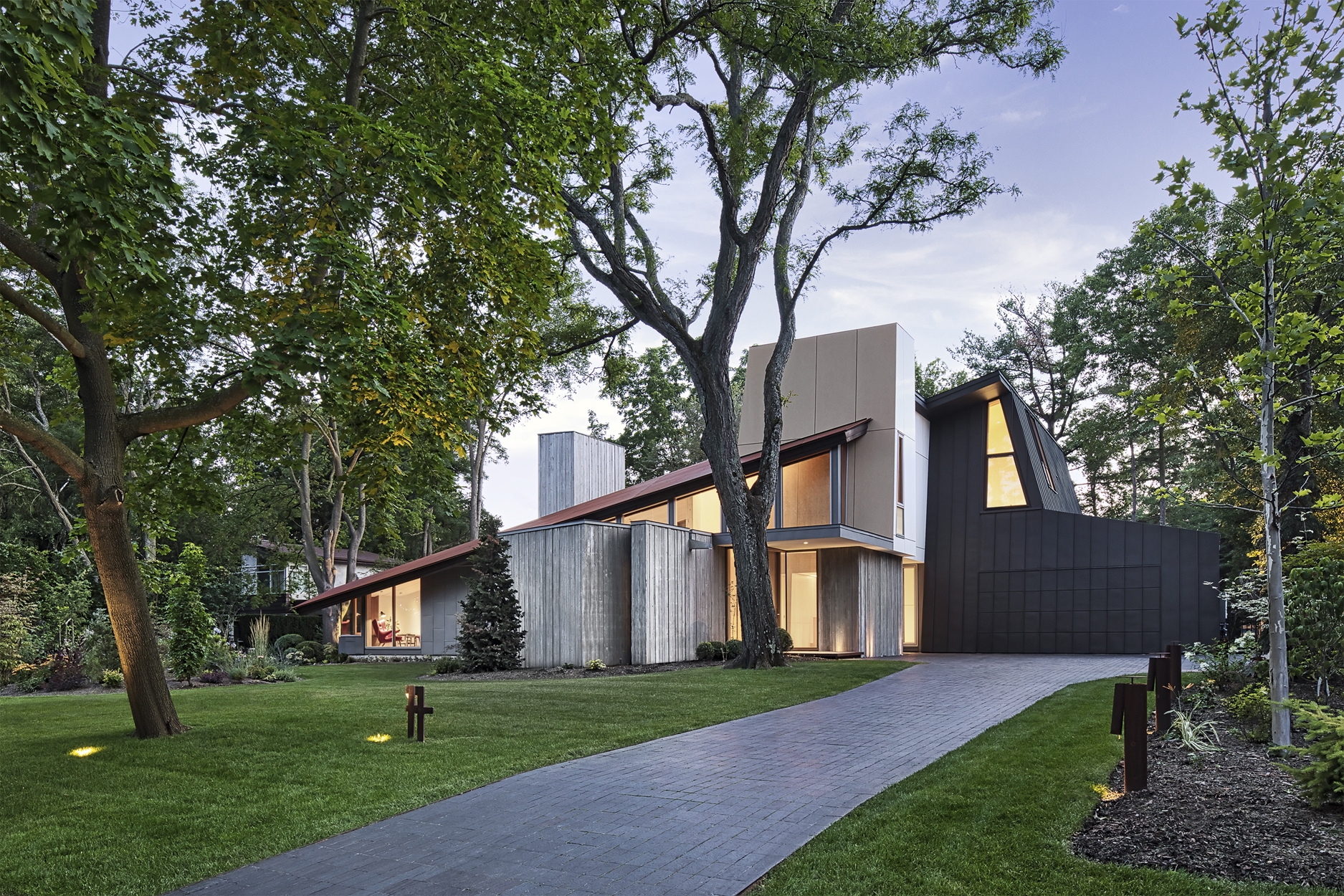 The clients sought a connected design to provide a “cottage in city”. Not a faux expression of a leisure cabin, rather a retreat in a conceptual manner: a feeling of warmth, reflection & family. Dove is conceived as a series of interconnected pavilions, like tents in its landscape.Each holds a destination while offering a multitude of egresses. Moving through the project is envisioned as a walk-through Ontario woods— gently up over logs, with low canopies dramatically sweeping to towering heights,squeezing through rock canyons, passing water streams- all sunlit from unexpected places.