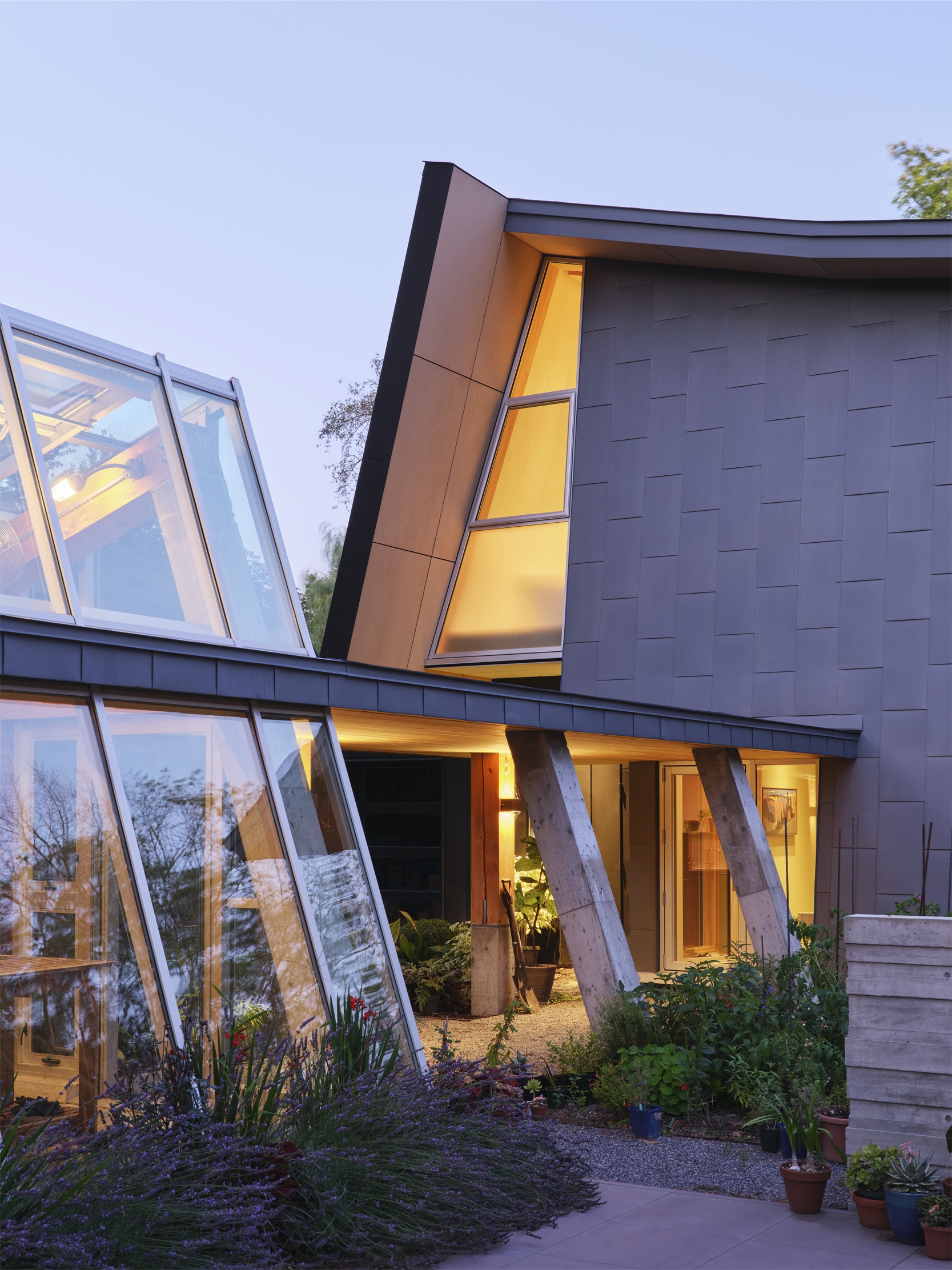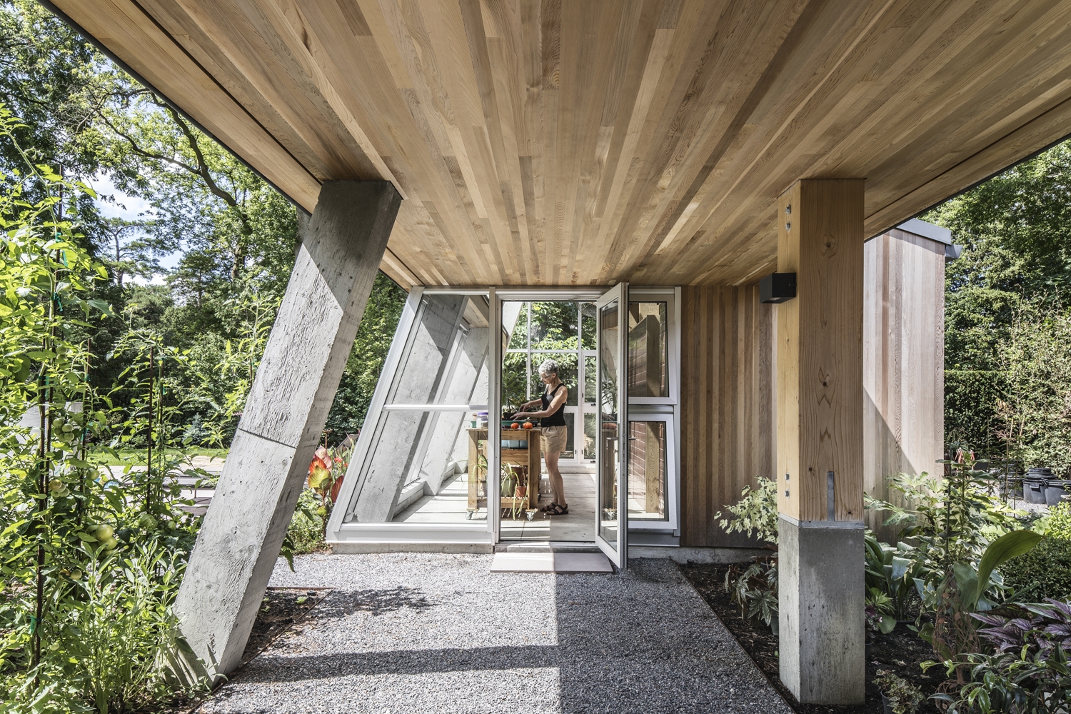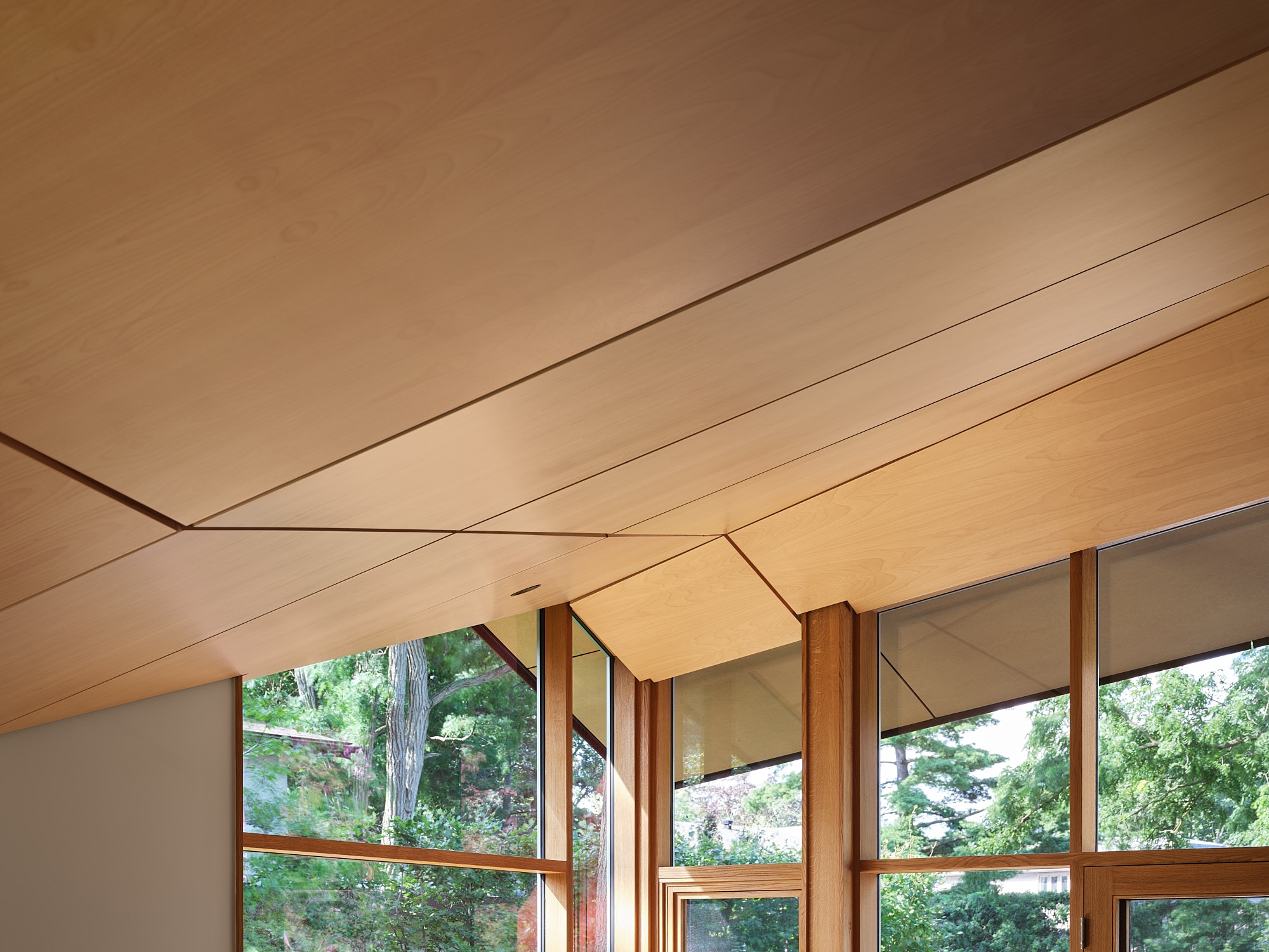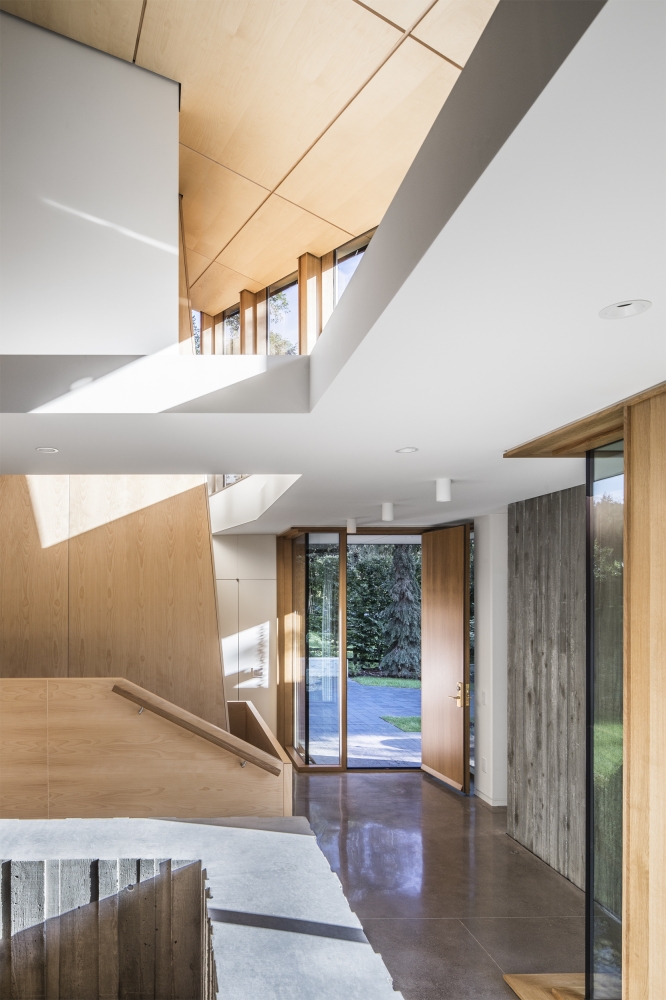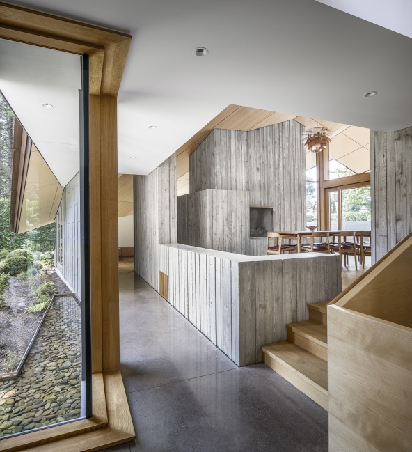 The deeply ridged cast-in-place concrete serves as both structural support and the finished texture within.The surface of the concrete holds memory of the rough wood boards used to form it & mirrors the richness of surrounding ravine lands. The folded roof, dressed in birch on the underside & weathering steel on its exterior skin, rises gently through the spaces cradling the interior like a canopy.