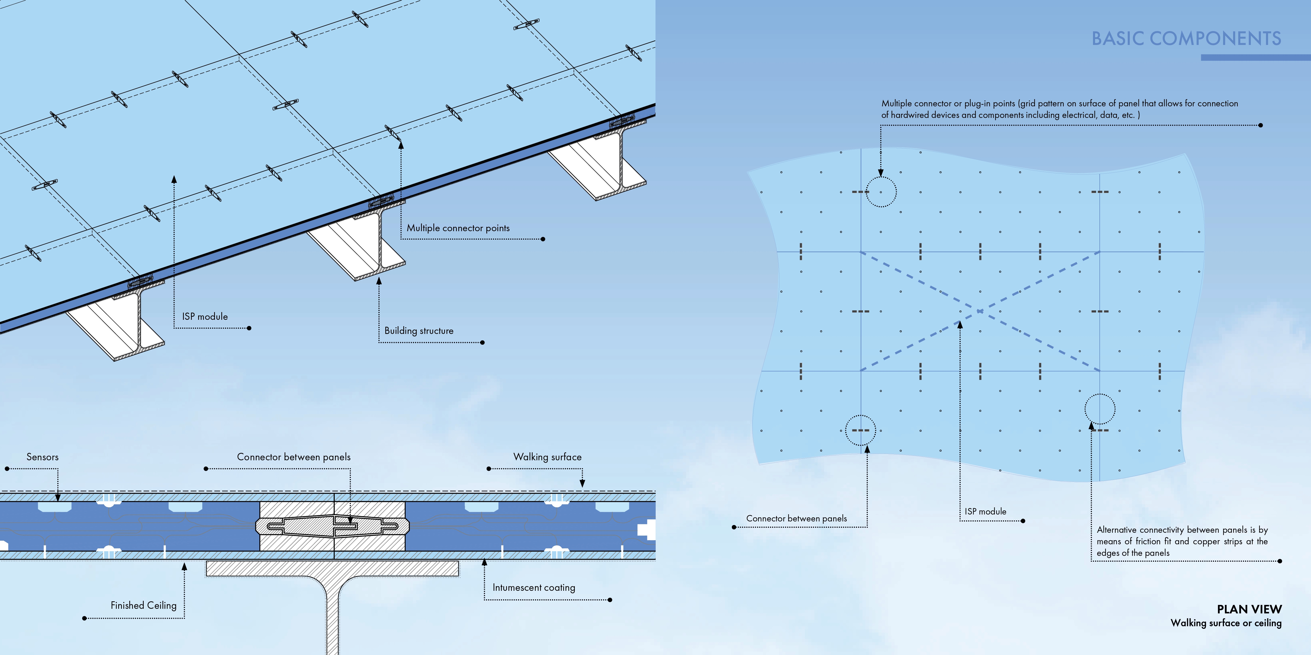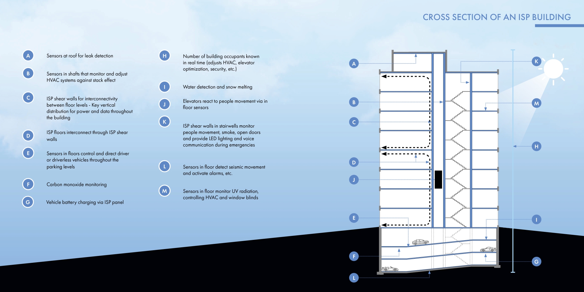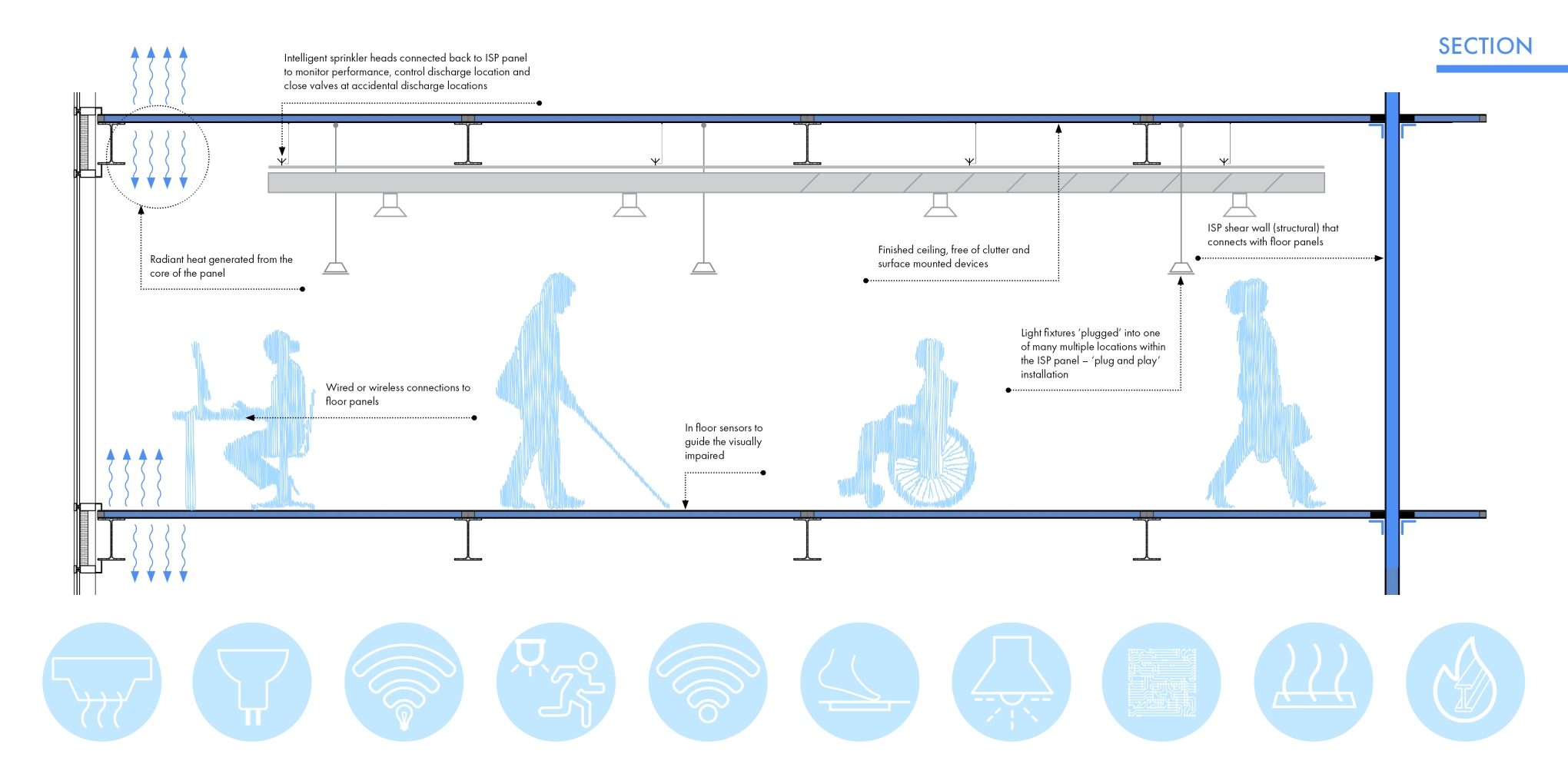 Intelligent Structural Panel (ISP) is a concept idea that combines two very different components – sandwich plate system and the ‘Internet of Things’. These two components result in an intelligent building system that can be used for floors and walls in lieu of traditional structural elements such as reinforced concrete or steel decking – but with the added benefit of containing the buildings intelligent infrastructure. The vision for the Intelligent Structural Panel is quite simple: take all the components and processes that go into constructing a floor and shear wall in a building and combine it into one product – but with a ‘brain’. The ISP panel is fabricated off site with skilled labour, installed on site with a minimal workforce and is 100% complete once its ‘plugged’ in. Many of the components that are traditionally installed after the structure is in place (i.e. mechanical, electrical, IT, etc.) are now integrated as part of the ISP panel.
