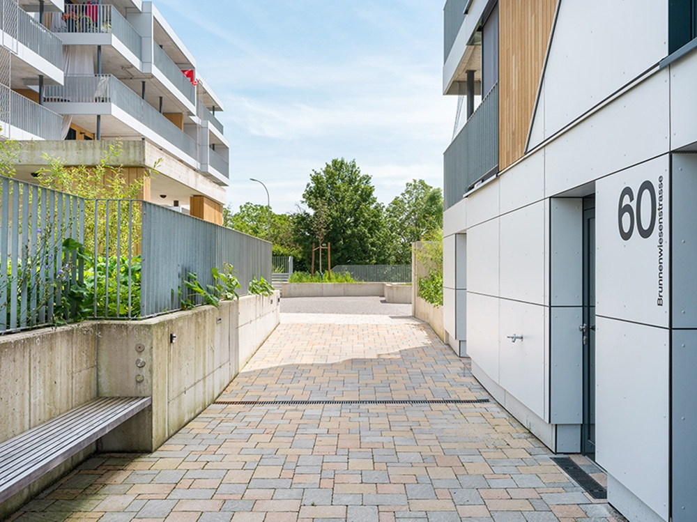 The initial phase focuses on fully renovating 1950s buildings on Brunnenwiesenstrasse, emphasizing asset appreciation and local business support. A circular approach to building materials prioritizes reusing the structural framework and utilizing regional materials to understand their value chains.